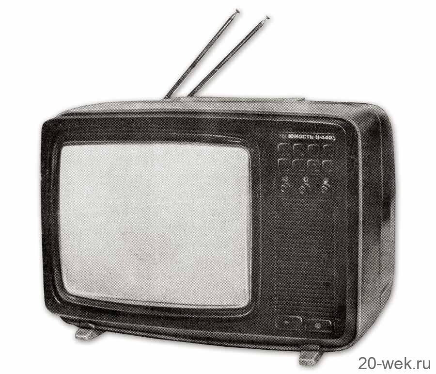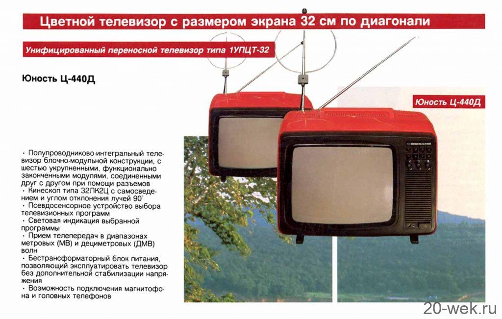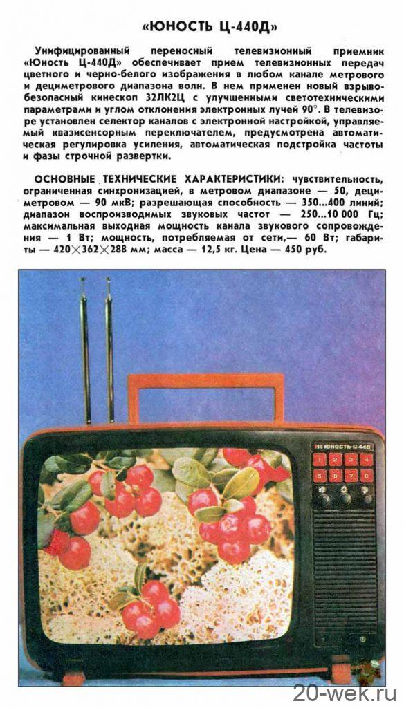 Телевизионный приёмник цветного изображения *Юность Ц-440/Д* с начала 1985 года выпускал Московский радиотехнический завод. Цветной унифицированный полупроводниково-интегральный переносной телевизор **Юность Ц-440/Д** обеспечивает приём передач цветного и чёрно-белого изображения на любом канале МВ и ДМВ диапазона (модель с индексом **Д**). В телевизоре применён взрывобезопасный кинескоп типа 32ЛК4Ц, с улучшенными световыми параметрами и углом отклонения лучей 90 градусов. Селектор каналов с электронной настройкой частоты и квазисенсорным восьмикнопочным переключателем. Телевизор имеет; АРУ, АПЧ и Ф, АПЧГ. Размер изображения 182х244 мм. Чувствительность в МВ и ДМВ диапазонах соответственно 50 и 90 мкВ. Чёткость по горизонтали 400 линий. Полоса воспроизводимых частот звука 250...10000 Гц. Потребляемая мощность 60 Вт. Номинальная выходная мощность канала звука 1 Вт. Габариты ТВ - 420х362х288 мм. Вес 12 кг. Цена 450 рублей.