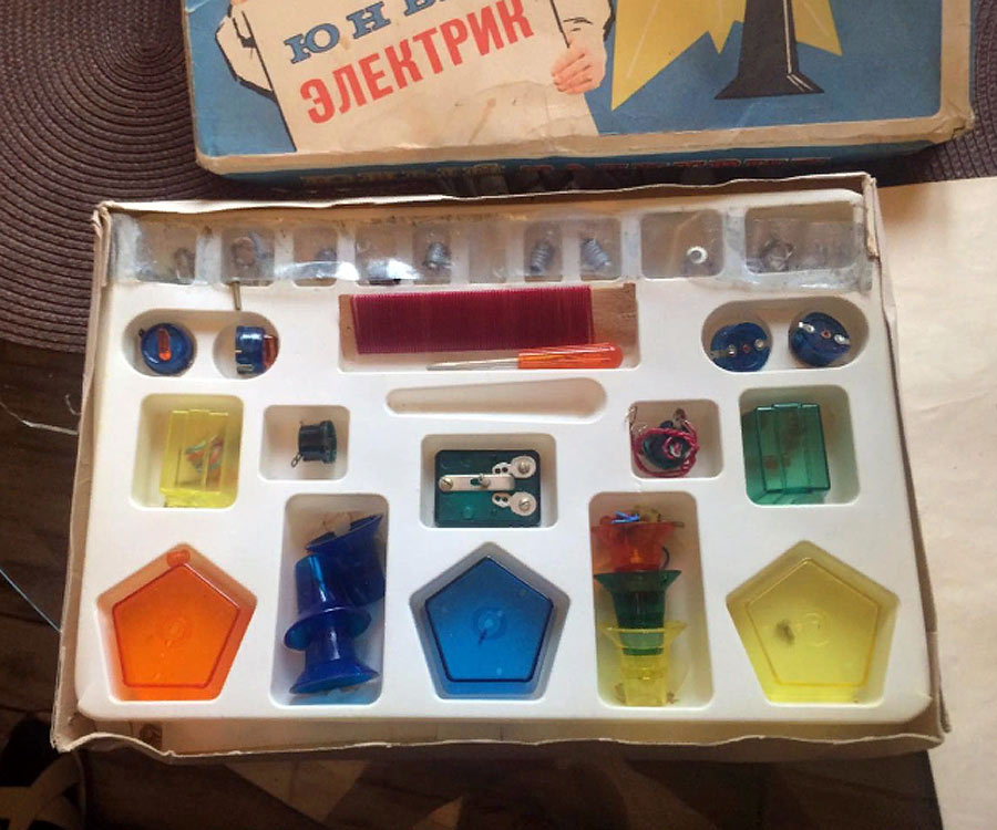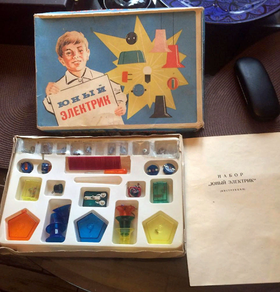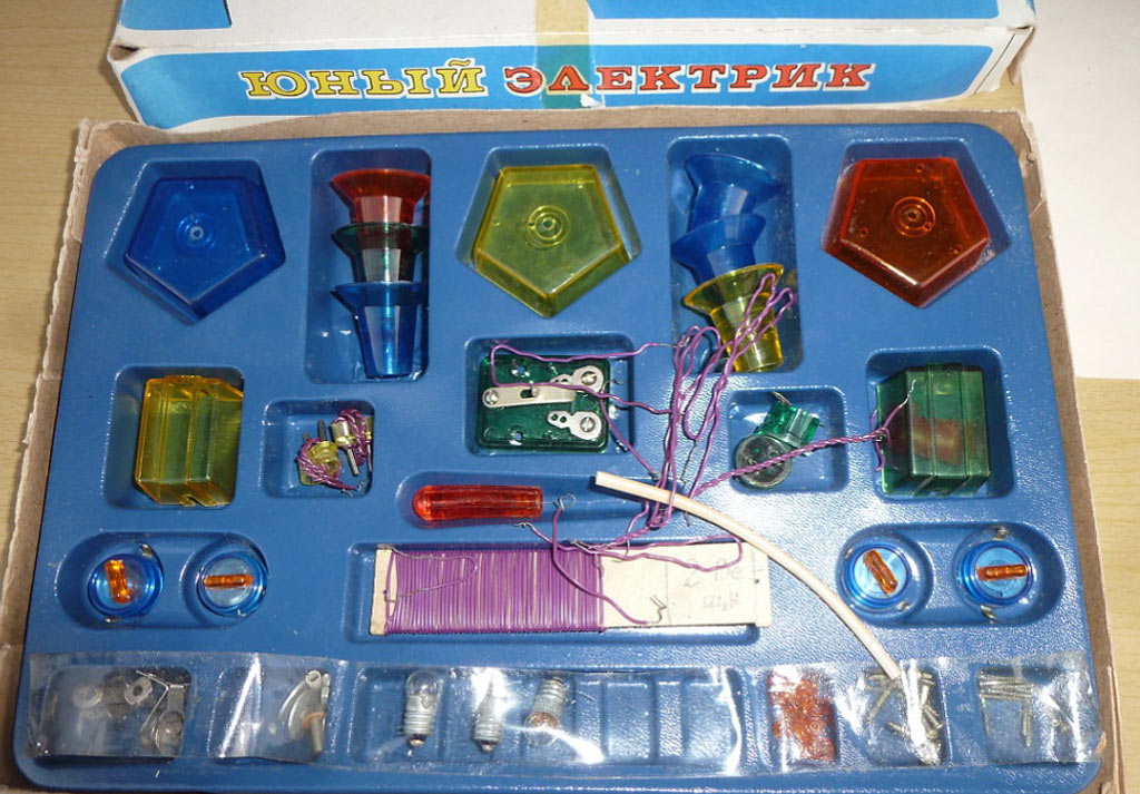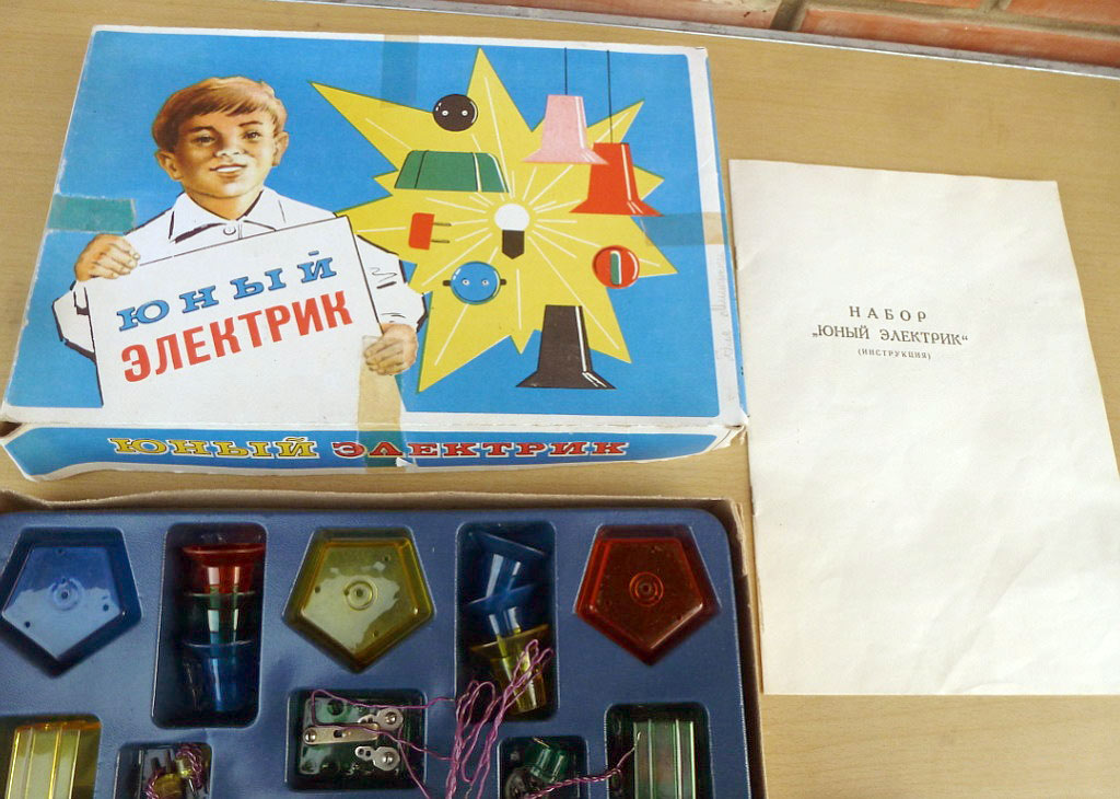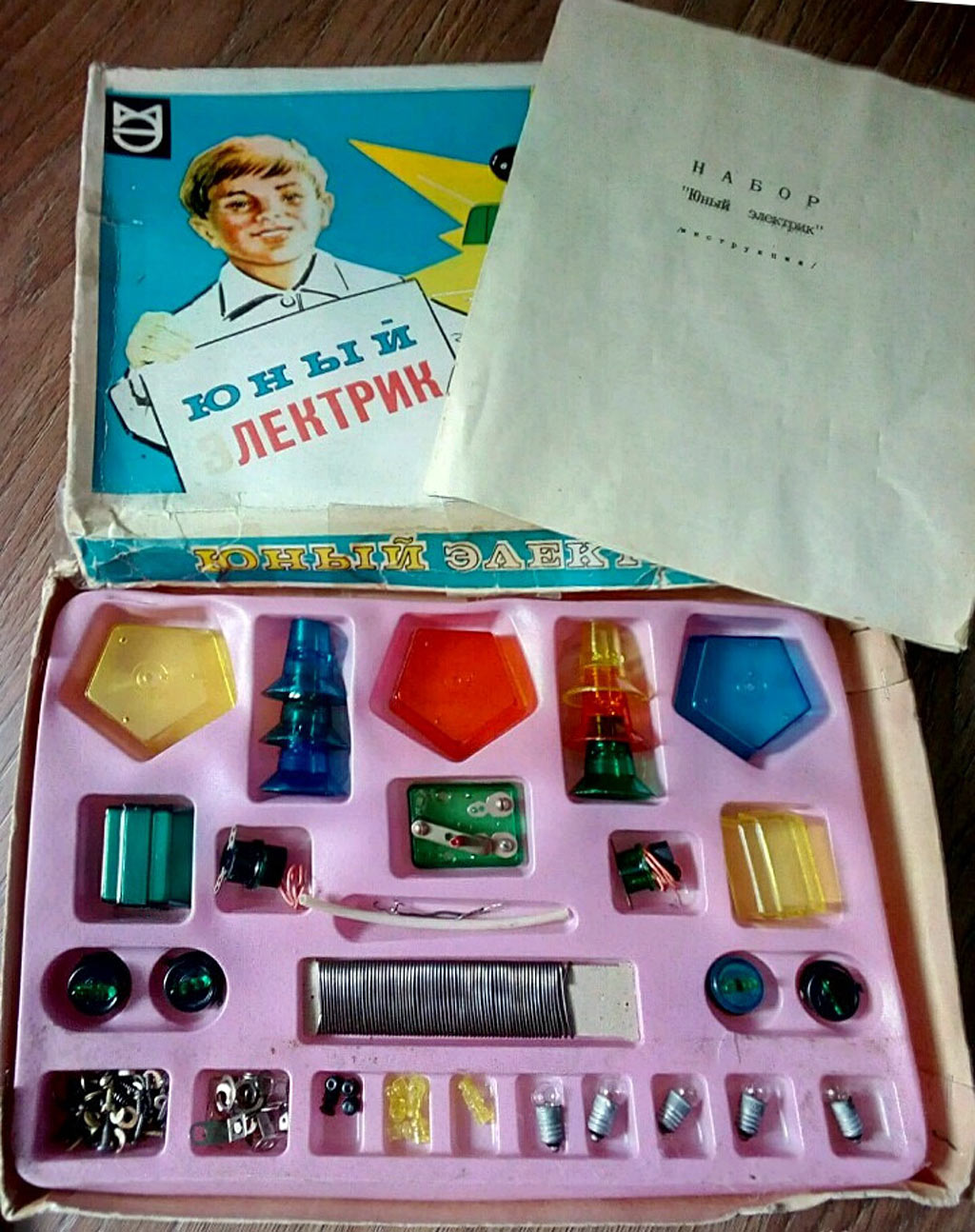 Набор *Юный электрик* выпускался с 1977 года Мытищинским электротехническим заводом. Предназначен для детей среднего школьного возраста.