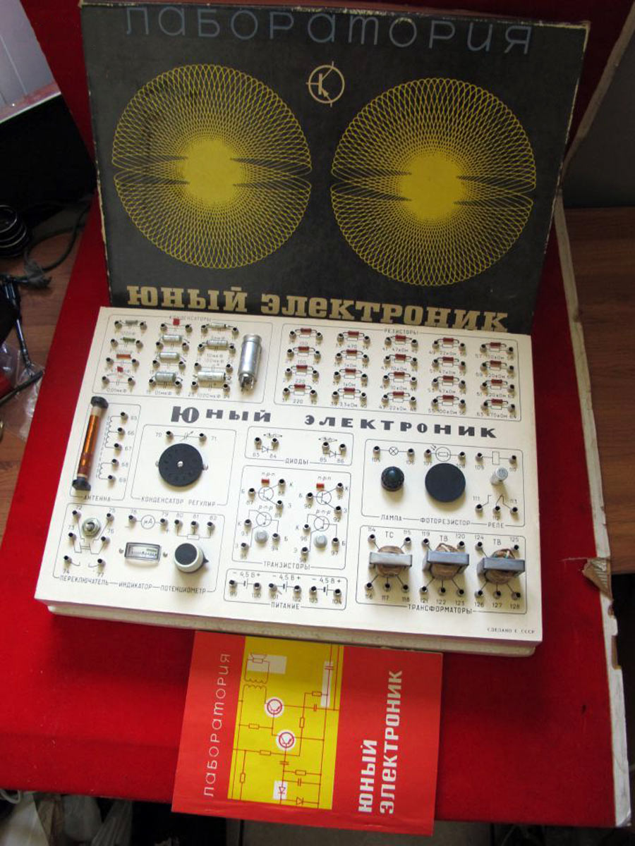 Радиоконструктор Детская лаборатория *Юный Электроник* выпускалась с 1977 года. Радиоконструктор *Юный Электроник* предназначен для детей школьного возраста от 7 до 16 лет, позволяя им ознакомиться с работой различных полупроводниковых схем, таких как усилители НЧ, радиоприёмные устройства, генераторы и многих других.