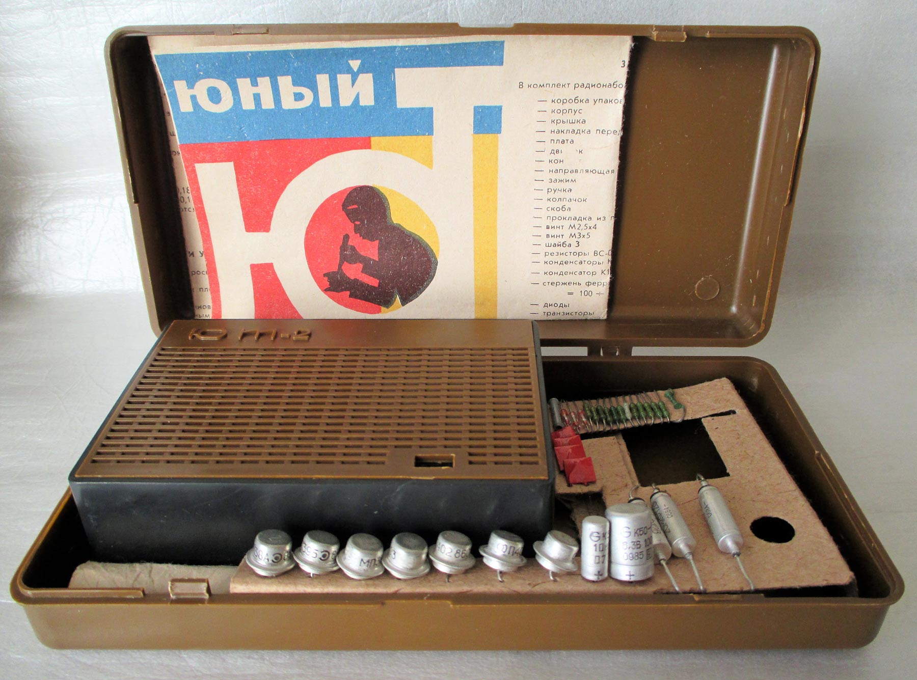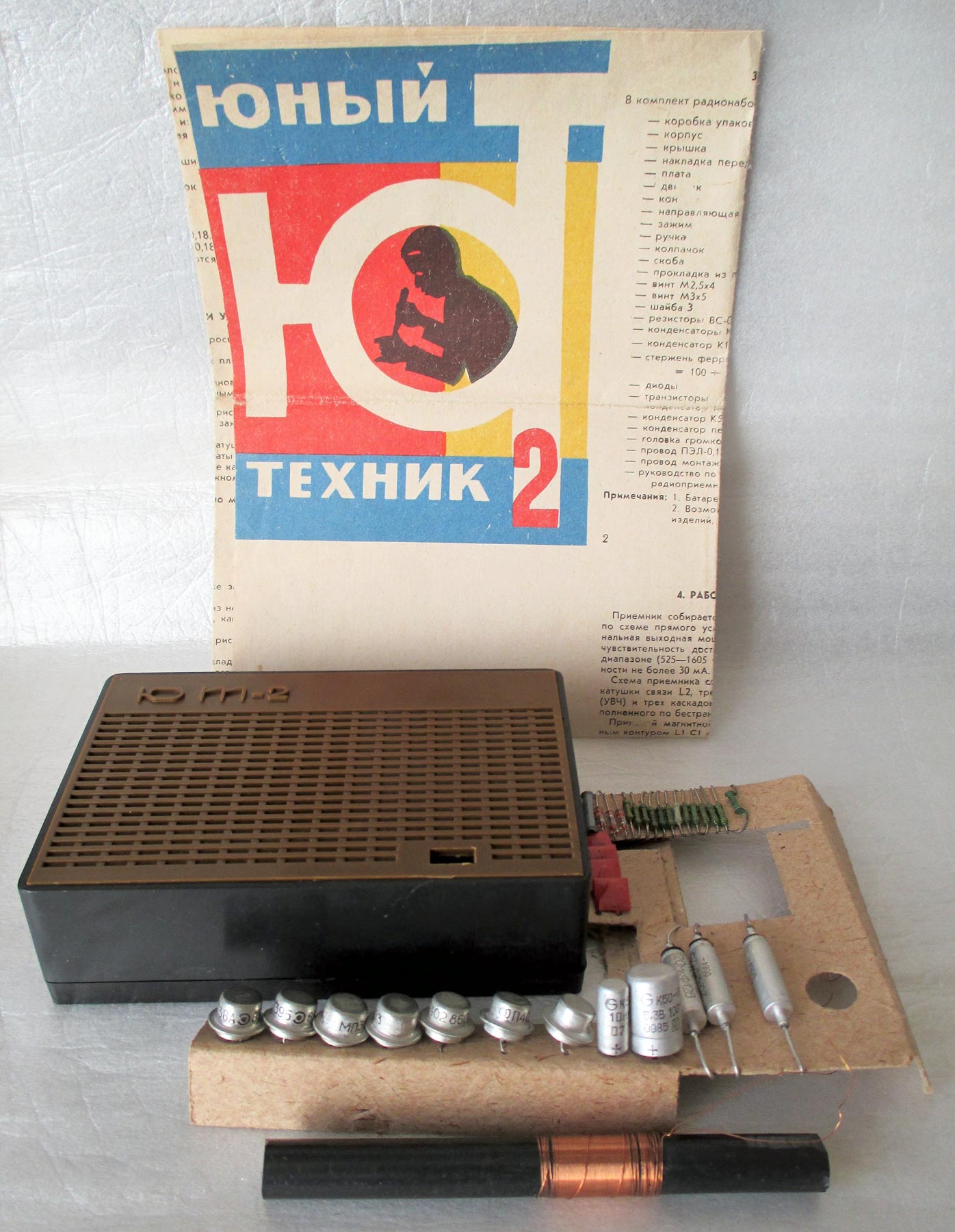 Радионабор *Юный Техник-2* (ЮТ-2) выпускался с 1986 года Грозненским радиозаводом. Радионабор представляет собой комплект основных узлов, деталей и радиоэлементов, дающих возможность собрать карманный радиоприёмник прямого усиления. Источником питания служит батарея «Крона», акустическим воспроизводителем - громкоговоритель типа 0,1 ГД-6. Приёмник собирается на 7-ми транзисторах и 3-х диодах по схеме прямого усиления. Номинальная выходная мощность радиоприёмника 60 мВт, а чувствительность вполне достаточна для работы в диапазоне средних волн (525-1605 кГц). Ток потребления при этой мощности ~ 30 мА. В наборе нет КПЕ С1, потеряли или изначально не было. Аналогичный корпус для сборки радиоприёмника выпускался с 1963 года, возможно так же Грозненским радиозаводом, но назывался он *ЮТ*.