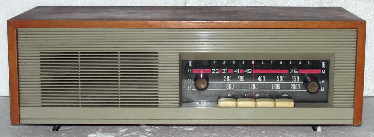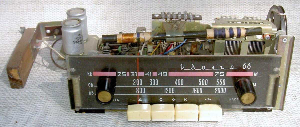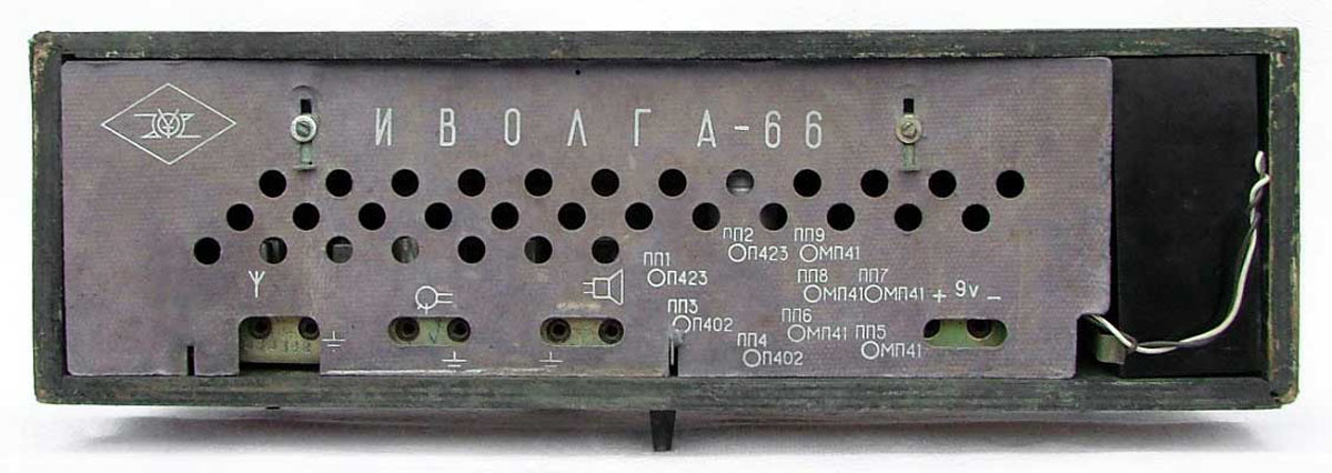Стационарный транзисторный радиоприёмник *Иволга-66* с I-кв 1966 года выпускал Минский радиозавод. Радиоприёмник третьего класса **Иволга-66** - это один из самых малогабаритных настольных радиоприёмников для своего времени с диапазонами ДВ, СВ и обзорным КВ: 24...75 м. В приёмнике имеется вход для адаптера электропроигрывателя и выход для выносного громкоговорителя. Питание приёмника осуществляется от шести батарей 373 или четырёх батарей КБС-Л-0,5 или сетевой приставки ВП-65. Диапазоны: ДВ 2000...735,3 м. СВ 571,4...186,9 м. КВ 75,9...24,8 м. Чувствительность на магнитную антенну в диапазоне ДВ - 2,0, СВ - 1,0 мв/м. Чувствительность на наружную антенну в диапазоне КВ 150 мкв. Селективность 26 дб. Полоса воспроизводимых частот - 150...3500 гц. Габариты приёмника 345х170х190 мм. Вес с батареями 4,0 кг. Цена радиоприёмника с комплектом питания из шести элементов типа 373 - 50 рублей 34 копейки. Радиоприёмник **Иволга-66** выпускался с 1966 по 1969 год включ. и был достаточно популярным.