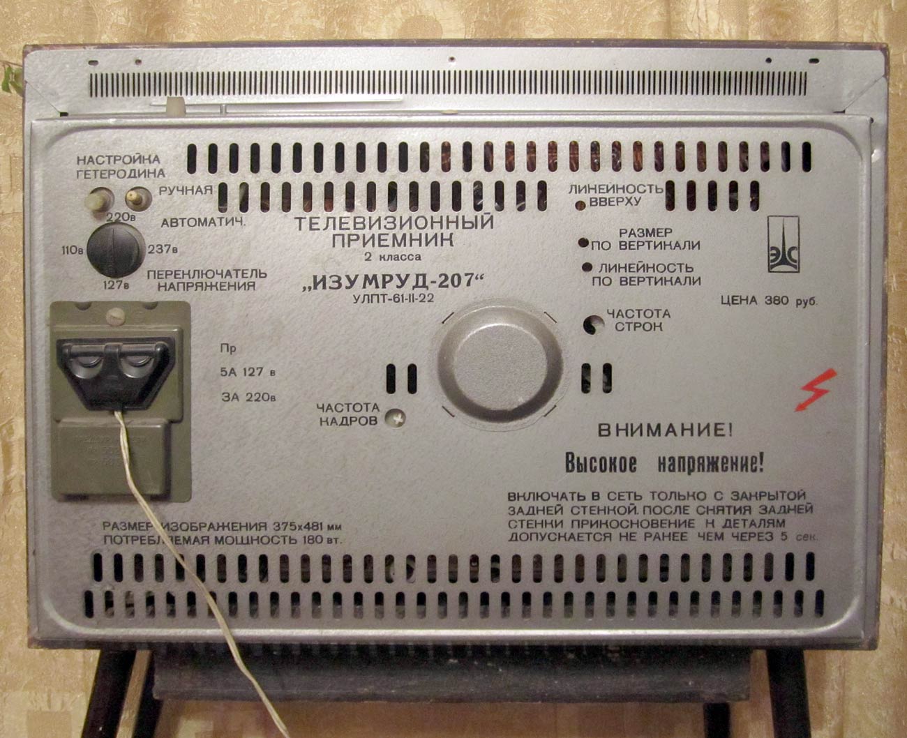Телевизионный приёмник чёрно-белого изображения *Изумруд-207* с 1972 года выпускал Новосибирский завод *Электросигнал*. Унифицированный телевизор 2-го класса **Изумруд-207** (УЛПТ-61-II-22) производился в настольном и напольном вариантах без блока ДМВ, с возможностью его установки. Футляр отделан ценными породами дерева и пластмассой. Телевизор работает на любом из 12 каналов. Органы управления расположены в верхней задней части футляра и справа на передней панели. Монтаж радиодеталей печатный. АС состоит из двух фронтальных громкоговорителей, расположенных в нижней части футляра. В телевизоре есть разъём для подключения головных телефонов, другой разъём служит для записи звука на магнитофон. Яркость и громкость на расстоянии до 5 метров можно регулировать с помощью проводного ПДУ. Автоматически регулируются АПЧГ, АПЧ и Ф блока строчной развертки, стабилизация размеров по вертикали и горизонтали. Все технические характеристики телевизора *Изумруд-207* аналогичны унифицированным телевизорам 2-го класса.