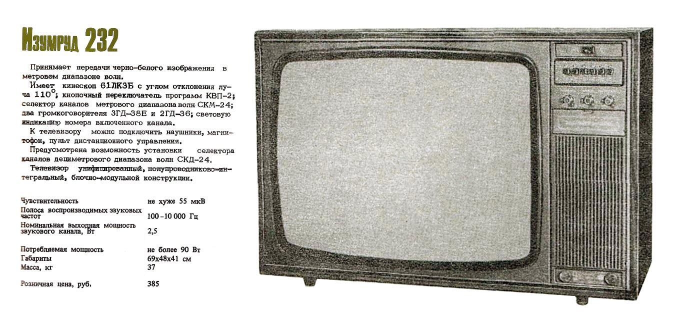 Унифицированный ч/б п/п телевизор *Изумруд-232* подготовлен к выпуску с 1985 года Новосибирским заводом *Электросигнал*.
