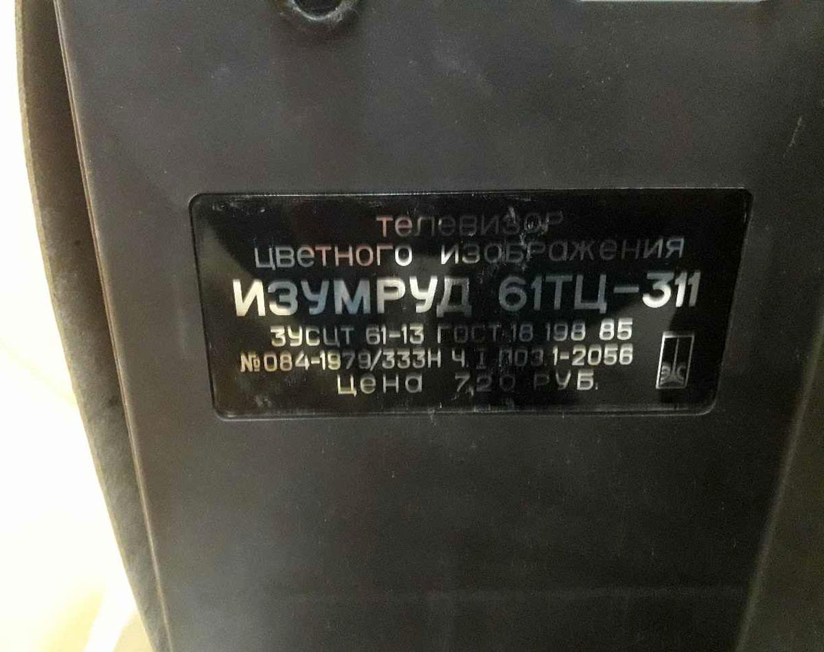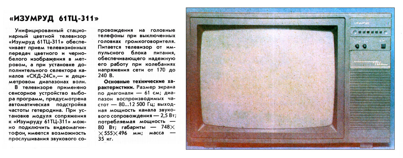 Телевизионный приёмник цветного изображения *Изумруд 61ТЦ-311* с I-кв 1990 года выпускал Новосибирский завод *Электросигнал*. Унифицированный стационарный цветной телевизор 3 класса **Изумруд 61ТЦ-311** обеспечивает приём цветного и ч/б изображения в МВ, а при установке селектора каналов *СКД-24С* и в ДМВ диапазонах. В модели применено сенсорное устройство выбора программ, системы АРУ, АПЧГ, АПЧ и Ф. При установке модуля сопряжения к телевизору можно подключить бытовой видеомагнитофон. Имеется возможность прослушивания звука на головные телефоны при выключенных громкоговорителях. Питание модели осуществляется от экономичного импульсного блока питания. Размер экрана по диагонали 61 см; диапазон воспроизводимых звуковых частот 80...12500 Гц; номинальная выходная мощность канала звука 2,5 Вт; потребляемая мощность 80 Вт; габариты модели 748 х 555 х 496 мм; масса 35 кг.