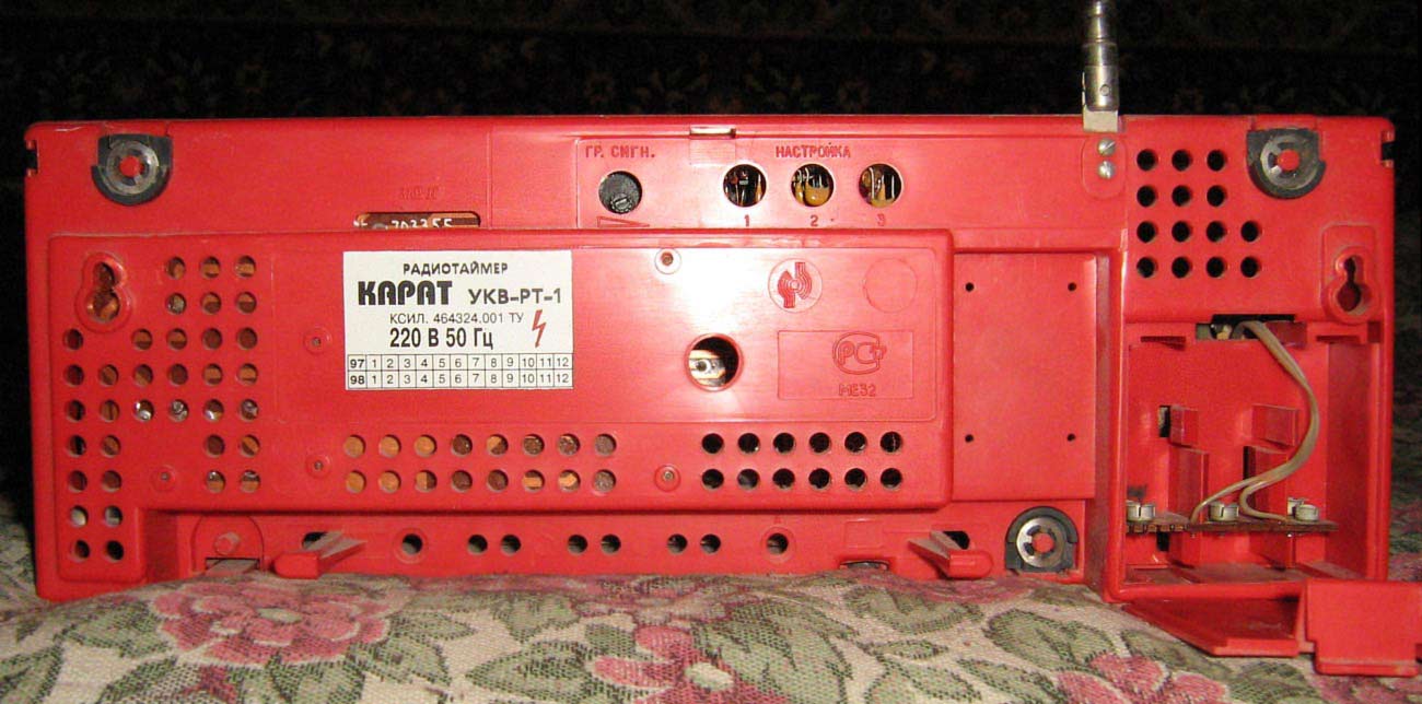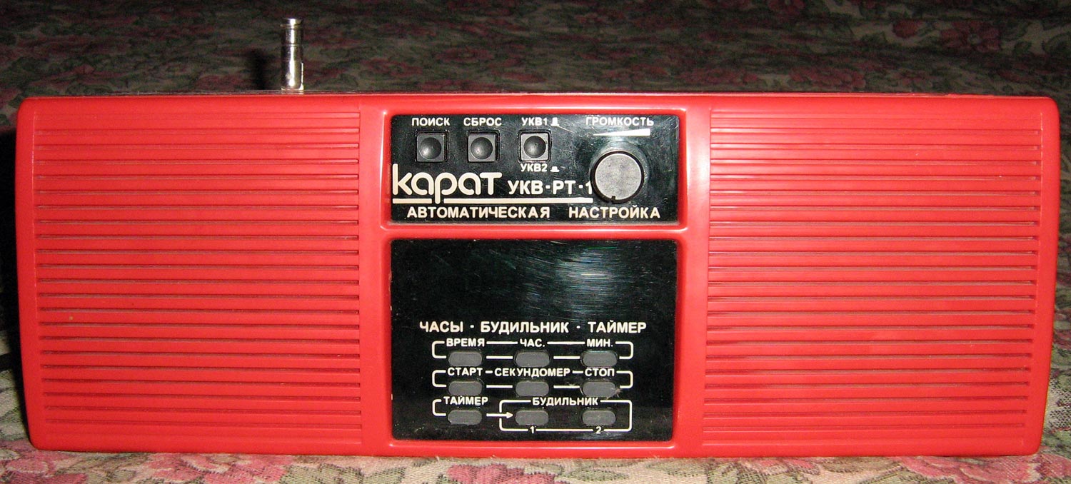 Стационарный транзисторный радиоприёмник *Карат УКВ РТ-1* с 1996 года выпускал Пензенский радиозавод. Радиотаймер **Карат УКВ РТ-1** предназначен для приёма радиовещательных станций работающих в диапазонах: ЧМ - 65,8...74,0 МГц (УКВ-1) и FM - 87,5...108,0 МГц (УКВ-2), а также включение и выключение радиоприёмника по встроенному таймеру. Таймер имеет функцию индикации текущего времени. Питание осуществляется от электросети 220 В. Диапазон звуковых частот воспроизводимых по звуковому давлению не уже 160...10000 Гц. Выходная номинальная мощность не менее 1 Вт. Потребляемая от сети мощность 10 Вт. Габариты радиотаймера 310х125х100 мм. Вес 1,8 кг. Антенна телескопическая. Питание для сохранения информации текущего времени при отключения сети осуществляется от батареи 9 В.