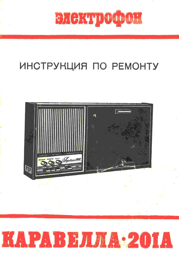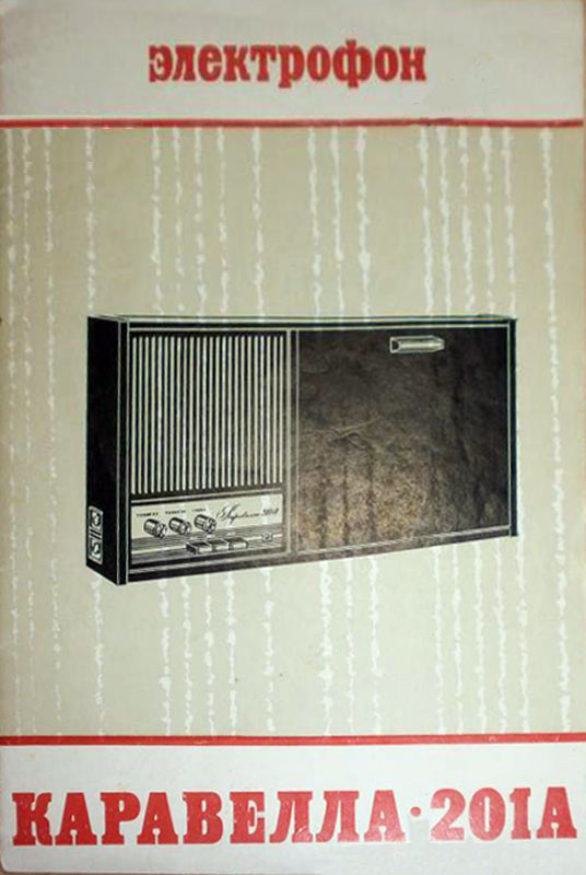 Электрофон сетевой транзисторный *Каравелла-201/А* с начала 1974 года выпускал Кировский завод *Ладога*. Электрофон **Каравелла-201** представляет собой модернизированный вариант электрофона **Каравелла**. Он рассчитан на воспроизведение грамзаписи с грампластинок всех форматов, а также имеет встроенный приёмник для приёма трёхпрограммного проводного радиовещания. По электрической схеме в тракте грамзаписи он аналогичен электрофону **Аккорд**, но здесь во входной цепи усилителя используется активный полосовой фильтр и III-ЭПУ-28 (позже III-ЭПУ-38М) вместо II-ЭПУ-76 установленного в модели **Аккорд-201**. Номинальная выходная мощность электрофона - 2 Вт, диапазон частот при воспроизведении грамзаписи 100...10000 Гц, при приёме радиотрансляции - 100...6000 Гц. Имеется регулировка тембра по НЧ и ВЧ. Размеры электрофона - 547х297х133 мм, вес - 10 кг. Электрофон **Каравелла-201А** не имеет трёхпрограммного приёмника. По внешнему оформлению и конструкции обе модели одинаковы. Цена ЭФ **Каравелла-201** - 80 или 78 рублей, **Каравелла-201А** - 66 рублей.