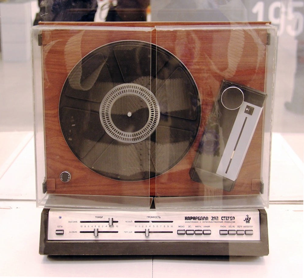 Электрофон сетевой транзисторный *Каравелла-203-стерео* с 1982 года выпускал Кировский завод *Ладога*. Электрофон предназначен для воспроизведения записи с моно и стереофонических пластинок. Особенность данного электрофона - вертикальное положение проигрываемой грампластинки. Всё это потребовало решения технических задач, связанных с устранением влияния дисбаланса грампластинки приводящего к изменению скорости воспроизведения, повышенными требованиями к тонарму звукоснимателя и узлу диска. Для ЭФ 2-й группы сложности оказались непригодны решения, допустимые по затратам для моделей высшей группы, поэтому нужные параметры были получены иначе - применением быстродействующей системы стабилизации частоты вращения диска и тангенциального тонарма оригинальной конструкции. От других электрофонов **Каравелла-203-стерео** отличается и рядом новых потребительских качеств. Так был использован непосредственный привод диска, от сверх-тихоходного асинхронного дугостаторного двигателя с электронной стабилизацией частоты вращения, применён звукосниматель на основе тангенциального тонарма и пьезокерамической головки типа ГЗК-208, предусмотрен стробоскоп со встроенной подсветкой и плавная регулировка частоты вращения диска, верньерное устройство ручного перемещения головки звукоснимателя с блокировкой перемещения рабочего положения, фиксатор для пластинки на оси диска ЭПУ, очиститель пластинки. ЭФ комплектуется двумя широкополосными АС фазоинверсного типа, НЧ тракт отличается низким уровнем нелинейных искажений. Электрофон имеет свойства для моделей второй группы сложности: Это раздельные регуляторы громкости, тембра по ВЧ и НЧ частотам звука, переключатели **моно и стерео**, входов и формата пластинок, устройство отключения автостопа. Частота вращения диска 33 и 45 об/мин. Коэффициент детонации 0,2%. Номинальная выходная мощность 2х3 Вт. Диапазон звуковых частот по напряжению 40...20000 Гц, по звуковому давлению 80...16000 Гц. Коэффициент гармоник 0,5%. Отношение сигнал/шум -63 дБ. Переходное затухание каналов -50 дБ. Габариты электрофона 420х437х185 мм. АС 332х475х165 мм. Масса электрофона 13 кг. АС 6 кг Цена комплекта 347 руб.
