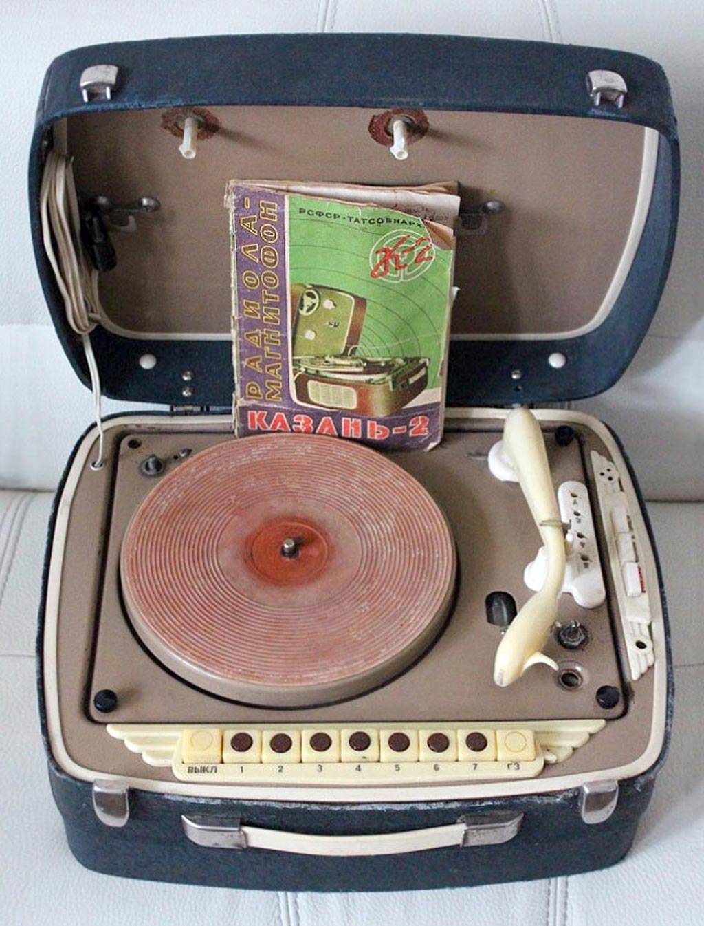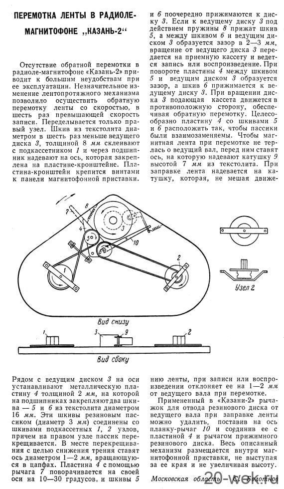 Комбинированная установка *Казань-2* (радиола-магнитофон) с 1959 года выпускалась Казанским заводом *Радиоприбор*. Модель разработана на базе радиолы **Казань-57**. КУ работает в диапазонах ДВ и СВ, а так же воспроизводит грамзапись с обычных и долгоиграющих пластинок. МП осуществляет запись и воспроизведение фонограмм. Приёмник - супер с фиксированной настройкой на семь различных частот в двух диапазонах. Чувствительность приёмника 500 мкВ. Чувствительность с гнёзд звукоснимателя 250 мВ. Избирательность по каналам приёма 15 дБ. МП устанавливается на диск ЭПУ. При записи используется ферромагнитная лента типа 2 или СН. Скорость протяжки ленты 9,53 см/сек. При ёмкости кассет 100 метров, время звучания обеих дорожек составляет 36 мин. Диапазон записываемых или воспроизводимых частот 100...6000 Гц. Коэффициент искажений 5%, при выходной мощности 1 Вт. Установка размещена в оклеенном деревянном футляре размером 380х300х100 мм. Вес установки 11 кг. В комплекте динамический микрофон МД-41. Описание и схема Радио №4/1961 ст.22