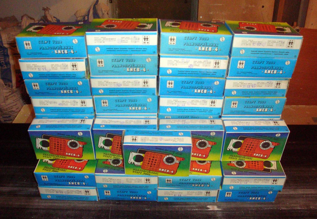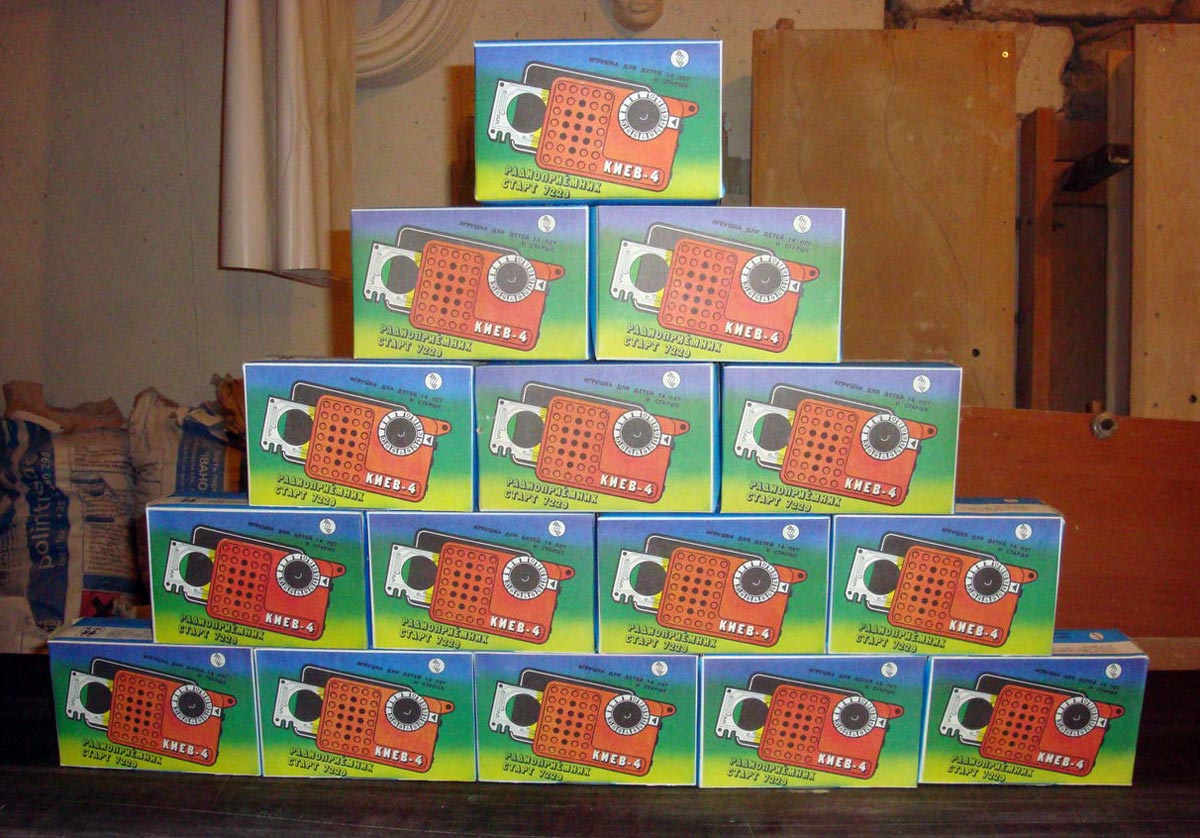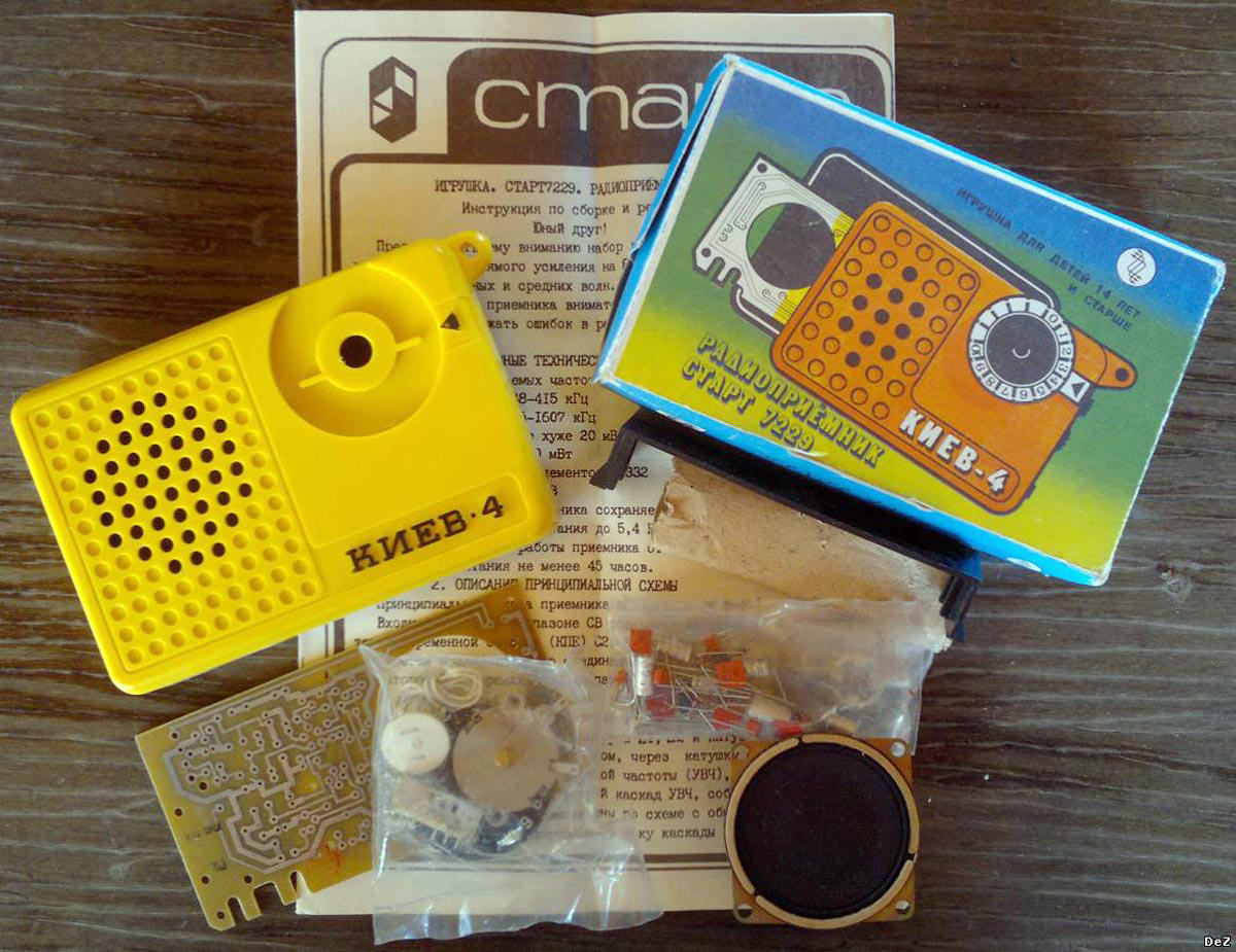 Радиоприёмник *Киев-4* из набора *Старт 7229* с начала 1980 года выпускало Киевское ПО *Электронмаш*. Набор деталей и узлов позволяет собрать приёмник прямого усиления *Киев-4* на 8 транзисторах и 3 диодах, работающий в диапазонах ДВ и СВ. Чувствительность собранного и настроенного приёмника 20 мВ/м. Номинальная выходная мощность 60 мВт. Питание напряжением 9 вольт от 6 элементов А-332. Цена набора конструктора 14 руб.