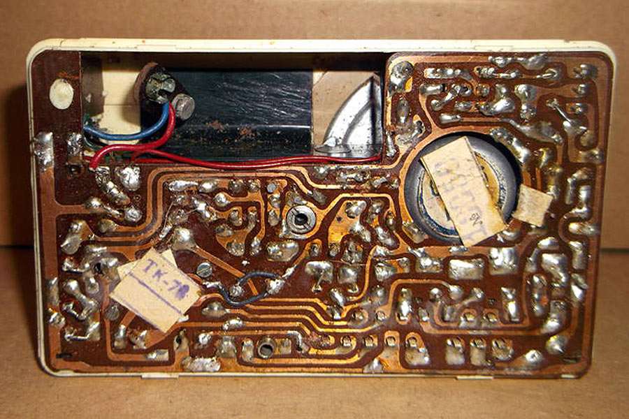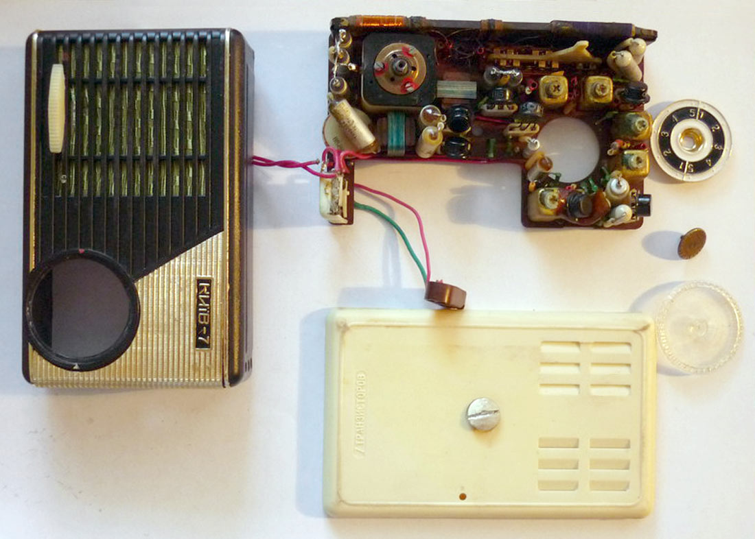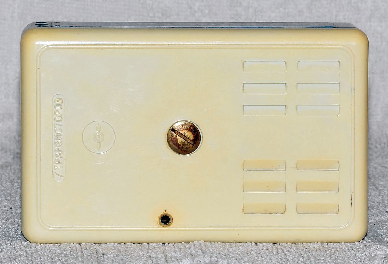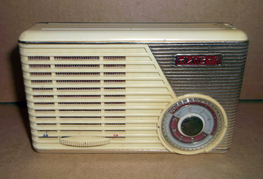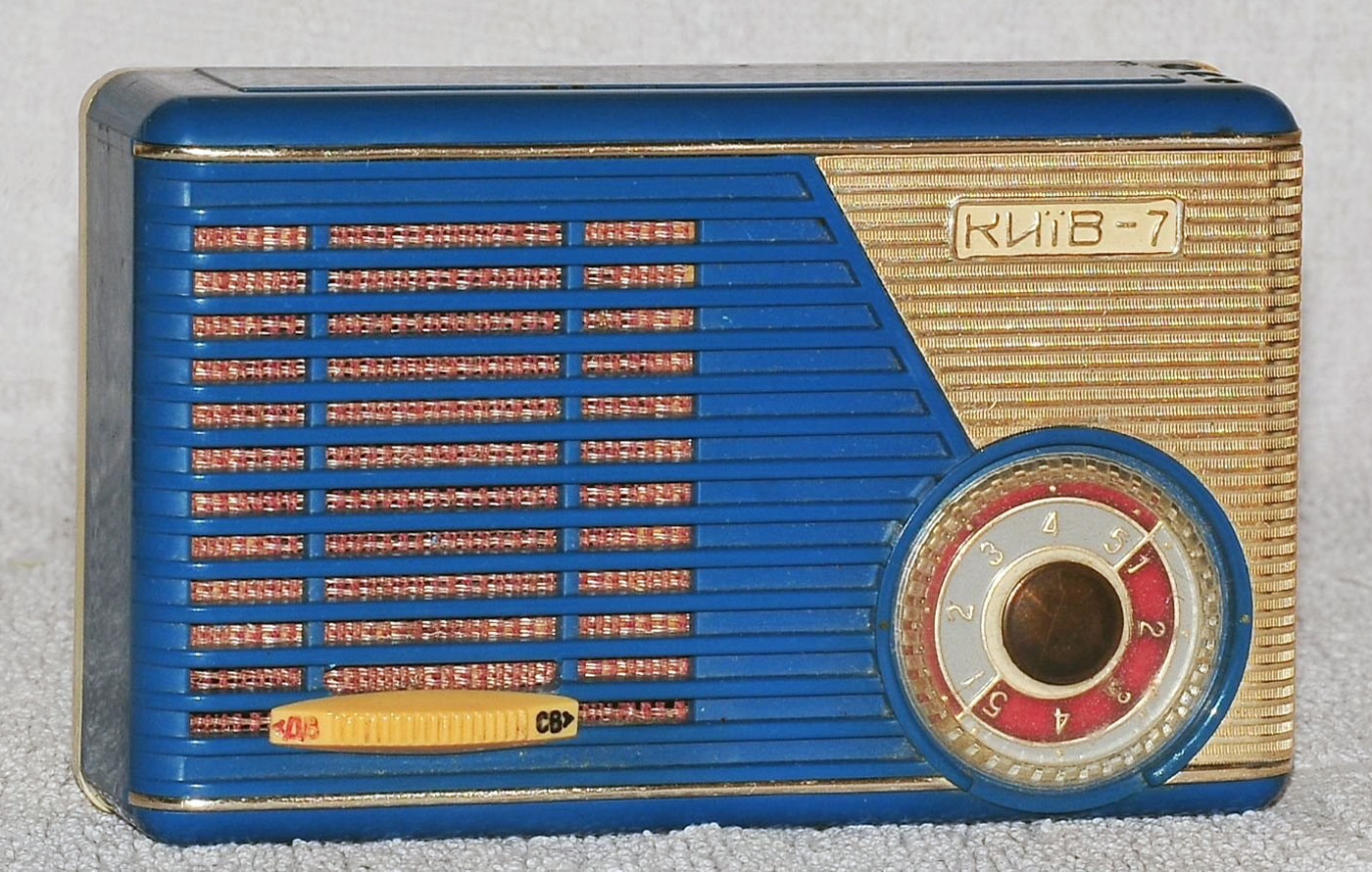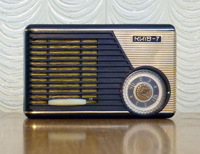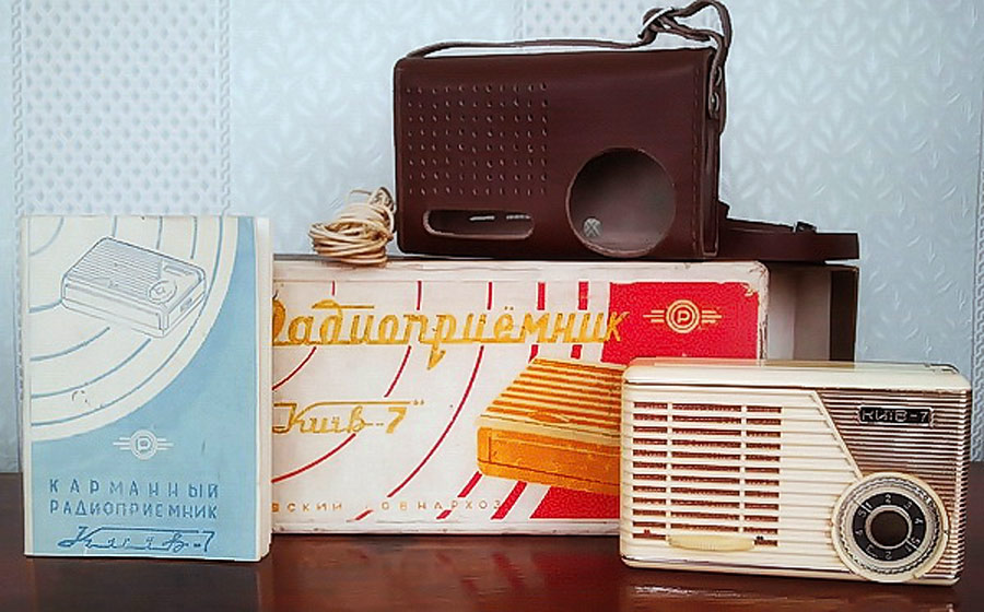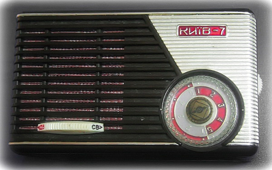Портативный транзисторный радиоприёмник *Киев-7* с начала 1963 года выпускал Киевский завод *Радиоприбор*. Супергетеродин на 7-ми транзисторах. Предназначен для приёма в диапазонах ДВ и СВ на магнитную антенну. Комплектуется футляром из натуральной кожи. Максимальная чувствительность на ДВ - 1,0 мВ/м, СВ - 0,8 мВ/м. Избирательность по соседнему каналу - 16 дБ. Ослабление зеркального канала - 14 дБ. ПЧ - 465 кГц. Действие АРУ: при изменении сигнала на входе на 26 дБ, сигнал на выходе меняется на 12 дБ. Полоса воспроизводимых частот звука 450...3000 Гц. Номинальная выходная мощность - 60 мВт. Источники питания батарея **Крона** или аккумулятор 7Д-0,1. Потребляемый ток при отсутствии сигнала 5,6 мА. Длительность работы приёмника при средней громкости: от батареи **Крона** 30 часов, аккумулятора 10 часов. Габариты радиоприёмника - 125 х 78 x 36 мм. Масса- 400 грамм.
