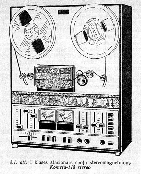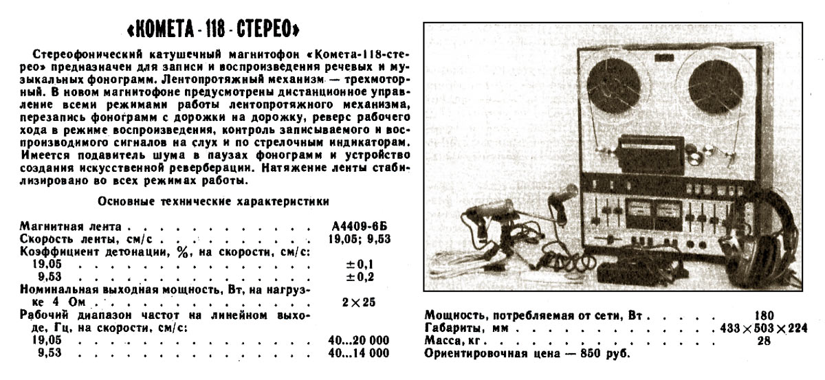 Сетевой катушечный магнитофон *Комета-118-стерео* в 1978 году разработан на Новосибирском заводе Точного машиностроения. Магнитофон был подготовлен к серийному производству с 1980 года, но по ряду причин так и не был запущен в серию. Было изготовлено несколько опытных образцов, причём в нескольких вариантах оформления. Магнитофон *Комета-118-стерео* предназначен для записи и воспроизведения речевых музыкальных фонограмм. Лентопротяжный механизм - трехмоторный. В магнитофоне предусмотрены дистанционное управление всеми режимами работы ЛПМ, перезапись фонограмм с дорожки на дорожку, реверс рабочего хода в режиме воспроизведения, контроль записываемого или воспроизводимого сигналов через встроенные громкоговорители или АС и по стрелочным индикаторам. Имеется подавитель шума в паузах фонограмм и устройство создания искусственной реверберации. Натяжение ленты стабилизировано во всех режимах работы. Рекомендемая магнитная лента типа А4409-6Б. Скорость протяжки магнитной ленты 19,05; 9,53 см/сек. Коэффициент детонации на скорости: 19,05 см/сек ±0,1 %, 9,53 см/сек ±0,2 %. Номинальная выходная мощность на нагрузке 4 0м - 2х25 Вт. Диапазон частот на линейном выходе на скоростях: 19,05 см/сек - 40...20000 Гц, 9,53 - 40...14000 Гц. Потребляемая от эл. сети мощность - 180 Вт. Габариты магнитофона - 433х503х224 мм. Масса 28 кг.