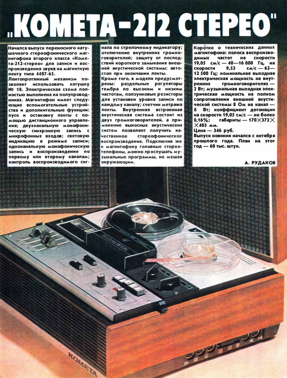 Катушечный магнитофон *Комета-212-стерео* с октября 1976 года выпускал Новосибирский завод *ТочМаш*. Магнитофон служит для записи на магнитную ленту звуковых фонограмм и их последующее воспроизведение через встроенные громкоговорители в монофоническом режиме или через выносные АС в монофоническом или стереофоническом режиме. ЛПМ двухмоторный, имеет скорости: 19,05 и 9,53 см/сек. Полоса записываемых и воспроизводимых частот 40...18000 Гц и 63...12500 Гц соответственно. Номинальная выходная мощность на свою АС - 3, внешнюю 12 Вт. Потребляемая мощность 50 Вт. Коэффициент детонации 0,16 и 0,3%. Габариты аппарата 405х372х170 мм. Масса 12,5 кг. В процессе производства было несколько модернизаций эл. схемы и оформления.