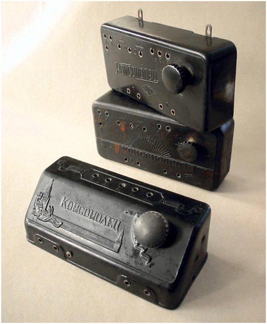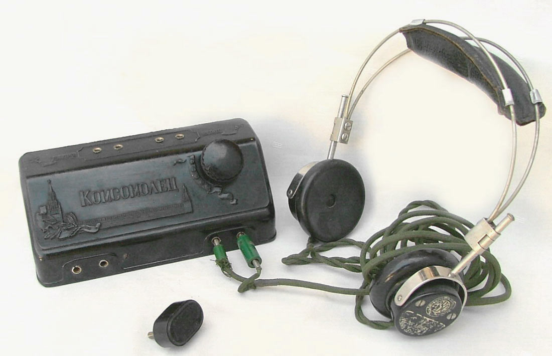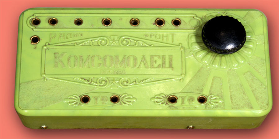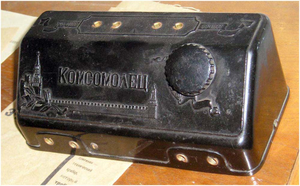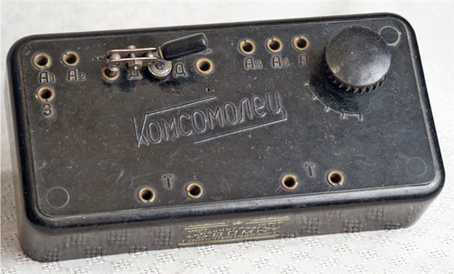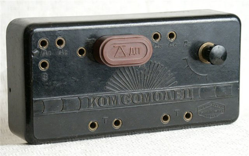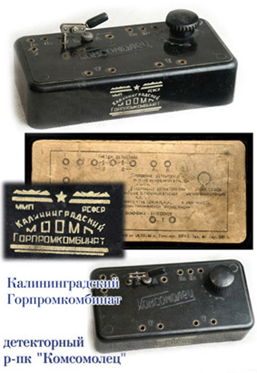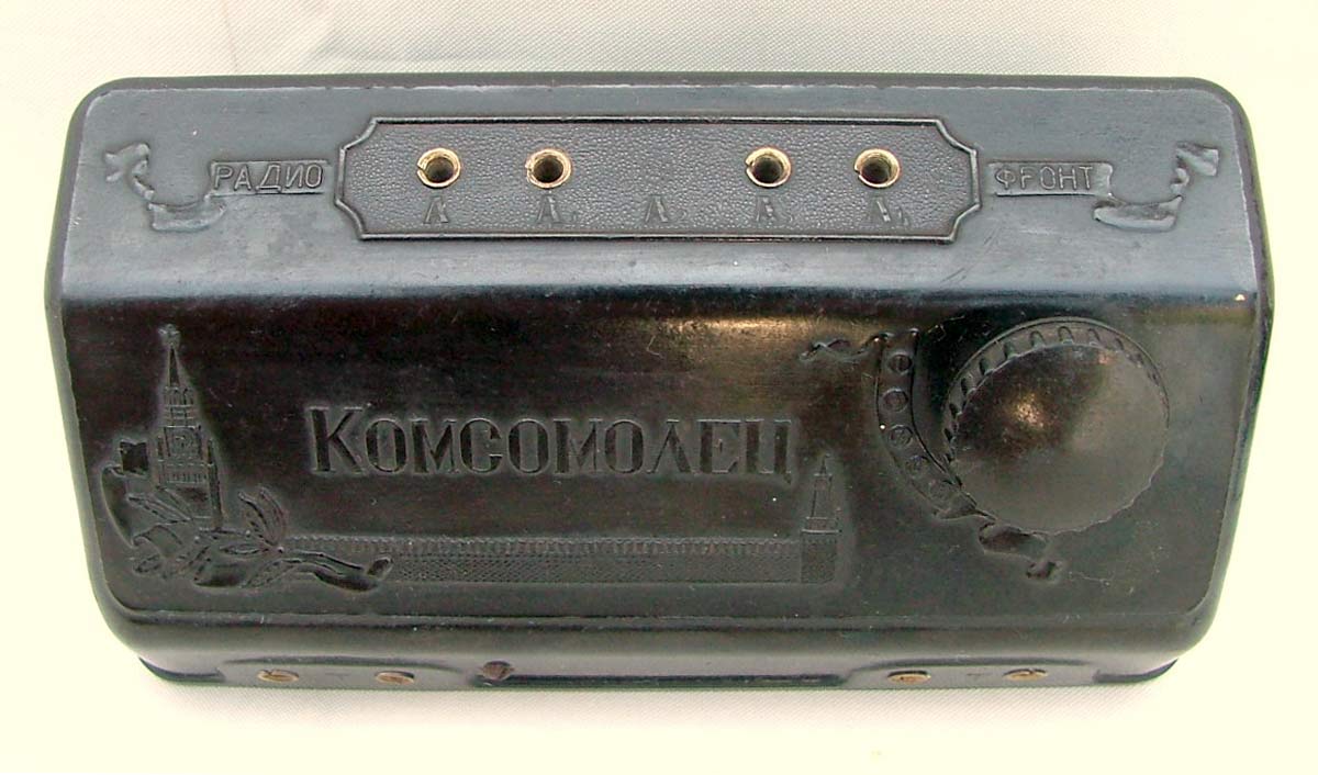 Радиоприёмник детекторный *Комсомолец* с октября 1947 по март 1957 года изготавливали: Молотовский завод *Урал*, Минский радиозавод, Артель *Радиофронт*, Калининградский горпромкомбинат, лаборатория *Радиофронт*, Московский завод *Красный Октябрь*, завод им. Радиофронта и несколько других. Конструктор радиоприёмника - Мурад Рашидович Капланов, хотя в технической литературе указывается имя и отчество как Михаил Романович Капланов - инженер НИИ МПСС. Радиоприёмник **Комсомолец** предназначен для приёма на головные телефоны местных и мощных не особенно отдаленных вещательных радиостанций, работающих в диапазонах длинных в средних волн от 2000 до 250 м. В контурных катушках приёмника находится передвижной альсиферовый сердечник для осуществления плавкой настройки приёмника. Рекомендуемая антенна: наружная, с общей длиной 40-50 м и высотой подвеса не менее 10...16 м. Антенный провод, подходящий к приёмнику, заделывается в однополюсную вилку, вставляемую в гнёзда А-1, А-2, А-3, А-4 или А-5 в зависимости от длины волны принимаемой радиостанции. В качестве заземления используется металлический лист размером 60х60 см и более, закопанный в землю на глубину от 1 м. Провод от заземления заделывается в однополюсную вилку и эта вилка должна быть вставлена в гнездо 3. Головные телефоны применены пьезоэлектрического или электромагнитного типа. Вилки от головных телефонов вставляются в гнёзда Т. Для предварительной грубой настройки приёмника на радиостанцию, вилку с антенным проводом и детектор вставляют в соответствующие гнёзда верхней панели приёмника. Если вилка с антенным проводом вставлена в гнезда А-1, А-2 то детектор своими вилками должен вставлен в левую пару детекторных гнёзд 1 и 2; если вилка с антенным проводом вставляется в гнезда A-3, А-4 или А-5, то детектор нужно переставлять в правую пару детекторных гнезд 2 и 3. Точная настройка на станцию достигается медленным вращением ручки настройки, связанной с альсиферовым сердечником. При вращении этой ручки можно настроиться на радиостанцию, работающие примерно на следующих волнах: От 2000 до 1100 м, ели вилка с антенным проводом вставлена в гнеэдо А-1, от 1200 до 670 м в А-2, от 800 и до 470 м в А-3, от 570 до 340 м в А-4 и от 350 до 250 м в А-5. Рекомендация справедлива при описанной выше антенне. Для приёма московских радиостанций, работающих на волнах 1724 и 1293 м, вилку с антенным проводом надо вставить в гнездо A-1 и медленно изменять настройку до появления лучшей слышимости в головных телефонах принимаемой станции. Размеры радиоприёмника 180х90х42 мм. Вес без упаковки 350 г. Приёмник выпускали в различных оформлениях футляра. На некоторых фотографиях нижних картонных крышек указаны даты выпуска приёмников, такие как 1939, 1940 годы, что не подтверждено в радиотехнической литературе тех лет.