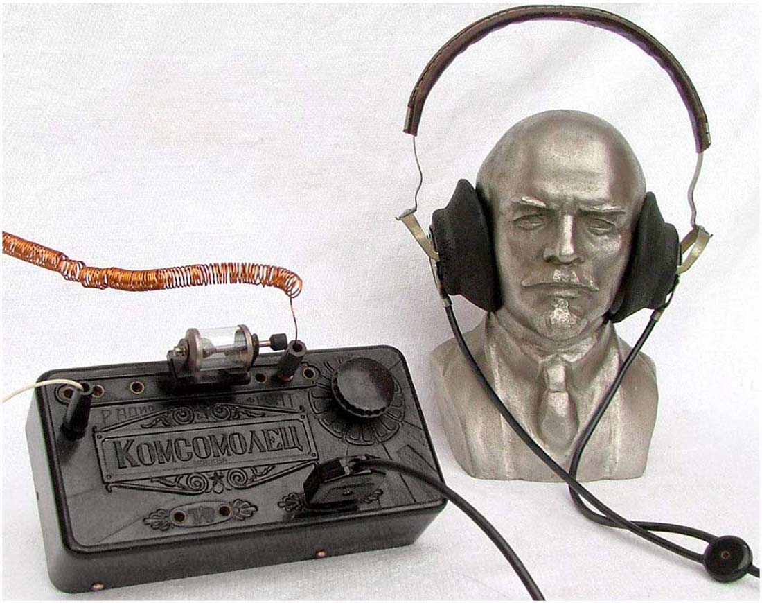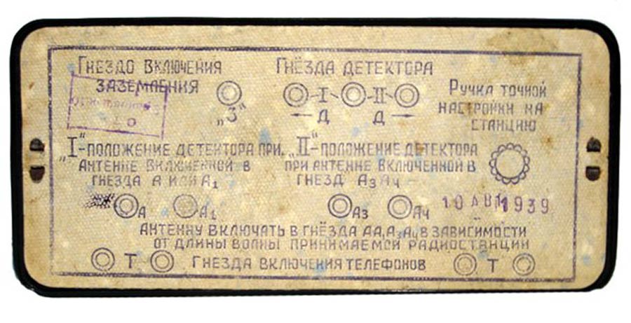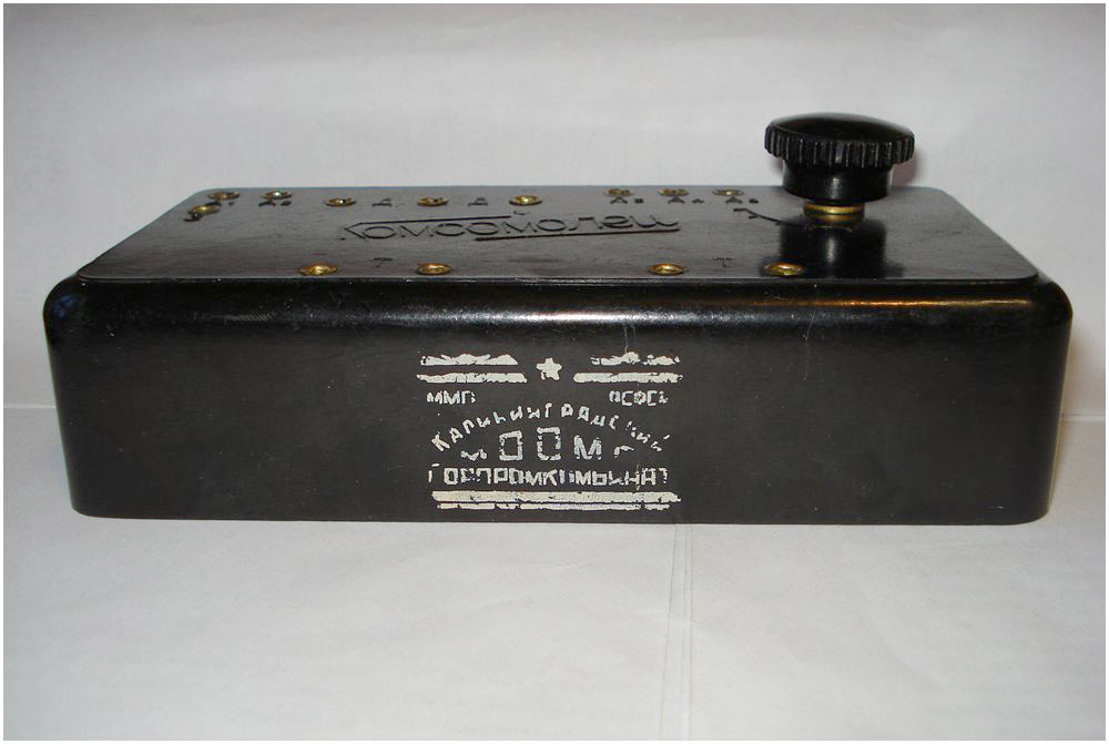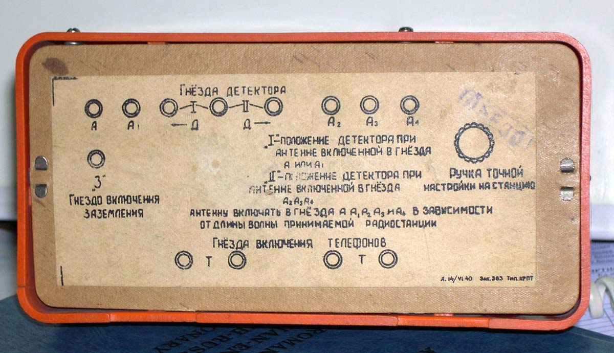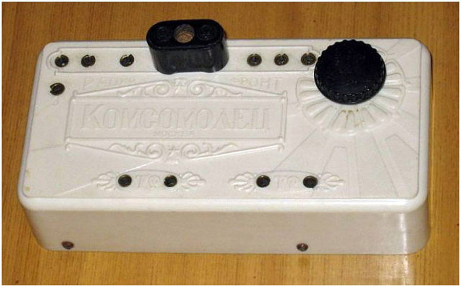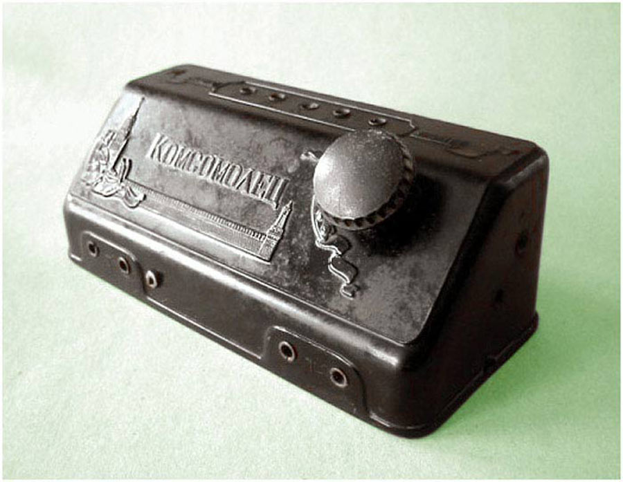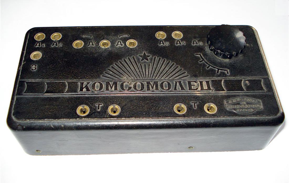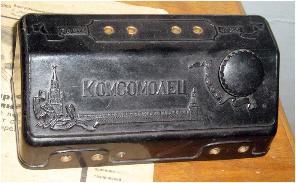Радиоприёмник детекторный *Комсомолец* с октября 1947 по март 1957 года изготавливали: Молотовский завод *Урал*, Минский радиозавод, Артель *Радиофронт*, Калининградский горпромкомбинат, лаборатория *Радиофронт*, Московский завод *Красный Октябрь*, завод им. Радиофронта и несколько других. Конструктор радиоприёмника - Мурад Рашидович Капланов, хотя в технической литературе указывается имя и отчество как Михаил Романович Капланов - инженер НИИ МПСС. Радиоприёмник **Комсомолец** предназначен для приёма на головные телефоны местных и мощных не особенно отдаленных вещательных радиостанций, работающих в диапазонах длинных в средних волн от 2000 до 250 м. В контурных катушках приёмника находится передвижной альсиферовый сердечник для осуществления плавкой настройки приёмника. Рекомендуемая антенна: наружная, с общей длиной 40-50 м и высотой подвеса не менее 10...16 м. Антенный провод, подходящий к приёмнику, заделывается в однополюсную вилку, вставляемую в гнёзда А-1, А-2, А-3, А-4 или А-5 в зависимости от длины волны принимаемой радиостанции. В качестве заземления используется металлический лист размером 60х60 см и более, закопанный в землю на глубину от 1 м. Провод от заземления заделывается в однополюсную вилку и эта вилка должна быть вставлена в гнездо 3. Головные телефоны применены пьезоэлектрического или электромагнитного типа. Вилки от головных телефонов вставляются в гнёзда Т. Для предварительной грубой настройки приёмника на радиостанцию, вилку с антенным проводом и детектор вставляют в соответствующие гнёзда верхней панели приёмника. Если вилка с антенным проводом вставлена в гнезда А-1, А-2 то детектор своими вилками должен вставлен в левую пару детекторных гнёзд 1 и 2; если вилка с антенным проводом вставляется в гнезда A-3, А-4 или А-5, то детектор нужно переставлять в правую пару детекторных гнезд 2 и 3. Точная настройка на станцию достигается медленным вращением ручки настройки, связанной с альсиферовым сердечником. При вращении этой ручки можно настроиться на радиостанцию, работающие примерно на следующих волнах: От 2000 до 1100 м, ели вилка с антенным проводом вставлена в гнеэдо А-1, от 1200 до 670 м в А-2, от 800 и до 470 м в А-3, от 570 до 340 м в А-4 и от 350 до 250 м в А-5. Рекомендация справедлива при описанной выше антенне. Для приёма московских радиостанций, работающих на волнах 1724 и 1293 м, вилку с антенным проводом надо вставить в гнездо A-1 и медленно изменять настройку до появления лучшей слышимости в головных телефонах принимаемой станции. Размеры радиоприёмника 180х90х42 мм. Вес без упаковки 350 г. Приёмник выпускали в различных оформлениях футляра. На некоторых фотографиях нижних картонных крышек указаны даты выпуска приёмников, такие как 1939, 1940 годы, что не подтверждено в радиотехнической литературе тех лет.