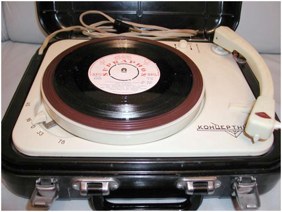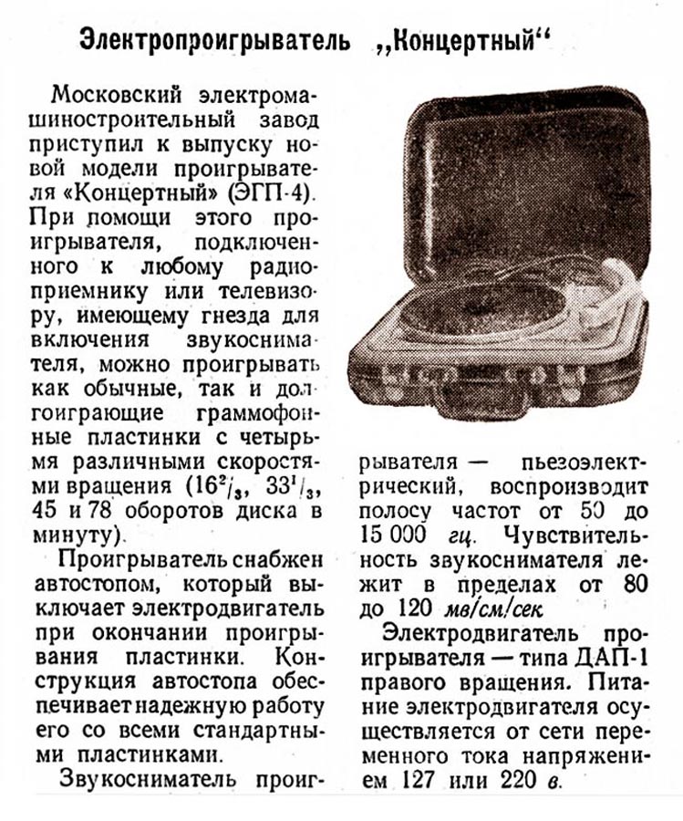 Электропроигрыватель *Концертный* ЭГП-4 с весны 1961 года выпускал Московский электромашиностроительный завод. Электропроигрывателем, подключившись к приёмнику или телевизору имеющему вход звукоснимателя можно было проигрывать обычные и долгоиграющие граммофонные пластинки с 4-мя скоростями вращения: 16, 33, 45 и 78 об/мин. ЭП имеет автостоп, выключающий электродвигатель при окончании проигрывания пластинки. Конструкция обеспечивает уверенную работу автостопа со стандартными грампластинками. Звукосниматель стоит пьезоэлектрический и воспроизводит полосу звуковых частот 50...15000 Гц. Чувствительность звукоснимателя - 80 мВ/см/сек. Электродвигатель типа ДАП-1. Питание от сети переменного тока 127 или 220 В. Масса ЭП - 6,4 кг. Цена 16 рублей 80 копеек. В 1963 году ЭП был модернизирован в *Концертный* (ЭГП-4М).