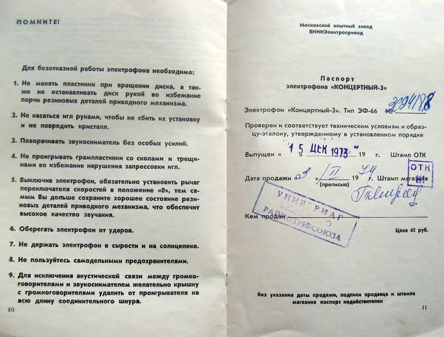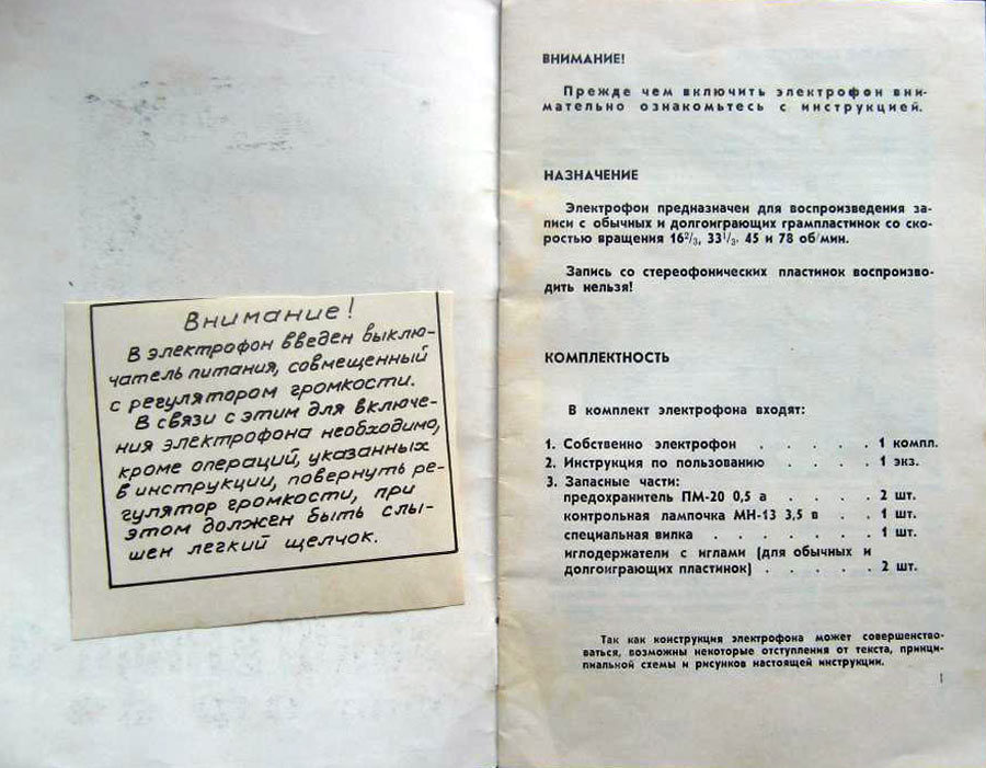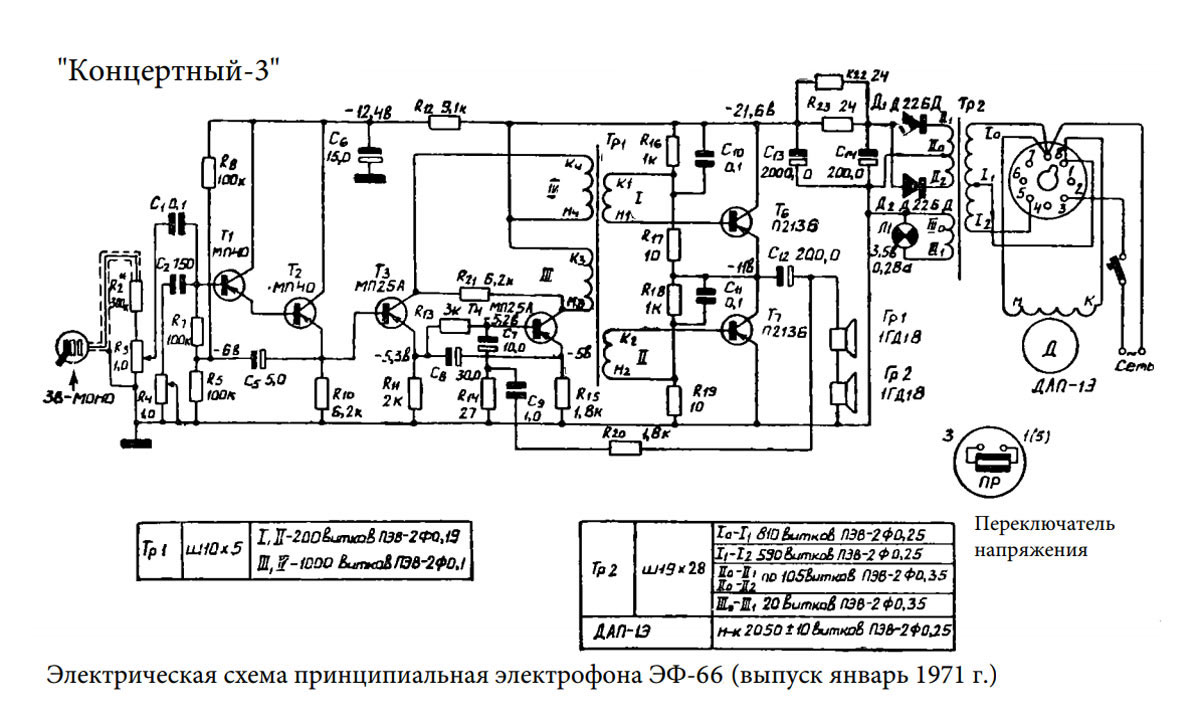 Электрофон сетевой транзисторный *Концертный-3* с начала 1967 года выпускал Московский опытный завод ВНИИ *Электропривод* и Московский завод *Агрегат*. Электрофон **Концертный-3** (тип ЭФ-66) предназначен для проигрывания обычных и долгоиграющих грампластинок на скоростях: 16, 33, 45 и 78 об/мин. АС состоит из двух громкоговорителей 1ГД-28 и может быть отнесена до 1 метра. Номинальная выходная мощность 1, максимальная 3 Вт. Диапазон воспроизводимых частот - 100...10000 Гц. Потребляемая от сети мощность 30 Вт. Масса ЭФ - 7 кг. В течении выпуска электрофон претерпел изменения в своей электрической схеме и конструкции.