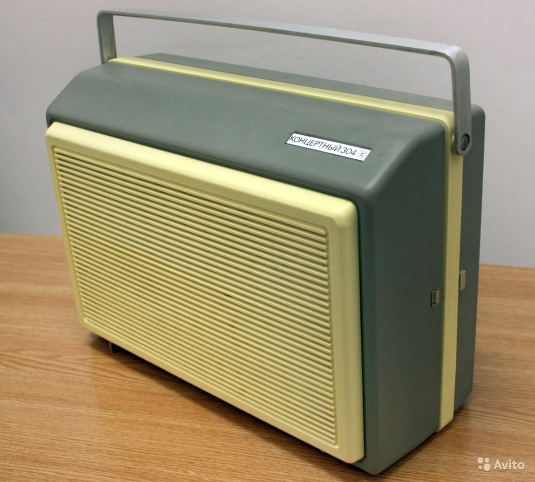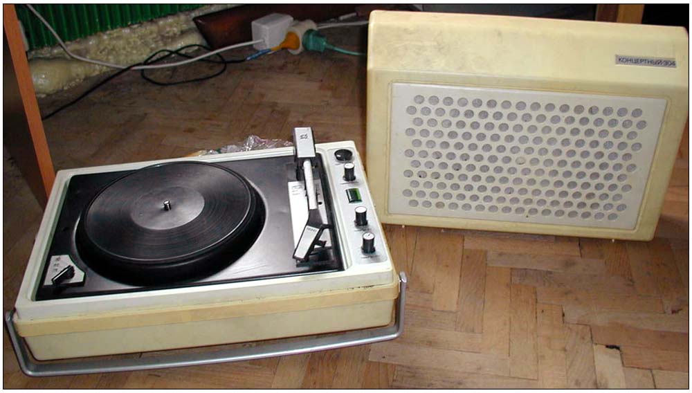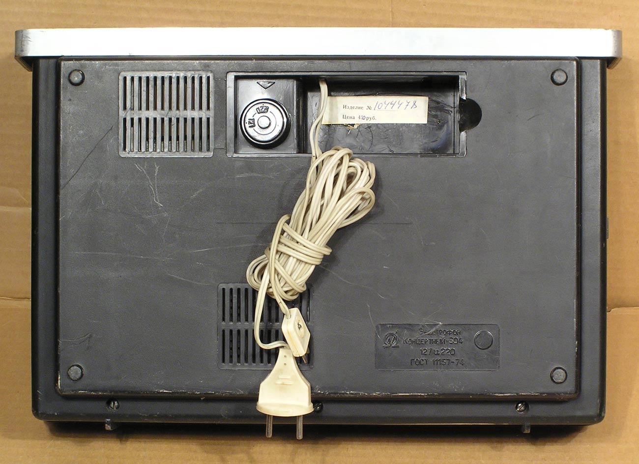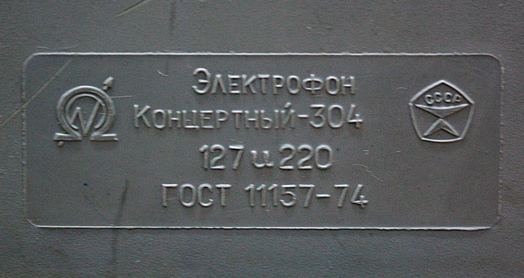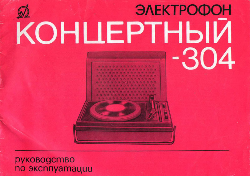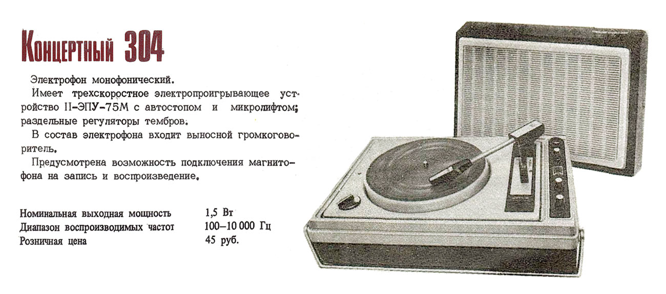 Электрофон *Концертный-304* с 1977 года выпускал Московский опытный завод *Агрегат*.ЭФ предназначен для воспроизведения пластинок на отделяемую АС. В ЭФ установлено трёхскоростное II-ЭПУ-50, имеющее автостоп по окончании проигрывания грампластинки. В АС установлено два громкоговорителя 1ГД-40. Диапазон рабочих частот 100...10000 Гц. Номинальная выходная мощность 1,5 Вт, максимальная 3 Вт. Усилитель НЧ собран на девяти транзисторах (микросхеме и транзисторе). Потребляемая мощность 20 Вт. Габариты ЭФ с АС - 410х275х185 мм. Вес 7,5 кг.