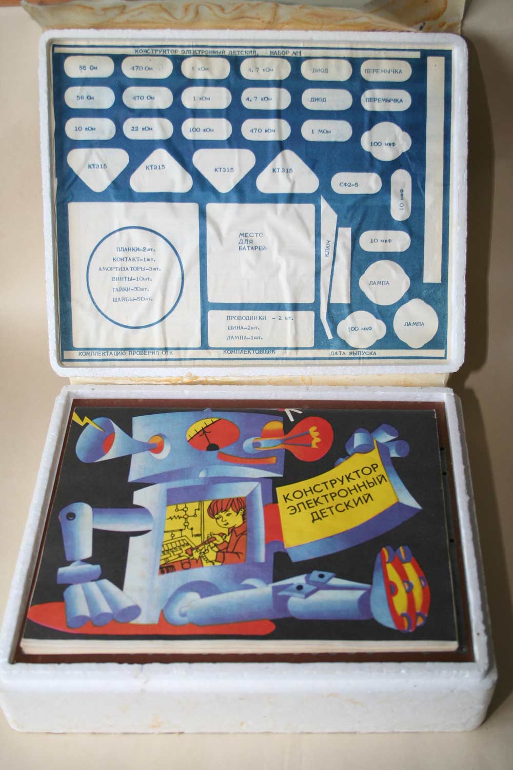 Конструктор электронный детский с I-кв 1980 года выпускал Каневский электромеханический завод *Магнит*. Конструктор электронный детский выпускался в двух вариантах набора. Каждый из наборов содержит универсальную печатную плату, радиоэлементы, детали и провода позволяющие из набора 1 собрать 23, а из набора 2 - 36 действующих схем различных радио и электротехнических устройств. Инструкция и схемы конструктора электронного детского. Фотографии и инструкцию конструктора предоставил Валерий Кручина, Харьков. ------