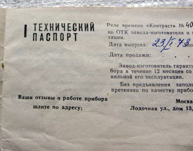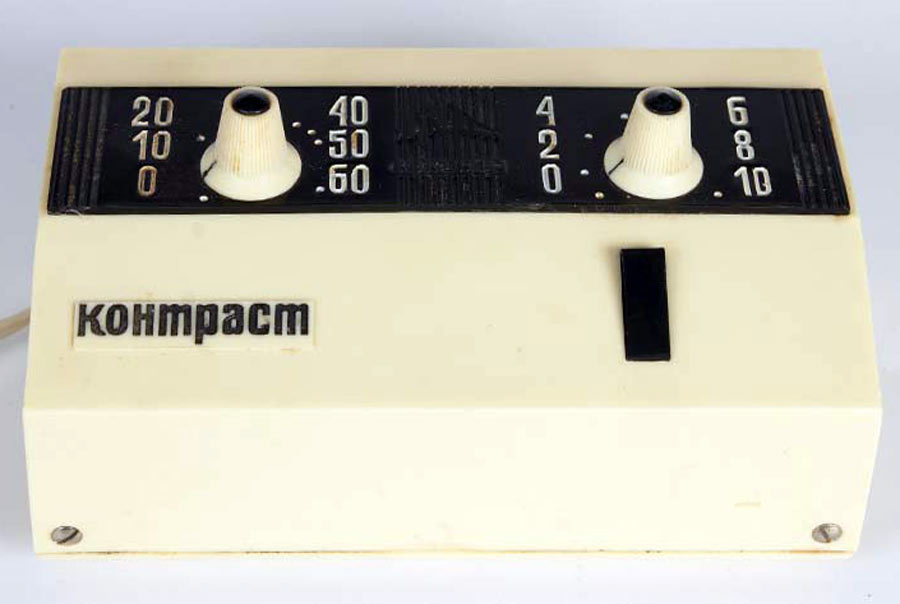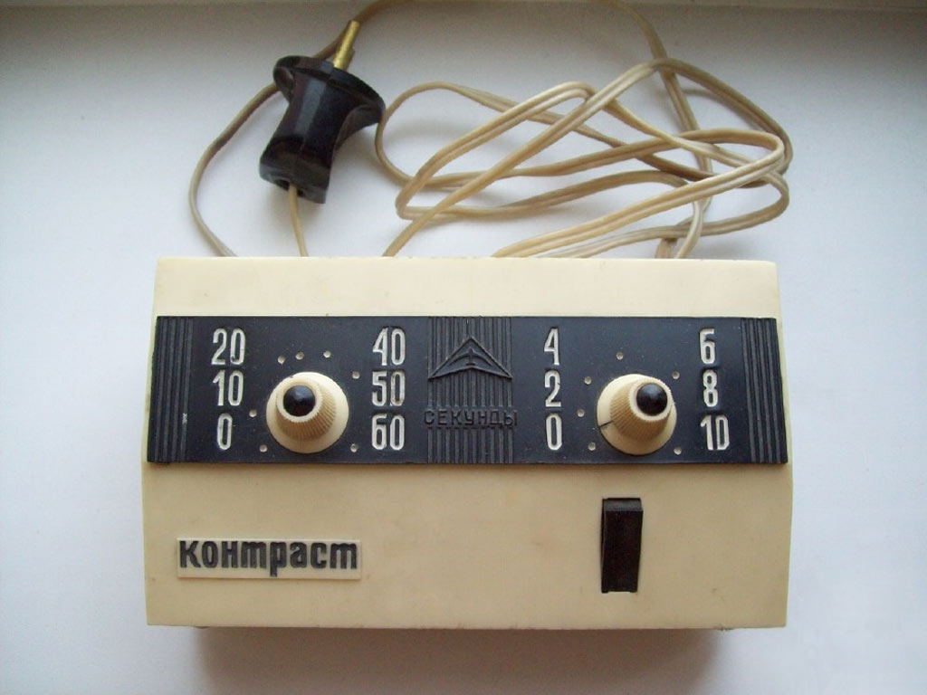Реле времени на транзисторах *Контраст* предположительно с 1972 года выпускалось Тушинским машиностроительным заводом. Реле времени *Контраст* предназначено для полуавтоматического определения выдержек (времени горения ламп в сек.) при контактной или проекционной печати.
