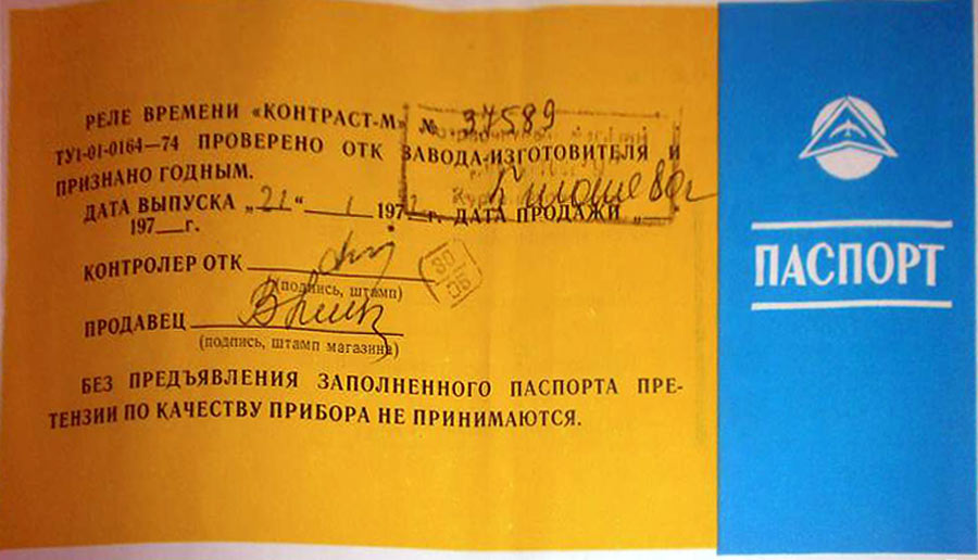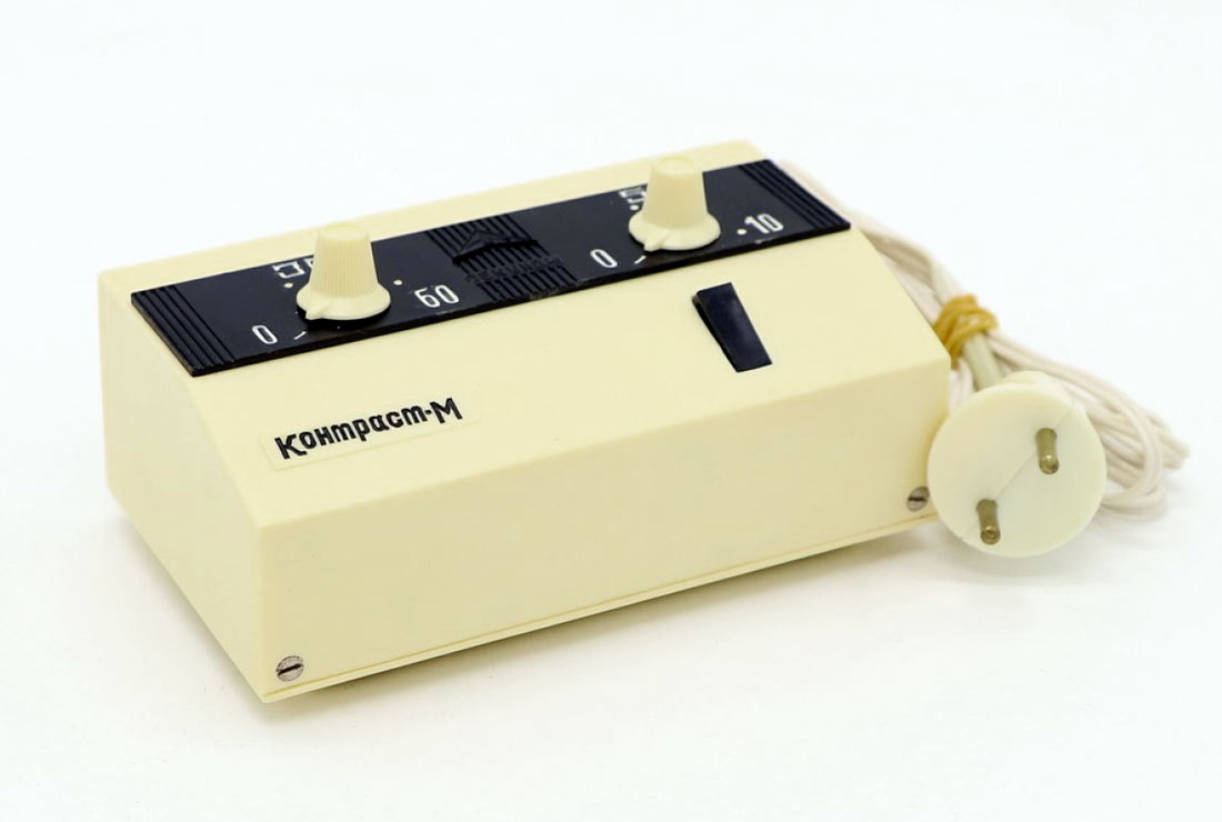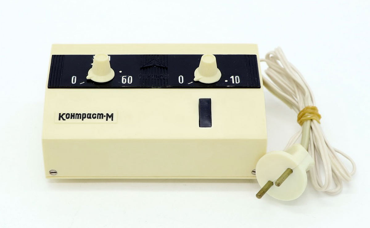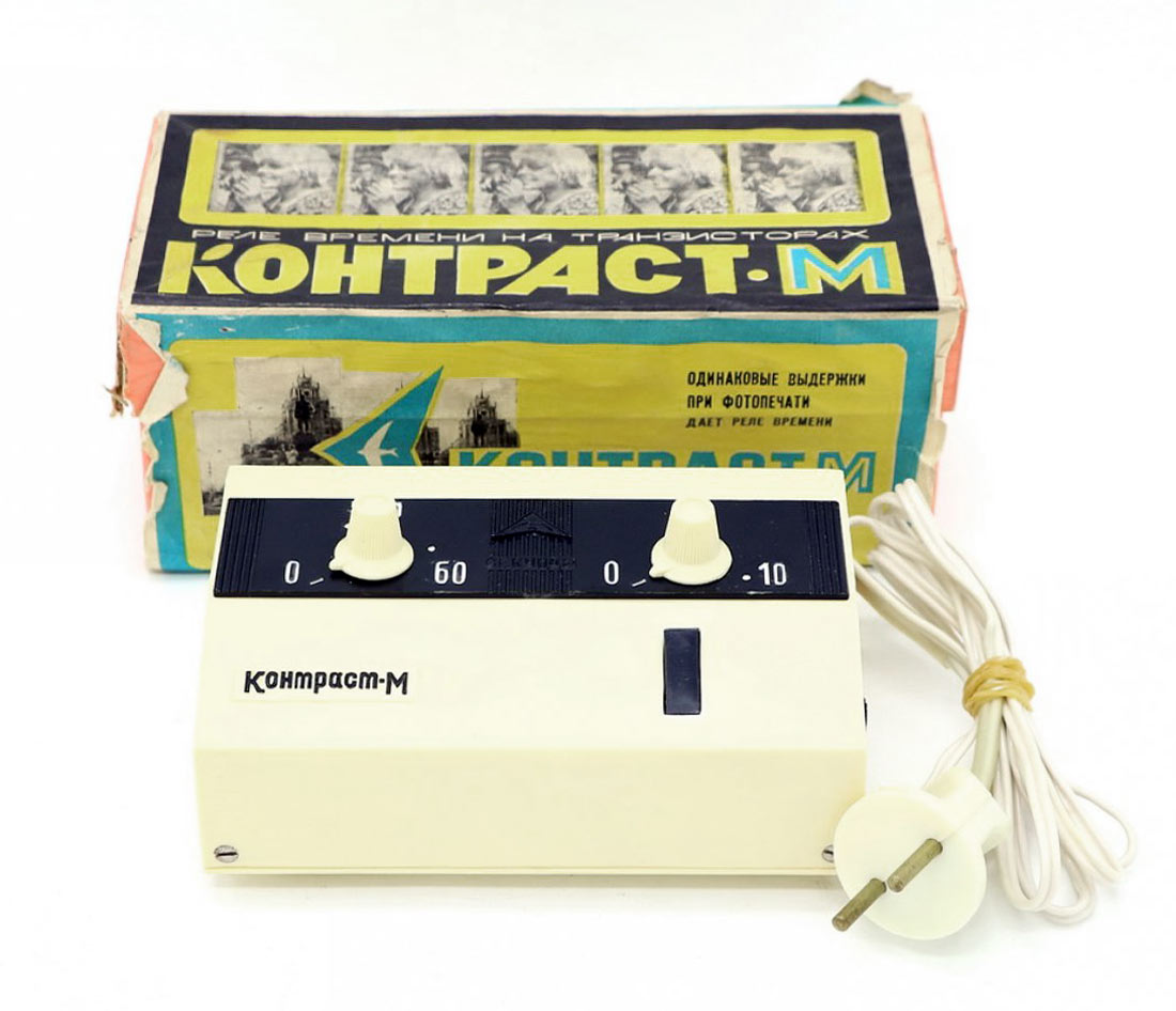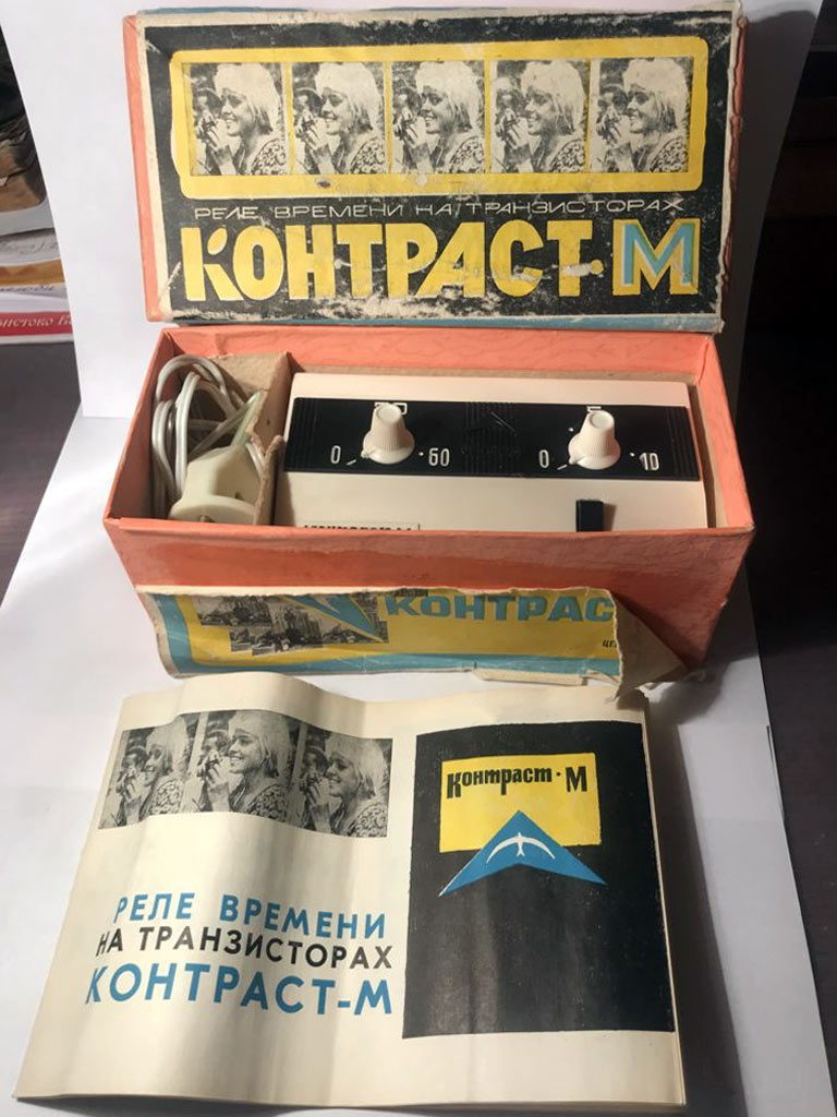 Реле времени на транзисторах *Контраст-М* выпускалось предположительно с 1979 года Тушинским машиностроительным заводом. Реле времени предназначено для полуавтоматического дозирования выдержек (времени горения лампы фотоувеличителя) при контактной или проекционной фотопечати.