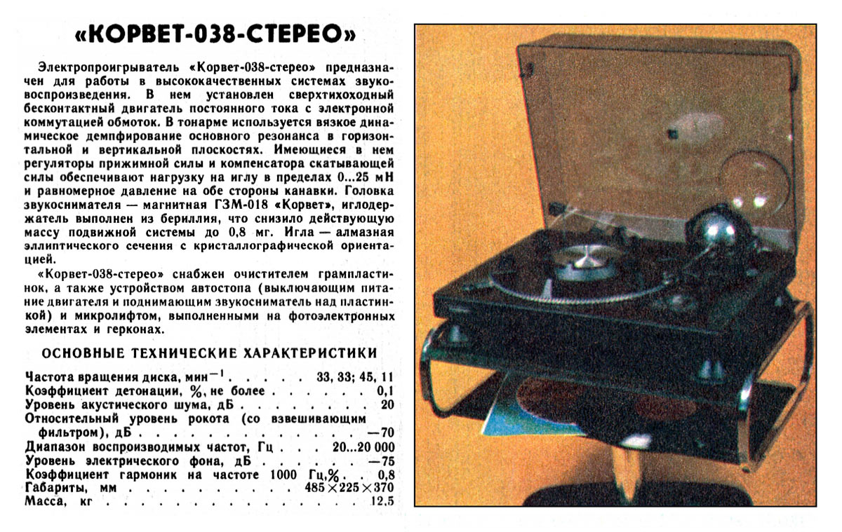 Электропроигрыватель *Корвет-038-стерео* с 1983 года выпускал Кировский завод *Ладога*. В модели установлен сверх-тихоходный двигатель постоянного тока, с электронной коммутацией обмоток. В тонарме используется вязкое динамическое демпфирование основного резонанса в горизонтальной и вертикальной плоскостях. Регуляторы прижимной силы и компенсатора скатывающей силы дают нагрузку на иглу в пределах 0...25 мН и равномерное её давление на обе стороны канавки. Головка звукоснимателя магнитная ГЗМ-018 Корвет, иглодержатель выполнен из бериллия, что снизило массу подвижной системы до 0,8 мг. Игла алмазная эллиптического сечения с кристаллографической ориентацией. ЭПУ имеет очиститель пластинок и автостоп выключающий питание двигателя и поднимающий звукосниматель над грампластинкой и микролифтом, он выполнен на фотоэлектронных элементах и герконах. **Корвет-038-стерео** конструкцией, параметрами и схемой схож с проигрывателем **Корвет-003-стерео**. Частота вращения диска 33, 45 об/мин. Коэффициент детонации 0,1%. Уровень акустического шума 20 дБ. Относительный уровень рокота -70 дБ. Диапазон частот 20...20000 Гц. Уровень фона -75 дБ. Коэффициент гармоник 0,8%. Габариты ЭП 485х225х370 мм. Вес 12 кг. С 1987 года согласно ГОСТ 11157-87 электропроигрыватель стал именоваться как *Корвет ЭП-038-стерео*.