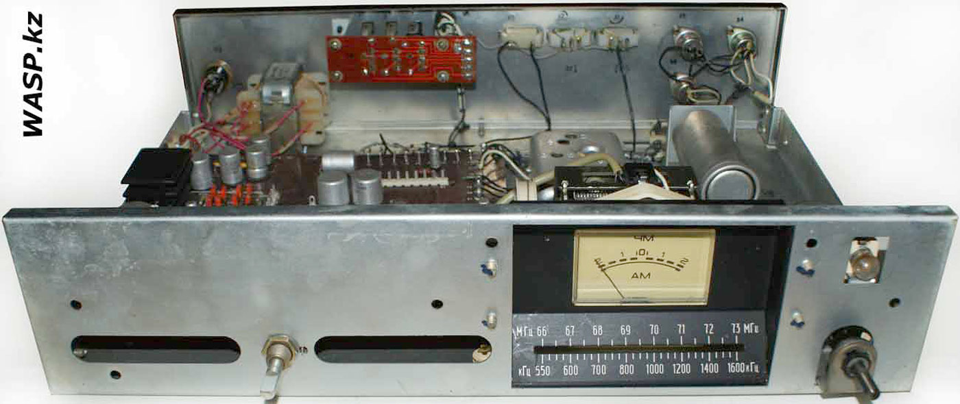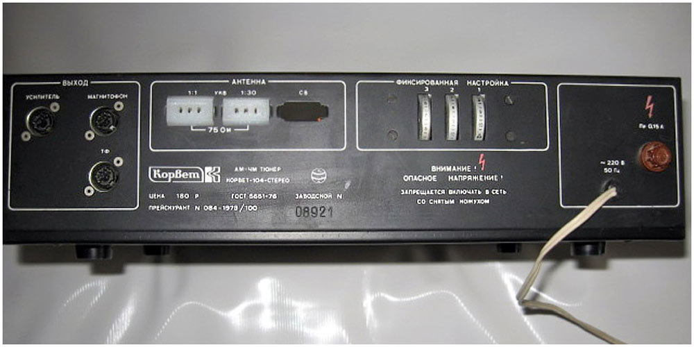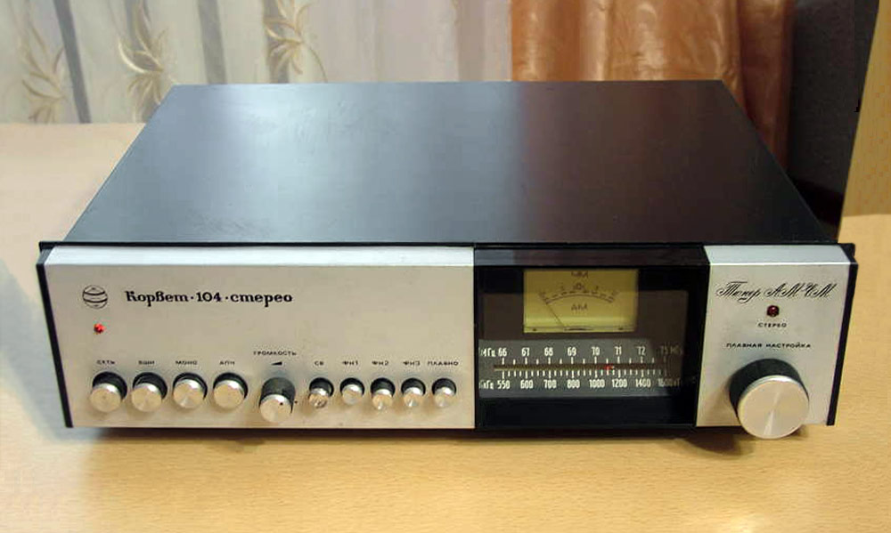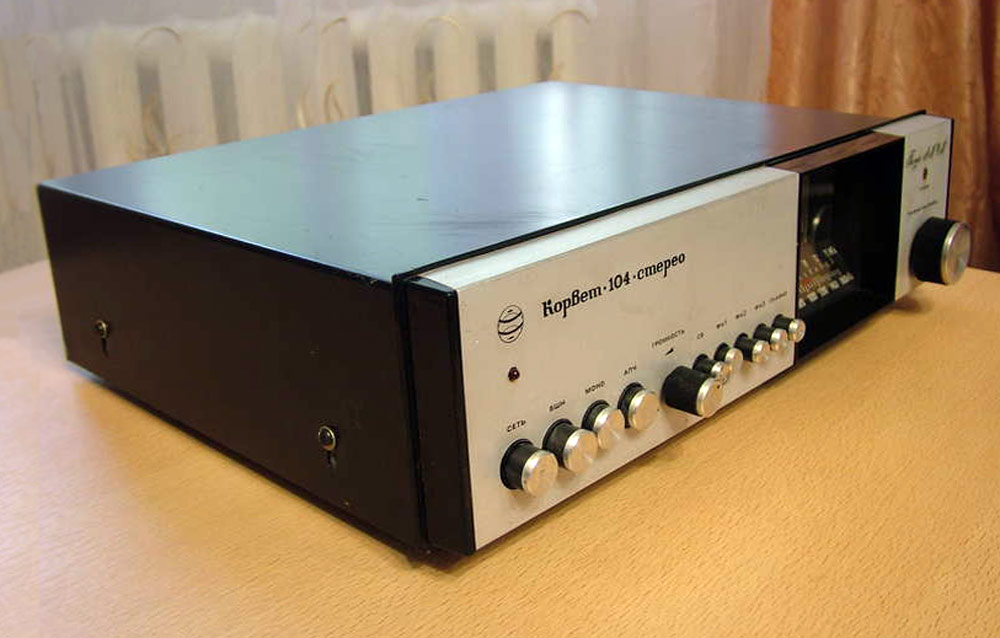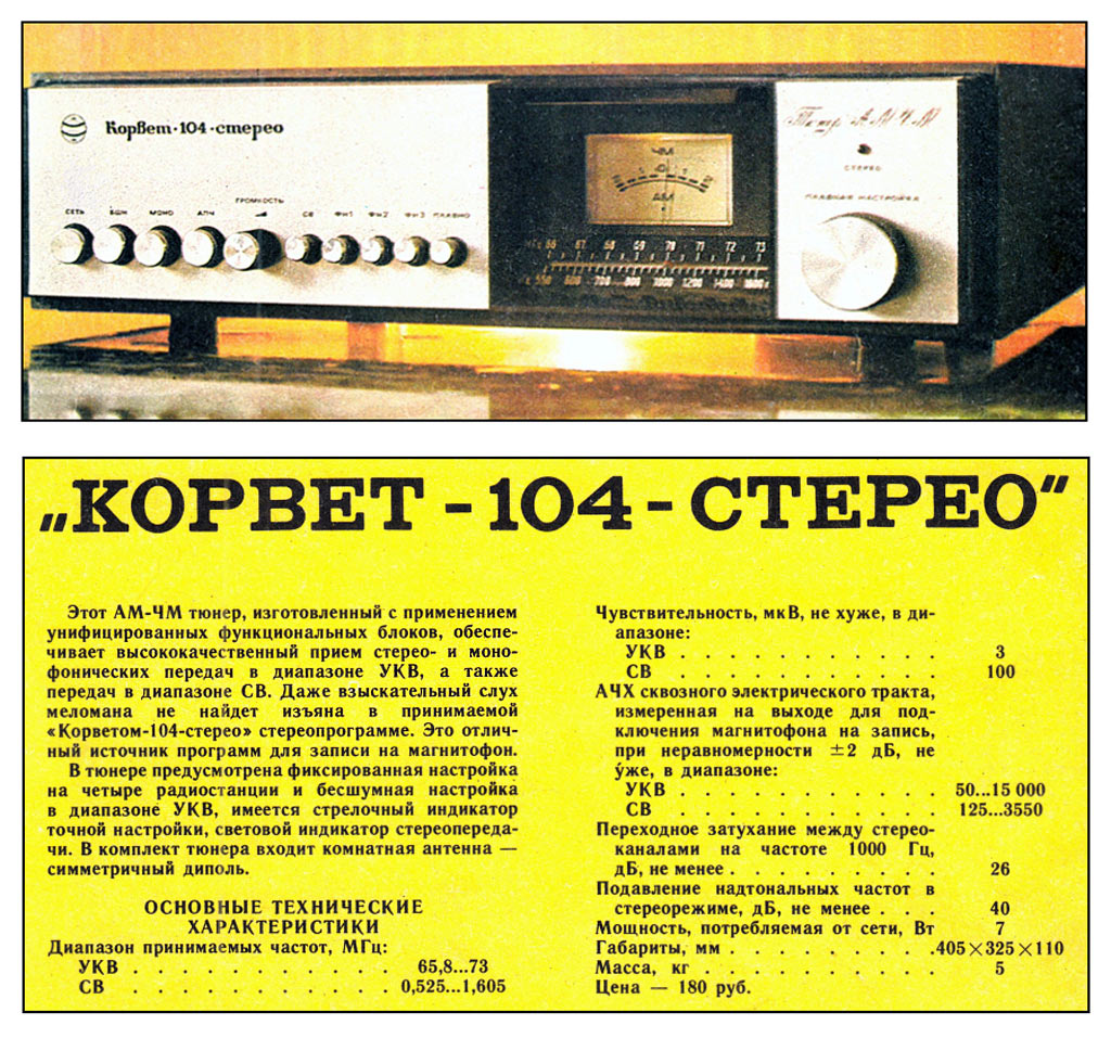 Стационарный транзисторный тюнер *Корвет-104-стерео* с 1982 года выпускал Таганрогский завод *Прибой*. Тюнер собран на 42 транзисторах и 5 интегральных микросхемах. В тюнере применён стереодекодер с временным разделением каналов, предусмотрена индикация точной настройки и наличия стереосигнала. Приём производится в диапазонах УКВ и СВ. В диапазоне УКВ возможен приём моно и стереофонических передач. В УКВ тракте имеется возможность включения БШН, имеется АПЧ и фиксированная настройка на три заранее выбранные станции. Переключение тюнера на стереофонический приём с индикацией происходит автоматически при приёме стереопередач. О точности настройки можно судить по стрелочному индикатору. Прослушивать радиопередачи можно на стереофонические телефоны или громкоговорители через внешний стереоусилитель НЧ с АС. Высокие параметры тюнера позволяют использовать его с высококачественными УКУ. Диапазон частот: СВ 525...1605 кГц и УКВ 65,8...73 МГц. Чувствительность в диапазоне: СВ 100 мкВ, УКВ 3 мкВ. Селективность в диапазоне СВ - 36 дБ, УКВ - 46 дБ. Переходное затухание между каналами 27 дБ. Частотная характеристика тюнера по звуку в диапазоне: УКВ стерео 50...15000 Гц, УКВ моно 31,5...16000 Гц, СВ 125...3550 Гц. Потребляемая мощность 7 Вт. Габариты тюнера 405х325х110 мм. Масса 5 кг. Тюнер разработан в 1980 году.