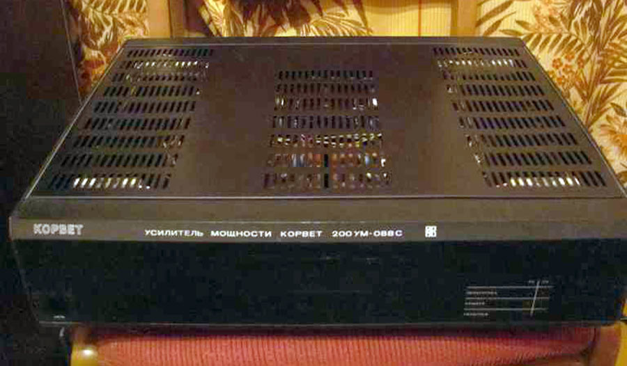 Усилитель мощности *Корвет 200УМ-088С* с 4-кв 1990 года выпускал Кировский завод *Ладога*. Стереоусилитель мощности предназначен для усиления электрической мощности сигналов звуковой частоты. Особенности модели - предельно низкие собственные шумы и искажения, большой запас мощности, работа с любой нагрузкой. Вместе с усилителем рекомендуется применять АС **Корвет 75АС-001** или аналогичные; предварительный стереоусилитель **Корвет УП-078С** или другой высшей группы сложности. Усилитель имеет следующие удобства: концентрические гнёзда входа для подключения предусилителя или эквалайзера, исключающие взаимосвязь каналов; клеммы для подключения двух комплектов АС; световые индикаторы включения питания, перегрузки выхода, срабатывания устройств защиты; защиту выходов от короткого замыкания; защиту АС от постоянного напряжения (тока) при неисправности; защиту выходных транзисторов от перегрева. Основные параметры: Выходная мощность каждого канала: долговременная ограниченная общими гармоническими искажениями 1% не менее 180 Вт. Потребляемая мощность 200...500 Вт. Эффективный диапазон рабочих частот 20...20000 Гц. Неравномерность частотной характеристики 0,3 дБ. Отношение сигнал/фон 110 дБ. Уровень акустического шума 20 дБ. Полное входное сопротивление 47 кОм. Габаритные размеры модели 430х375х130 мм. Масса 13 кг.