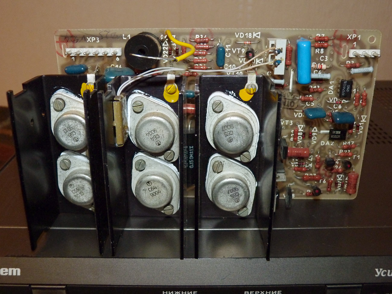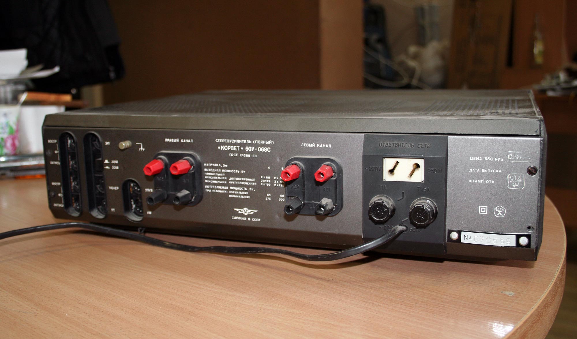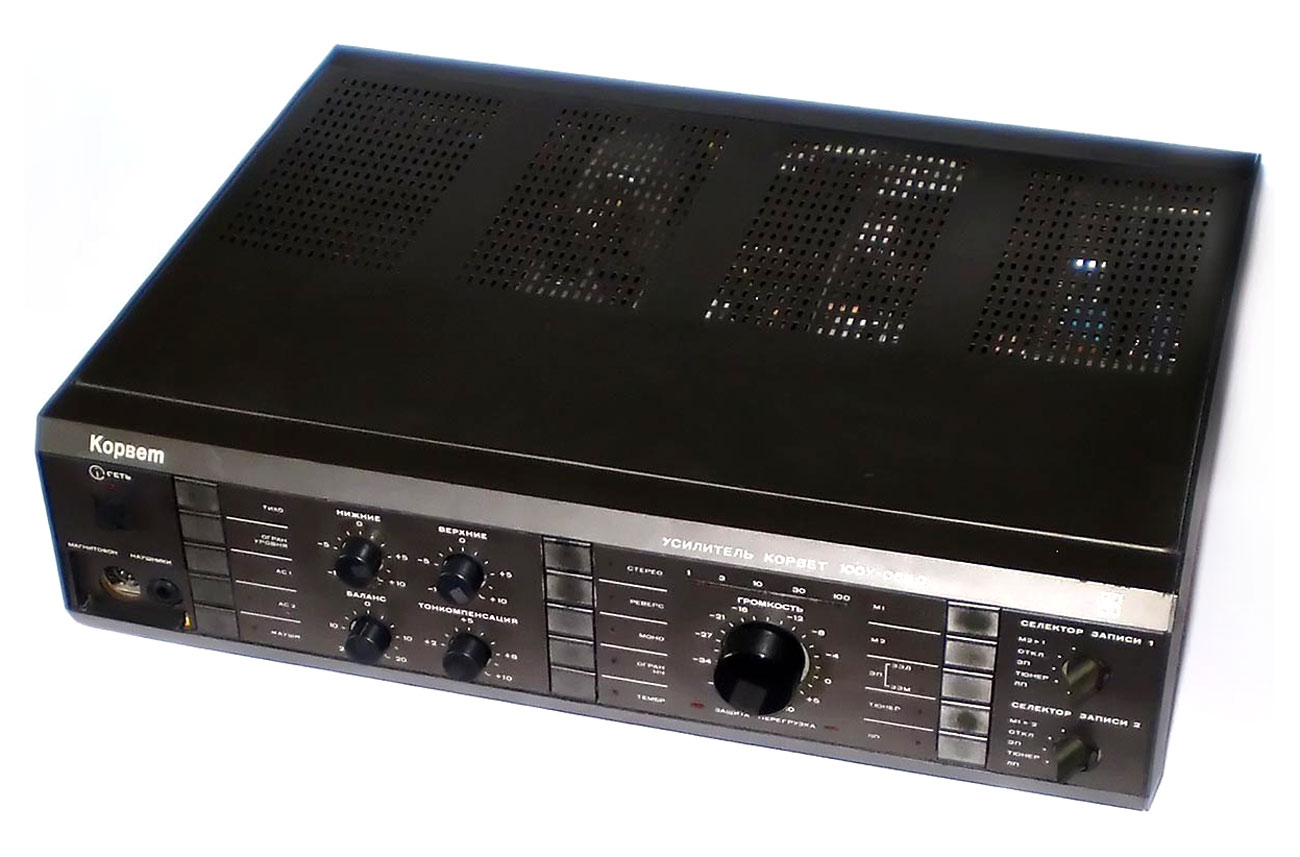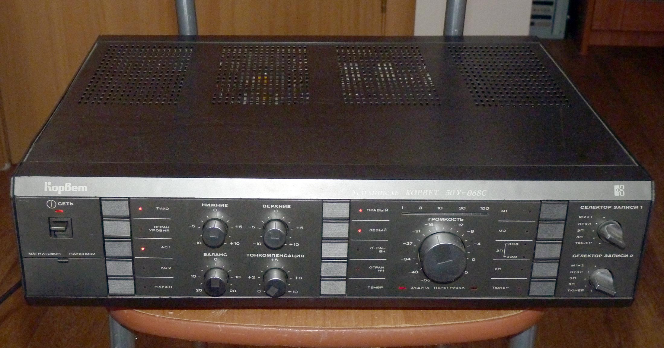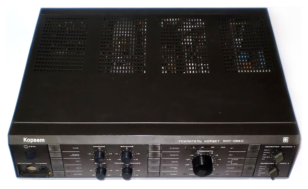 Полный усилитель *Корвет 50У-068С* с 1987 года выпускал АООТ Кировский завод *Ладога*. **Корвет 50-У-068С** это представитель нового поколения полных усилителей. В его создании использованы технические решения усилителя **Бриг-001-стерео**. Впервые здесь применён усилитель мощности класса ЛВС с двухуровневым питанием, что позволило улучшить тепловой режим усилителя. В УМЗЧ имеется защита от КЗ в нагрузке или при перегрузке. Есть переключатель звукоснимателей, с помощью которого кроме электромагнитного можно подключить и электродинамический. Значение максимальной мощности индицируется индикатором. Ограничитель уровня сигнала уменьшает сигнал при использовании АС с мощностью ниже рекомендованной. Регулятор громкости с изменяемой тонкомпенсацией позволяет уменьшить шумы при снижении уровня громкости, а выбор АЧХ в области НЧ согласовывает особенности слухового восприятия с акустическими свойствами помещения. Помехи на инфранизких частотах с ЭПУ ограничиваются фильтром НЧ, а помехи от грампластинок фильтром ВЧ. Коммутация программ, АС и головных телефонов производится кнопочными переключателями, со световой индикацией. Отключаемый выход эл. сети позволяет питать аппараты, работающие вместе с усилителем. Номинальная выходная мощность на выходе для АС сопротивлением 8 (4) Ом 60 (80) Вт. Диапазон рабочих частот 10...70000 Гц. Коэффициент гармоник 0,05 %. Коэффициент интермодуляционных искажений 0,06%. Отношение сигнал/взвешенный шум на выходе для УМ 96 дБ. Габариты усилителя - 430х390х120 мм. Вес 10,8 кг. Цена 650 рублей. Первые выпуски усилителей именовались как *Корвет У-068С* и *Корвет 50-068С*. С начала 1989 года завод совместно с описанным усилителем начал выпуск усилителя *Корвет 100У-068С* с номинальной выходной мощностью на выходе для АС сопротивлением 8 (4) Ом - 65 (95) Вт.