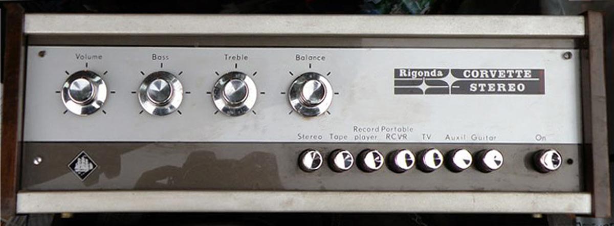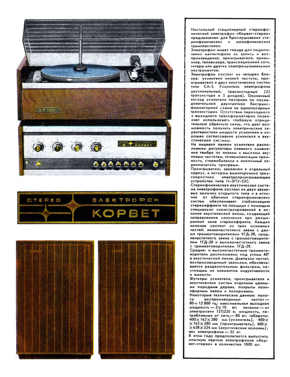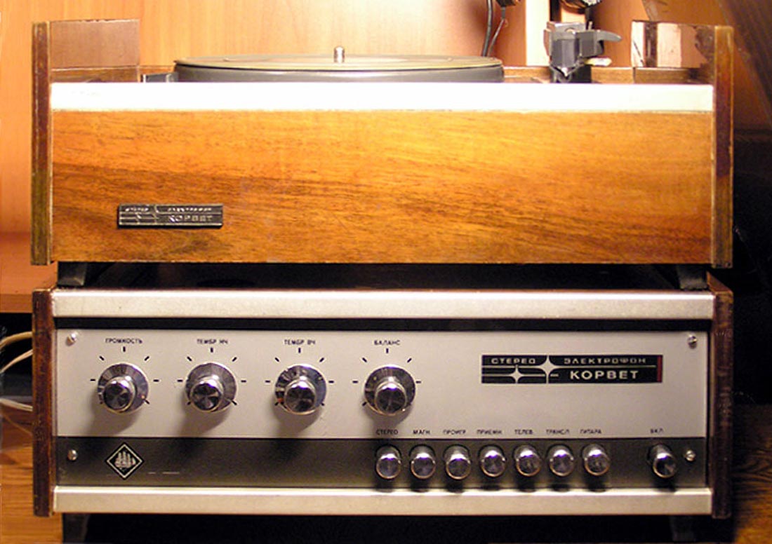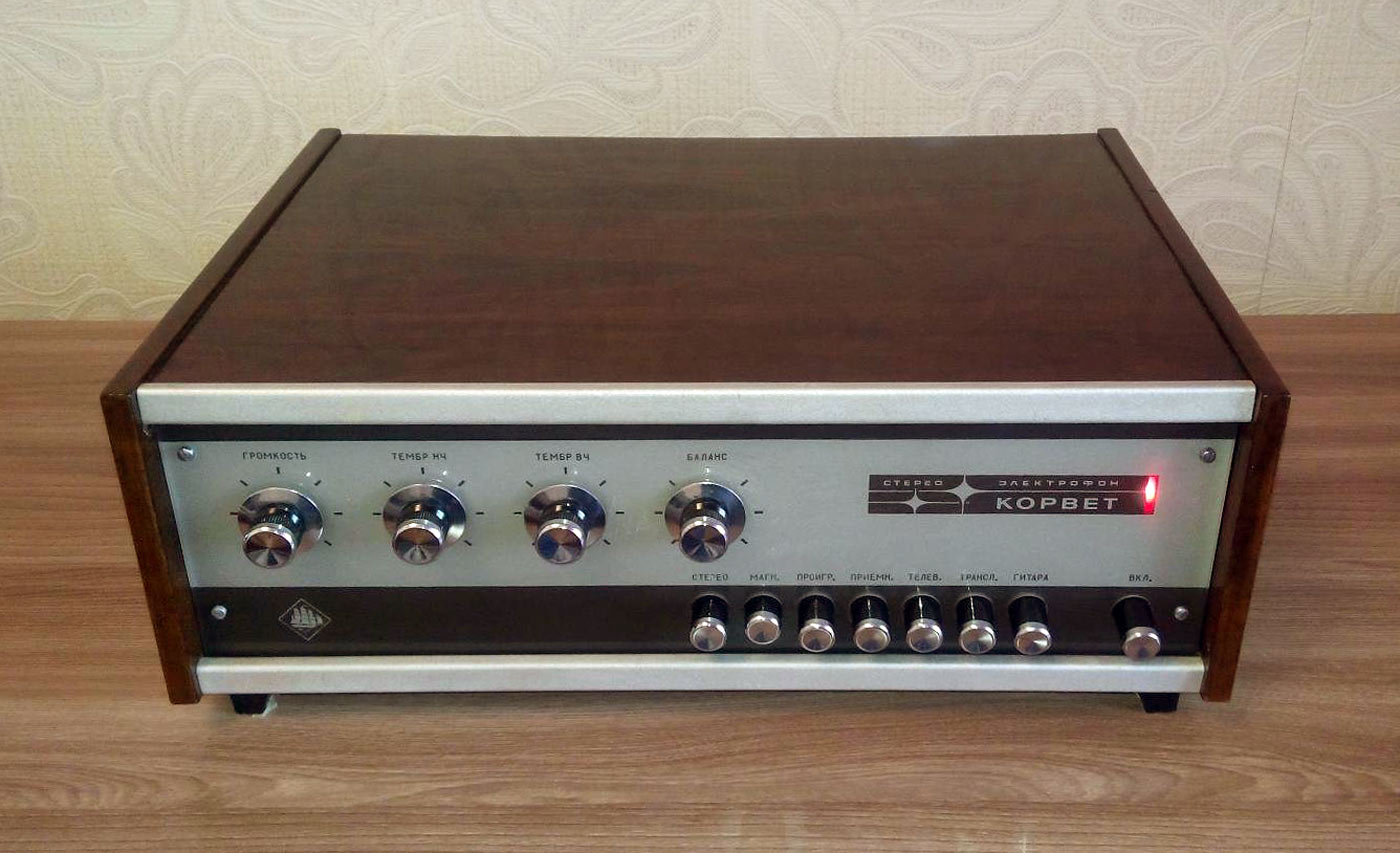 Электрофон сетевой транзисторный *Корвет-Стерео* с 1972 года выпускал Ленинградское ЛПТО *Водтрансприбор*. Блочный стереофонический электрофон 1-го класса **Корвет-стерео** (I-ЭФ-71С) - предназначен для проигрывания моно и стереофонических пластинок. Электрофон состоит из трёхскоростного ЭПУ типа II-ЭПУ-52С, стереофонического усилителя и двух АС. Усилитель выполнен на транзисторах, его максимальная выходная мощность 2х10 Вт, полоса рабочих частот на которую рассчитаны и АС - 80...12000 Гц. АС типа **СА-5** обеспечивают стабилизацию стереоэффекта по площади акустической линзой, создавая направленное излучение при расширенной зоне стереоэффекта. В каждой из АС размещено по четыре громкоговорителя: два типа 4ГД-28 и два типа 1ГД-28. Громкоговорители типа 1ГД-28 расположены в акустической линзе под углом 40°. Электрофон имеет гнёзда для внешних сигналов: это ЭПУ, приёмник, телевизор, трансляционная сеть, электрогитара и др. Питается электрофон от сети, потребляя мощность 60 Вт. Габариты блока электропроигрывателя и усилителя ЗЧ - 400х162х280 мм, каждой из АС - 400х628х228 мм. Вес 5,5, 6,5 и 10 кг соответственно. Электрофон по схемному решению, дизайну и конструкции на 1972 год был одним из самых совершенных электрофонов выпущенных радиопромышленностью. Электрофон выпускали до 1976 года, а электрическая схема с 1973 года выпуска несколько раз модернизировалась. Экспортный вариант модели именовался как *Rigonda-Corvette*.