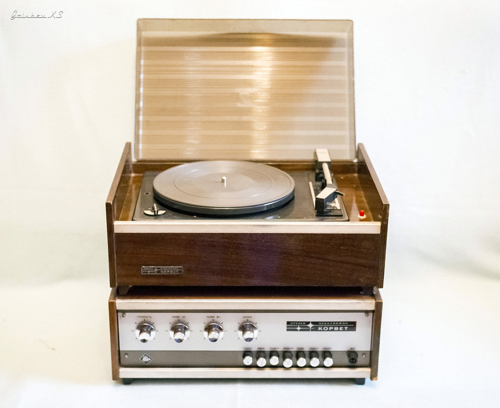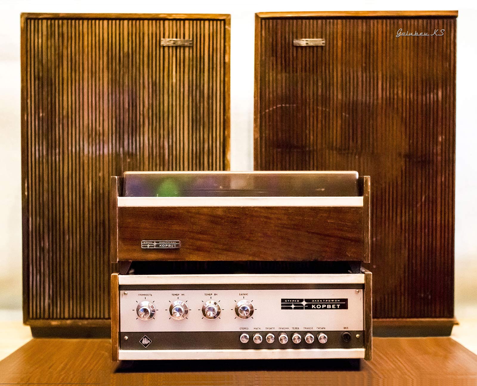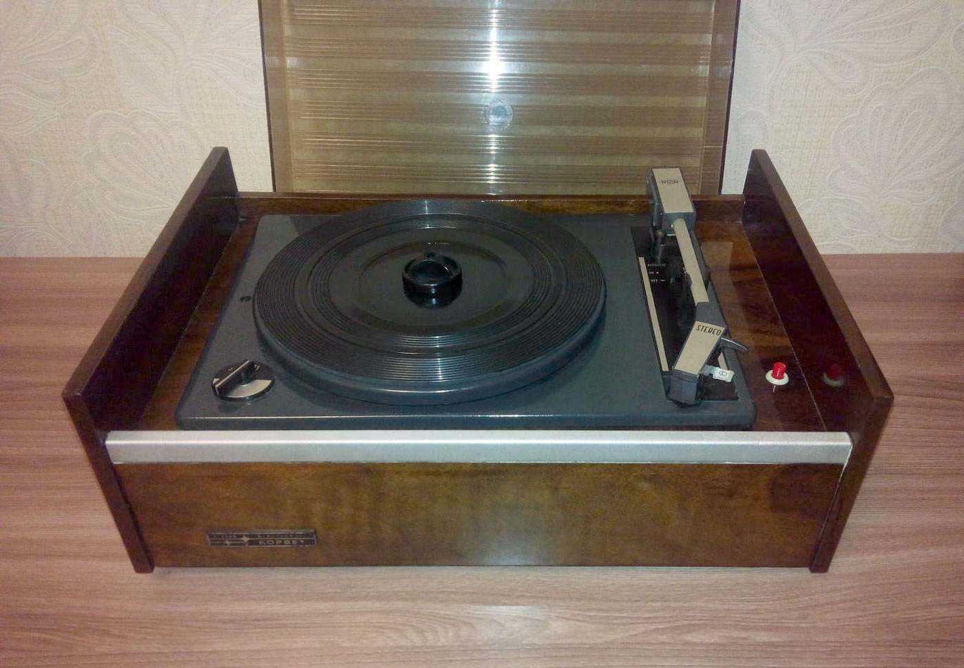Электрофон сетевой транзисторный *Корвет-Стерео* с 1972 года выпускал Ленинградское ЛПТО *Водтрансприбор*. Блочный стереофонический электрофон 1-го класса **Корвет-стерео** (I-ЭФ-71С) - предназначен для проигрывания моно и стереофонических пластинок. Электрофон состоит из трёхскоростного ЭПУ типа II-ЭПУ-52С, стереофонического усилителя и двух АС. Усилитель выполнен на транзисторах, его максимальная выходная мощность 2х10 Вт, полоса рабочих частот на которую рассчитаны и АС - 80...12000 Гц. АС типа **СА-5** обеспечивают стабилизацию стереоэффекта по площади акустической линзой, создавая направленное излучение при расширенной зоне стереоэффекта. В каждой из АС размещено по четыре громкоговорителя: два типа 4ГД-28 и два типа 1ГД-28. Громкоговорители типа 1ГД-28 расположены в акустической линзе под углом 40°. Электрофон имеет гнёзда для внешних сигналов: это ЭПУ, приёмник, телевизор, трансляционная сеть, электрогитара и др. Питается электрофон от сети, потребляя мощность 60 Вт. Габариты блока электропроигрывателя и усилителя ЗЧ - 400х162х280 мм, каждой из АС - 400х628х228 мм. Вес 5,5, 6,5 и 10 кг соответственно. Электрофон по схемному решению, дизайну и конструкции на 1972 год был одним из самых совершенных электрофонов выпущенных радиопромышленностью. Электрофон выпускали до 1976 года, а электрическая схема с 1973 года выпуска несколько раз модернизировалась. Экспортный вариант модели именовался как *Rigonda-Corvette*.