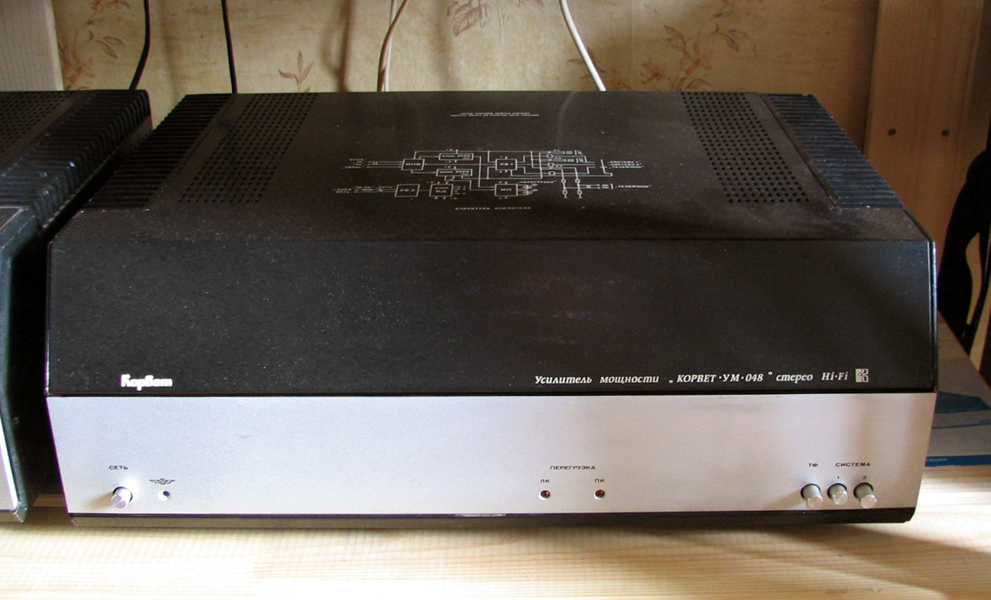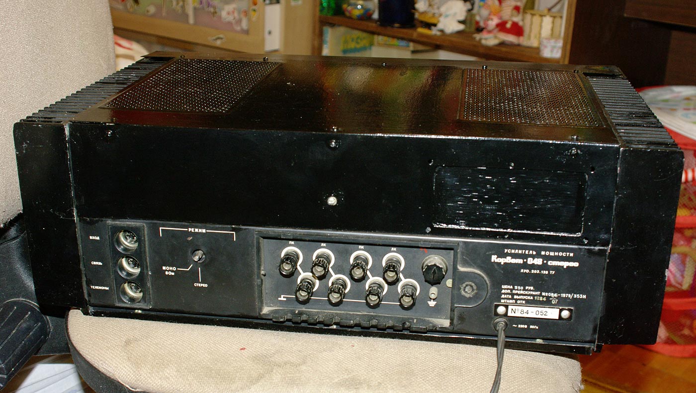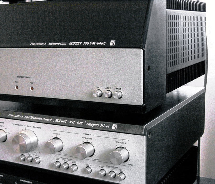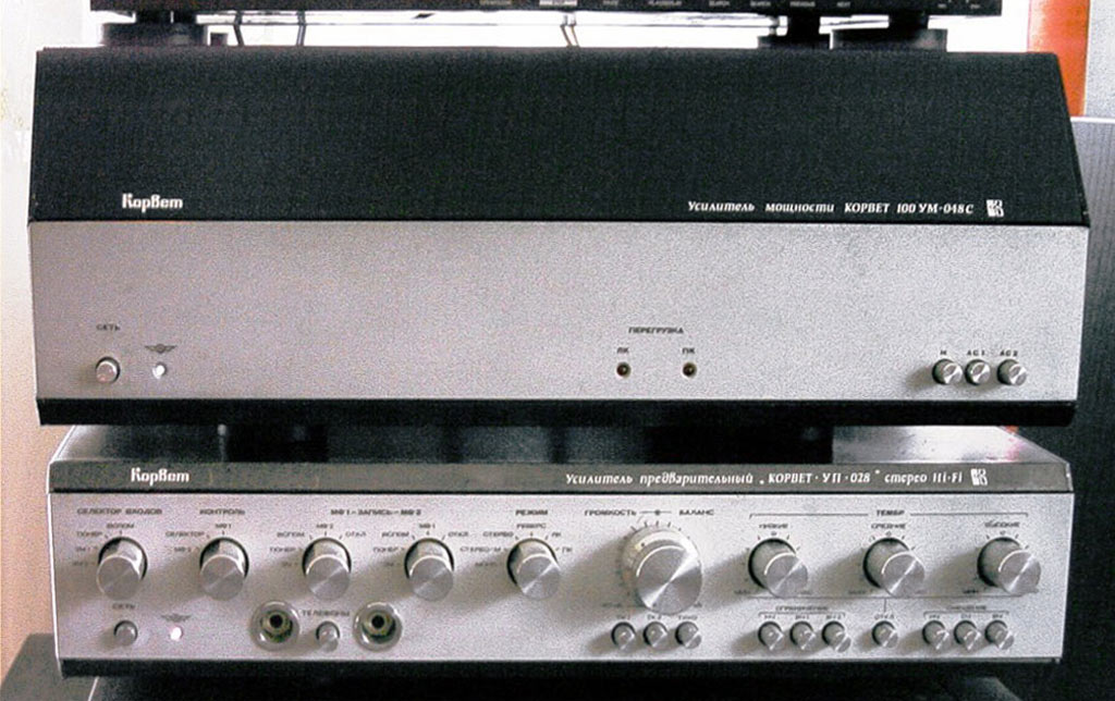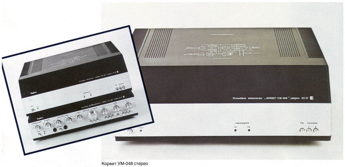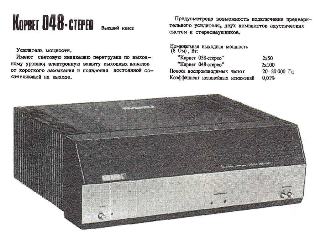 Стереофонический усилитель мощности *Корвет УМ-048С* с 1984 года выпускал Кировский завод *Ладога*. УМ предназначен для высококачественного усиления сигналов с предварительного усилителя высшего класса. Номинальная выходная мощность 2х100 Вт. Диапазон воспроизводимых частот 20...25000 Гц. КНИ менее 0,1%. Уровень фона -100 дБ. Потребляемая мощность - 100...300 Вт. Габариты усилителя 480х180х377 мм. Масса 22 кг. С 1987 года усилитель именовался как *Корвет 100УМ-048С*.