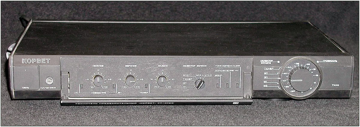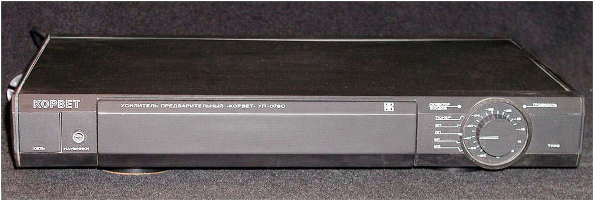 Усилитель предварительный *Корвет УП-078С* с начала 1991 года выпускал Кировский завод *Ладога*. Стереофонический усилитель предварительный **Корвет УП-078С** предназначен для коммутации, усиления и частотной коррекции сигналов с электропроигрывателя с электромагнитной или же электродинамической головкой звукоснимателя, проигрывателя компакт-дисков, тюнера и двух магнитофонов. Модель имеет предельно низкие собственные шумы и искажения, широкий диапазон рабочих частот и удобство в использовании. Более подробно о предварительном усилителе в инструкциях по эксплуатации.
