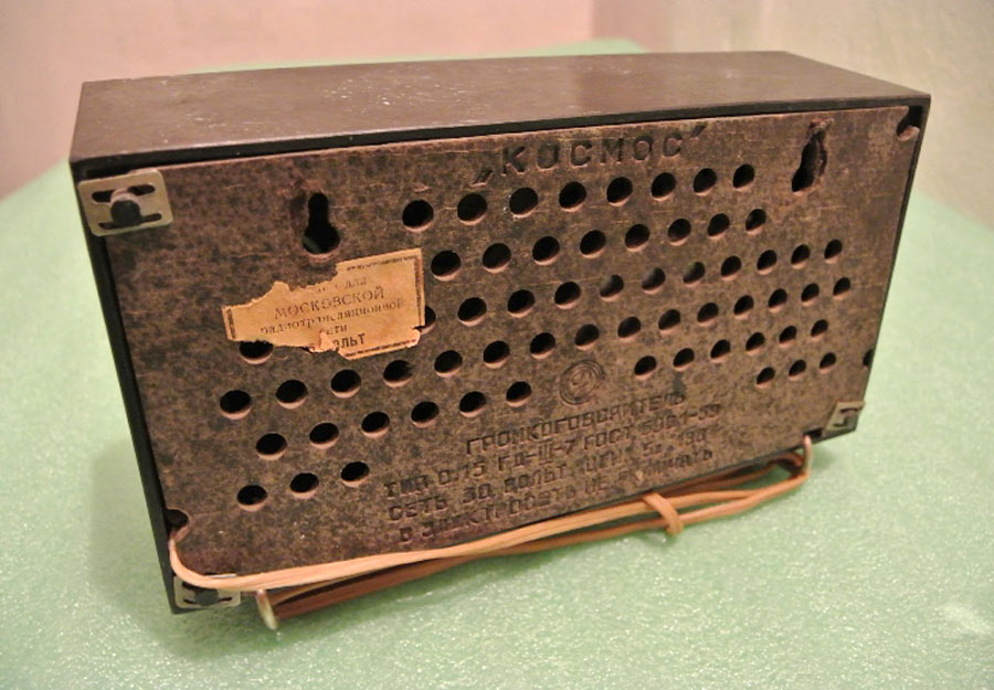 Абонентский громкоговоритель "Космос" с 1963 года выпускал Ленинградский завод Радиоизделий. Это стандартный абонентский громкоговоритель, предназначенный для воспроизведения местной радиопрограммы, передаваемой по трансляционной линии. Входное напряжение 30 (или 15) вольт. Тип - 0,15ГД-III-7. Потребляемая мощность 0,15 Вт. Диапазон воспроизводимых звуковых частот - 200...4000 Гц. Среднее звуковое давление 0,2 H/м2. Входное сопротивление 6 кОм. Габариты абонентского громкоговорителя - 200х100х65 мм. Масса - 750 гр. Розничная цена - 5 рублей. С 1963 года и Киевский завод электромеханики выпускал абонентский громкоговоритель "Космос", который кроме цены (3 р.50 к.) не отличался от описанного (смотри последнее фото).