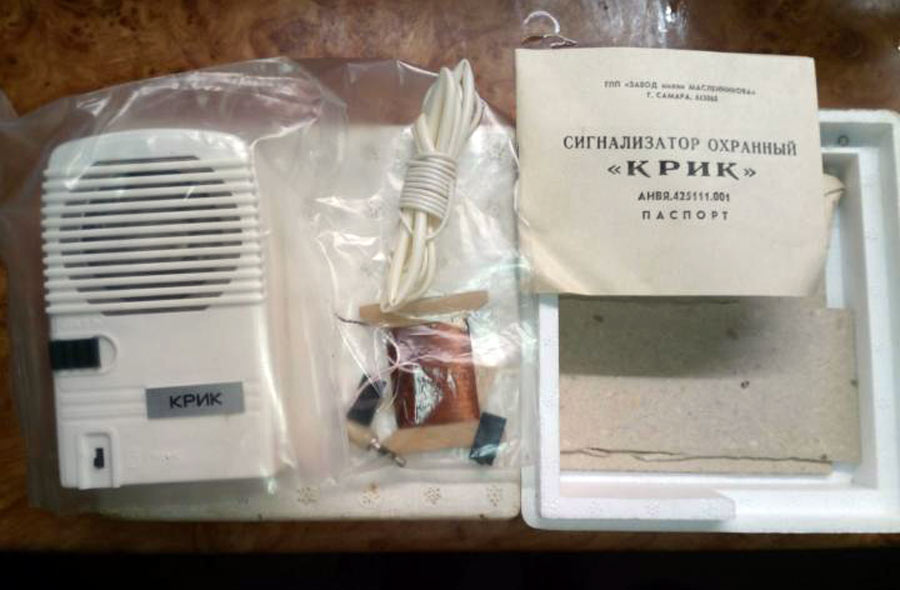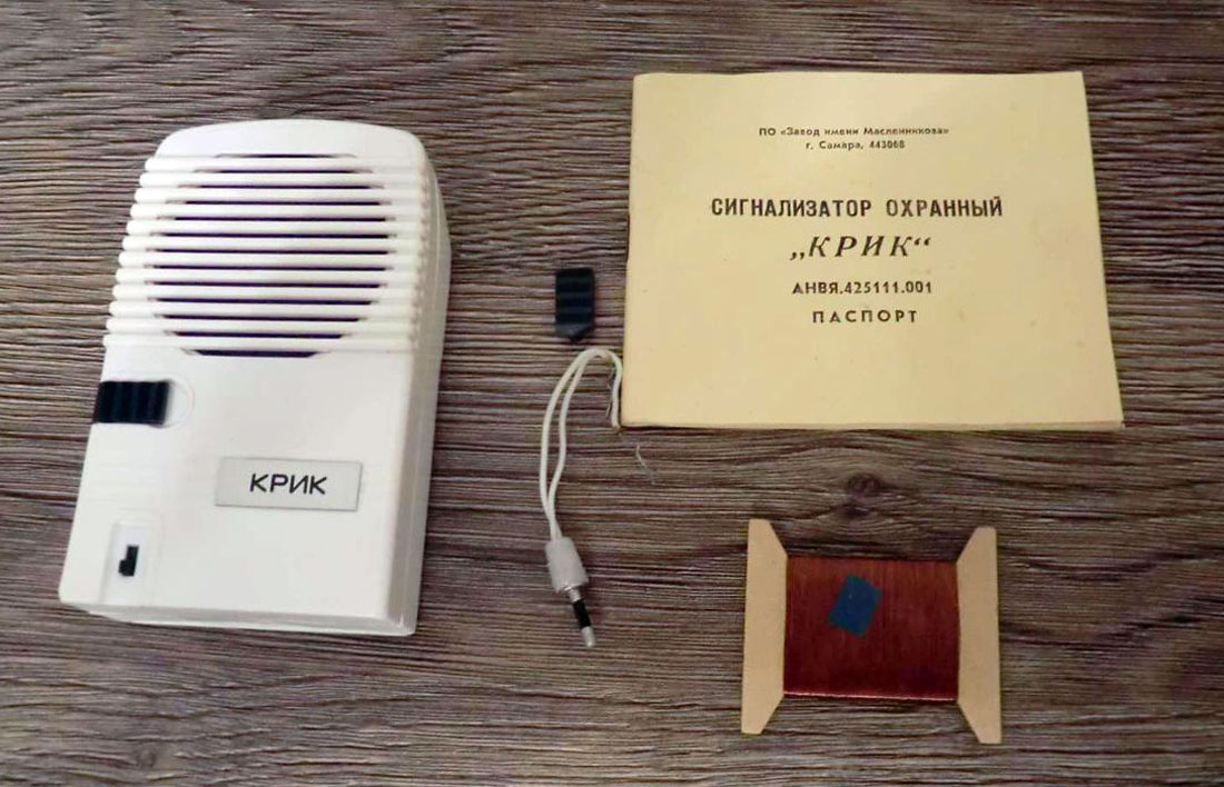 Сигнализатор охранный *Крик* выпускался предположительно с 1987 года Самарским ПО *Завод имени Масленникова*. Сигнализатор служит для выдачи звукового сигнала типа *сирена* при замыкании контактов датчиков, при изменении ориентации сигнализатора или при выдёргивании чеки.