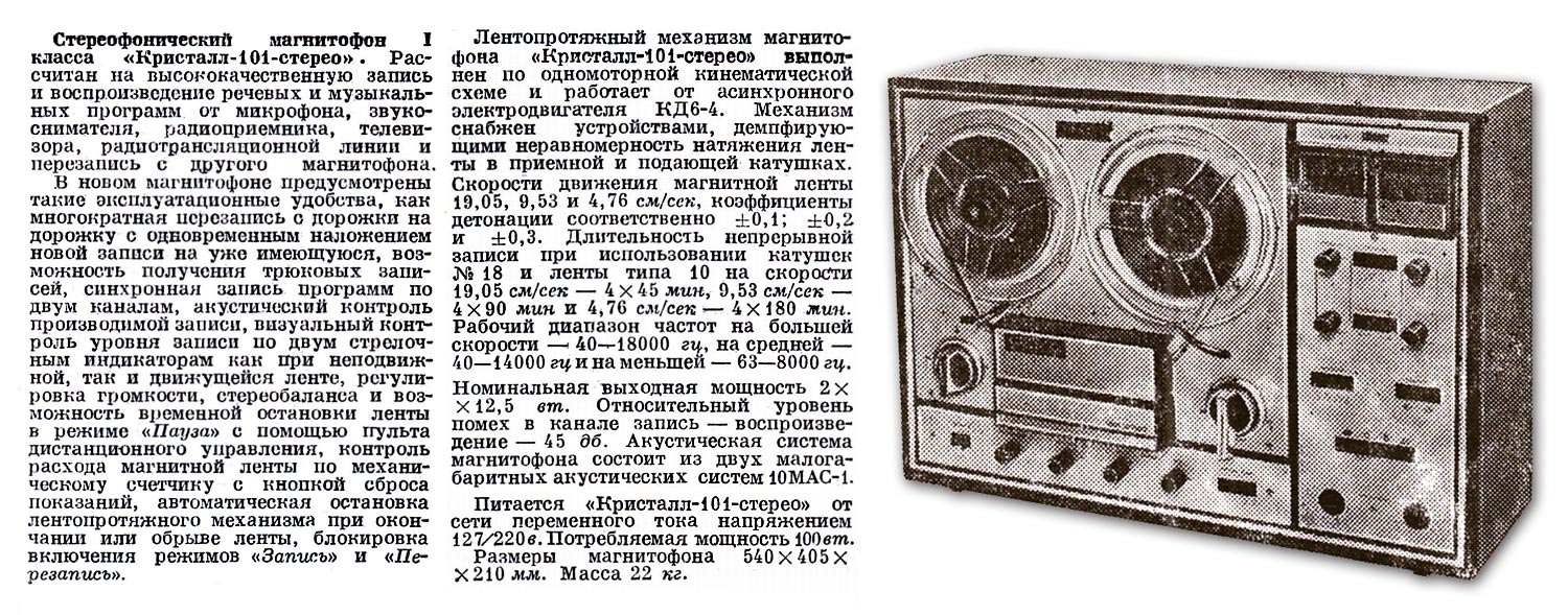 Сетевой катушечный магнитофон *Кристалл-101-стерео* подготовлен к выпуску в 1973 году. Изготовитель не установлен. На базе этой модели с 1975 года выпускался серийный магнитофон *Ростов-101-стерео*, практически её полный аналог. Магнитофон *Кристалл-101-стерео* рассчитан на высококачественную эапись и воспроизведение речевых или музыкальных программ от микрофона, звукоснимателя, приёмника, телевизора, радиотрансляционной линии или перезапись с другого магнитофона. Магнитофон *Кристалл-101-стерео* имеет такие функции как: перезапись с дорожки на дорожку, с одновременным наложением новой записи на уже имеющуюся; возможность получения трюковых записей; синхронную запись программ по двум каналам; акустический контроль записи; визуальный контроль записи по двум стрелочным индикаторам при неподвижной и движущейся ленте; регулировку уровня громкости; стереобаланса и возможность временной остановки ленты в режиме *Пауза* с проводного ПДУ; контроль расхода ленты по механическому счетчику; автоматическую остановку ЛПМ при окончании или обрыве ленты; блокировку включения режимов запись и перезапись. Лентопротяжный механизм аппарата выполнен по одномоторной кинематической схеме и работает от асинхронного электродвигателя КД6-4. ЛПМ снабжён устройствами демпфирующими неравномерность натяжения ленты в катушках. Скорости движения магнитной ленты 19,05, 9,53 и 4,76 см/сек, коэффициенты детонации соответственно ±0,1, ±0,2 и ±0,3%. Длительность непрерывной записи или воспроизведения при использовании катушек №18, ленты типа 10 на скорости 19,05 см/сек 4х45 мин, 9,53 см/сек 4х90 мин и 4,76 см/сек 4х180 мин. Диапазон рабочих звуковых частот на большей скорости 40...18000 Гц, средней 40...14000 Гц и на меньшей 63...8000 Гц. Номинальная выходная мощность 2х12,5 Вт. Относительный уровень помех в канале запись-воспроизведение 45 дБ. Акустическая система магнитофона состоит из 2-х отдельных малогабаритных АС типа *10МАС-1*. Питание осуществляется от сети 127 или 220 В. Потребляемая мощность 100 Вт. Размеры магнитофона 540х405х210 мм. Масса 22 кг.