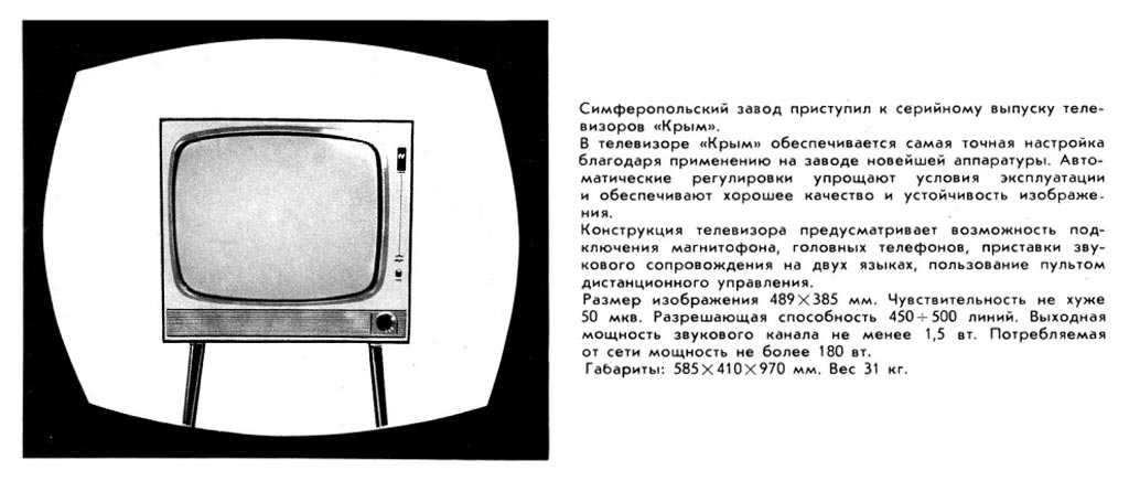 Телевизор *Крым* с осени 1968 года выпускал *Симферопольский завод телевизоров имени 50-летия СССР*. Телевизор **Крым** (тип УЛТ-59-II-1) выпускали по унифицированной технологии на радиолампах в настольном и напольном оформлениях, с разными вариантами отделки корпуса и передней панели. Телевизор обеспечивал приём в любом из 12-ти каналов. Его передняя часть выполнена с асимметричным расположением экрана, а нижняя сделана в виде декоративной решетки из пластмассы, за которой расположены два громкоговорителя 1ГД-18 с разнесёнными резонансными частотами. Сзади телевизор закрыт пластмассовой стенкой с отверстиями. Спереди в нижней правой части футляра находится ручка ПТК, немного выше и правее включатель и выключатель электрической сети. Остальные регуляторы находятся в верхней правой части футляра. Благодаря применению автоматических регулировок, телевизор прост и удобен в обращении. В модели применён кинескоп 59ЛК2Б. Чувствительность телевизора 50 мкВ. Номинальная выходная мощность канала звука 1,5 Вт. Диапазон воспроизводимых частот 100...10000 Гц. Потребляемая мощность 180 Вт. Габариты настольного варианта телевизора 620 х 585 х 380 мм. Масса 36 кг. Габариты напольного варианта - 620 х 970 х 380 мм. Масса 38 кг. С середины 1969 года завод выпускал телевизор *Крым-202* (УЛПТ-59), который по оформлению и конструкции практически не отличался от описанного, но в электрическую схему, а именно в канал звукового сопровождения были внедрены транзисторы.