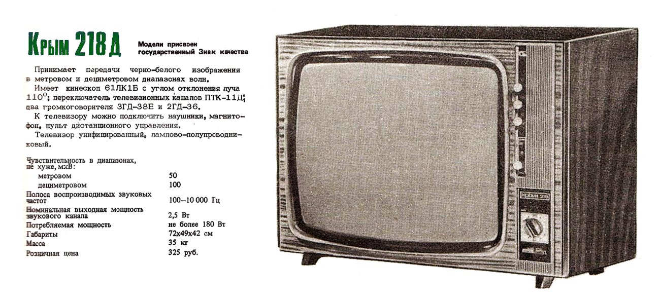 Телевизионный приёмник чёрно-белого изображения *Крым-218* с 1976 года выпускал Симферопольский завод телевизоров имени 50-летия СССР. Унифицированный телевизор 2-го класса **Крым-218** (УЛПТ-61-II-22) создан на базе телевизора **Крым-217**, ему аналогичен, отличаясь лишь оформлением. Телевизор выпускали без блока ДМВ но с возможностью для его установки. Футляр телевизора отделан ценными породами дерева и пластмассой. Телевизор работает на любом из 12-ти каналов. Основная часть схемы выполнена печатным монтажом на платах из фольгированного гетинакса и размещена на шасси. АС аппарата состоит из двух фронтальных громкоговорителей типа 3ГД-38Е и 1ГД-36. Имеются разъёмы для подключения головных телефонов и магнитофона на запись звука. Яркость и громкость на расстоянии до 5 метров можно регулировать с помощью пульта дистанционного управления (в комплект не входит). Благодаря автоматическим регулировкам АПЧГ, АПЧ и Ф и стабилизации размеров изображения телевизор прост в обращении. Все параметры аналогичны унифицированным телевизорам 2-го класса.