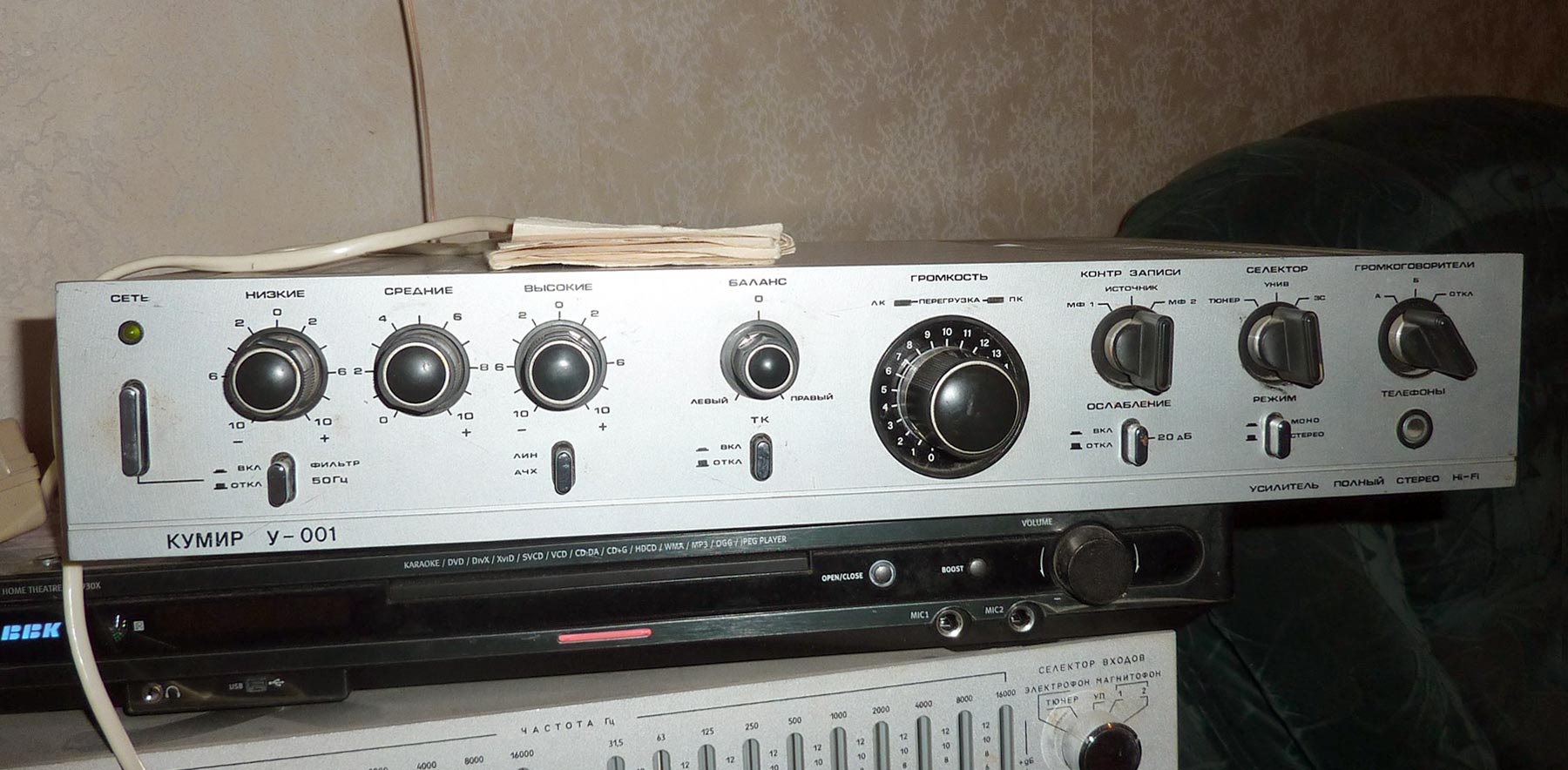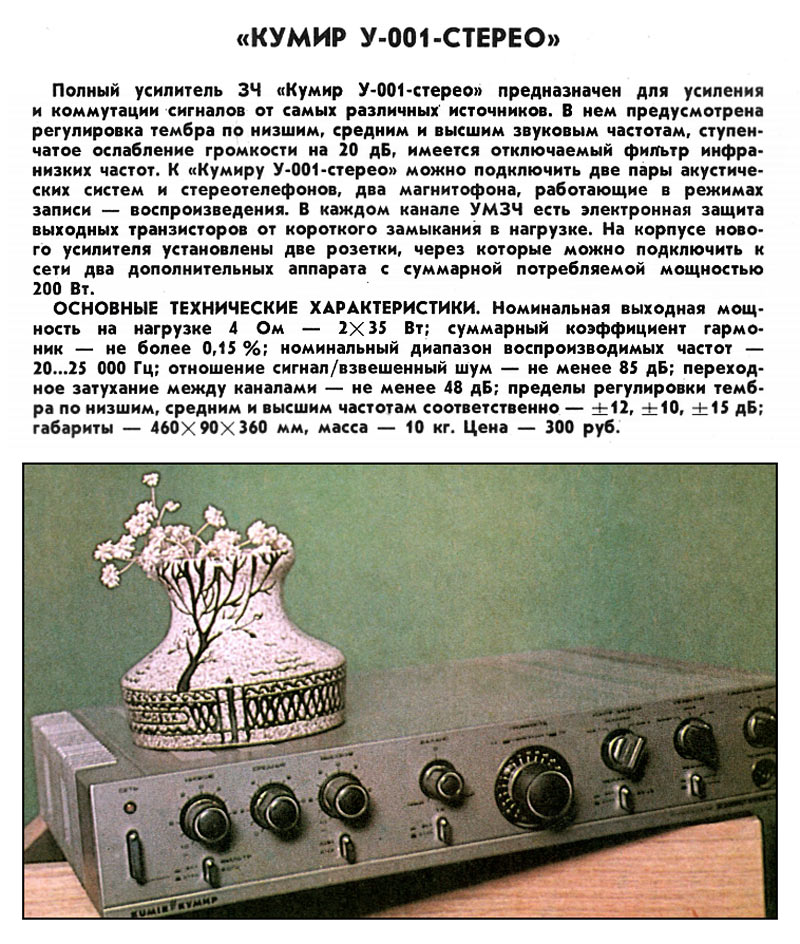 Стереофонический полный усилитель *Кумир У-001-стерео* с 1988 года выпускал Ульяновский механический завод. Усилитель **Кумир У-001-стерео** предназначен для усиления и коммутации сигналов от различных источников. В нём предусмотрена регулировка тембра по низшим, средним и высшим частотам, ступенчатое ослабление уровня громкости на 20 дБ, есть отключаемый фильтр инфранизких частот. К усилителю *Кумир У-001-стерео* можно подключить две пары АС и стереотелефонов, два магнитофона работающие в режимах записи и воспроизведения. В каждом канале предусмотрена электронная защита выходных транзисторов от КЗ в нагрузке. На корпусе установлены розетки к которым подключить к сети два аппарата с общей мощностью 200 Вт. Номинальная выходная мощность 2х35 Вт (4Ом). Коэффициент гармоник 0,15%. Диапазон рабочих частот 20...25000 Гц. Переходное затухание между каналами 48 дБ. Габариты усилителя 460х90х360 мм. Его масса 10 кг. Цена 300 рублей.