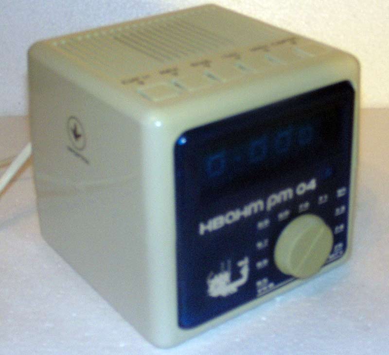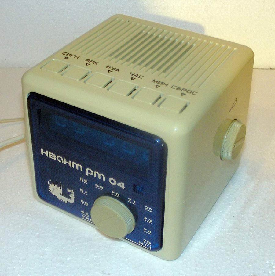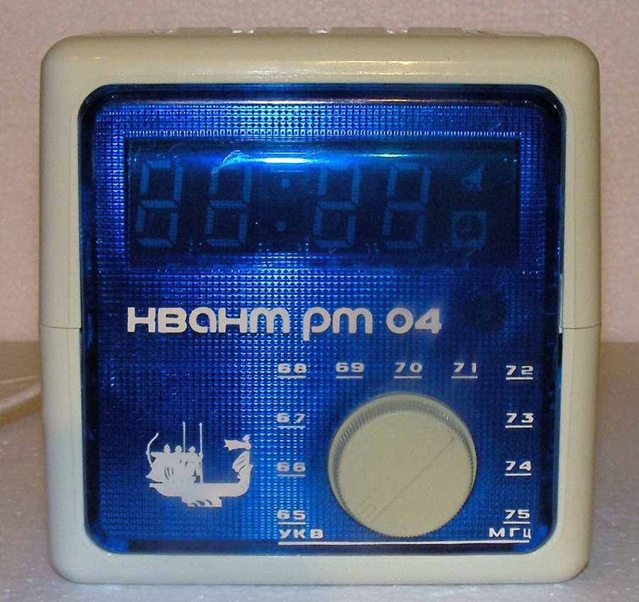 Стационарный транзисторный радиоприёмник *Квант РТ-04* выпускался с 1992 года Киевским заводом *Буревестник*. Сувенирное устройство *Квант РТ-04* предназначено для работы в качестве электронных часов, таймера, будильника и радиоприёмника, который работает в УКВ диапазоне 65...75 МГц. Чувствительность приёмника с антенной (отрезок провода) 10 мкВ. Диапазон воспроизводимых частот 200...5000 Гц. Номинальная выходная мощность 100 мВт, максимальная 200 мВт. Питание от сети 220 в. Резервное питание для хода электронных часов батарея типа *Крона*.