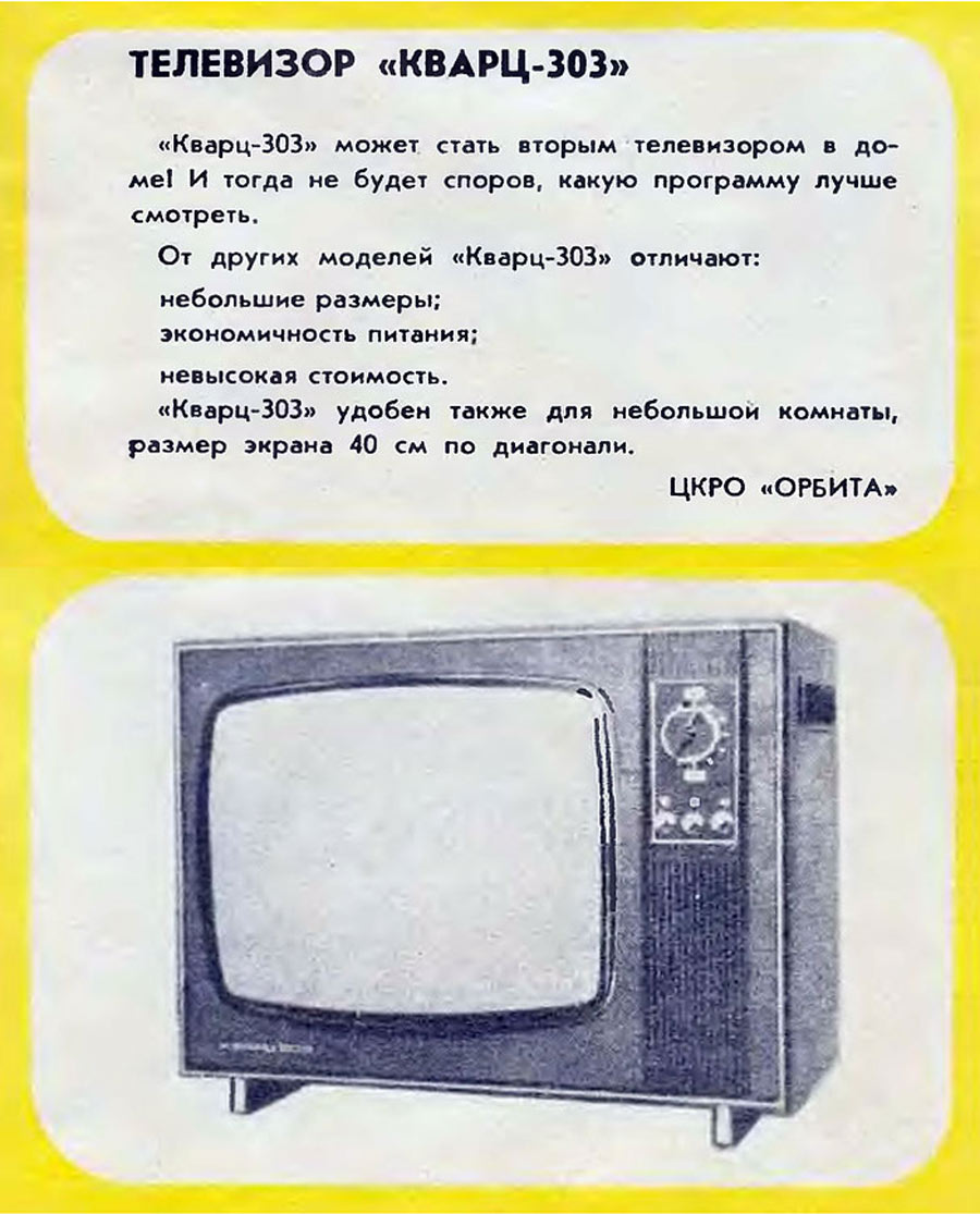 Телевизор ч/б изображения *Кварц-303* с 1973 года выпускал Омский телевизионный завод. Унифицированный телевизор *Кварц-303* (УЛТ-40-III) стал основательной модернизацией моделей **Кварц**. Выпускали аппарат в настольном оформлении с различными вариантами отделки корпуса. Телевизор работает в любом из 12-ти каналов. Органы управления расположены справа на передней панели: это рукоятка гетеродина и ПТК, выключатель сети, громкость, яркость, контрастность. На заднюю стенку ТВ выведены регуляторы линейности по вертикали, размера по вертикали и горизонтали, ручки частоты кадров, строк, гнёзда для головных телефонов. Система АРУ держит качественное изображение при изменении уровня сигнала. Система АПЧ и Ф обеспечивает устойчивость синхронизации при помехах. Конструкция делает удобным доступ к монтажу при его обслуживании. Функциональные блоки выполнены печатным способом. Сзади телевизор закрыт стенкой с вентиляционными отверстиями. Гнёзда для головных телефонов можно использовать для записи звукового сопровождения на магнитофон. Акустическая система состоит из громкоговорителя 1ГД-36. Питание осуществляется от сети 110, 127 или 220 вольт. Кинескоп применён - 40ЛК1Б. Чувствительность телевизора 200 мкВ. Номинальная выходная мощность 0,5 Вт. Диапазон частот воспроизводимых акустической системой модели 150...7000 Гц. Потребляемая от сети мощность не более 140 Вт. Размеры телевизора 526х460х380 мм. Его масса 25 кг. Розничная цена 140 рублей.