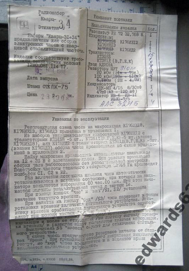 Радионабор *Кварц-34* выпускался предположительно с 1987 года. Набор предназначен для сборки электронных часов с кварцевой стабилизацией частоты.