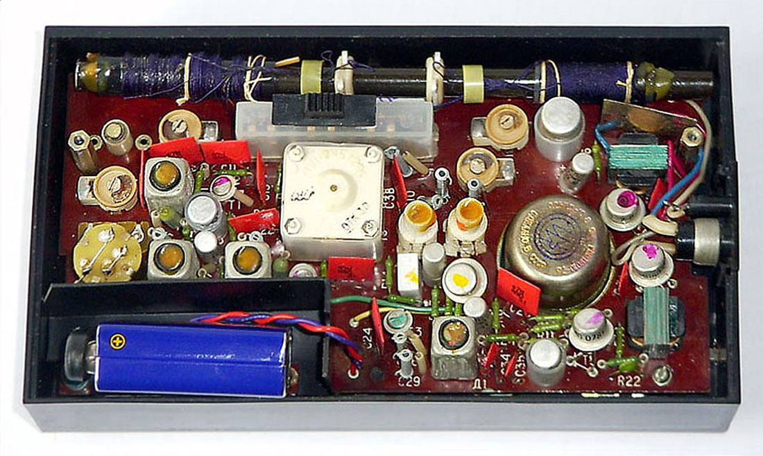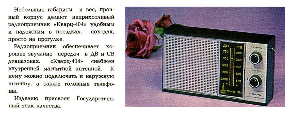 Переносной радиоприёмник *Кварц-404* с 1973 года выпускал Кыштымский радиозавод. С 1972 года Кыштымский радиозавод приступил к серийному выпуску малогабаритного переносного транзисторного радиоприёмника 4-го класса **Кварц-403**. В июле 1973 года он был заменён радиоприёмником **Кварц-404**, а с начала 1974 года радиоприёмником **Кварц-405**, при этом выпуск модели **Кварц-404** продолжался до 1982 года, а в 1979 году в связи с присвоением радиоприёмнику олимпийской символики он был модернизирован в приёмник **Кварц-404М**, в 1980 году вместо буквы **М** приёмнику было присвоено наименование **Кварц-404** Олимпийский. Все модели построены на базе радиоприёмника **Сокол-403** имеют одинаковые электрические и монтажные схемы и отличаются только внешним оформлением. Они работают в диапазонах ДВ и СВ. Приём производится на внутреннюю магнитную или при необходимости на внешнюю антенну. Чувствительность на внутреннюю антенну 3,0 мВ/м в диапазоне ДВ и 1,0 мВ/м в СВ. Избирательность по соседнему каналу 20 дБ в ДВ диапазоне и 16 дБ в СВ, ослабление зеркального канала 20 дБ. АРУ обеспечивает изменение напряжения сигнала на выходе на 10 дБ, при изменении на входе на 26 дБ. Диапазон ручной регулировки громкости -40 дБ. Диапазон звуковых частот 450...3150 Гц, среднее звуковое давление 0,15 Н/м2, номинальная выходная мощность 100 мВт. Питание от батареи **Крона** или аккумулятора 7Д-0,1. Работоспособность приёмников сохраняется при снижении напряжения до 5,6 В. Размеры приёмников - 170 х 100 х 40 мм, их масса 480 грамм. Радиоприёмник *Кварц-404* выпускался в трёх вариантах цветового оформления. Основной чёрный, но были красный и голубой варианты. Чехол имел два варианта оформления.
