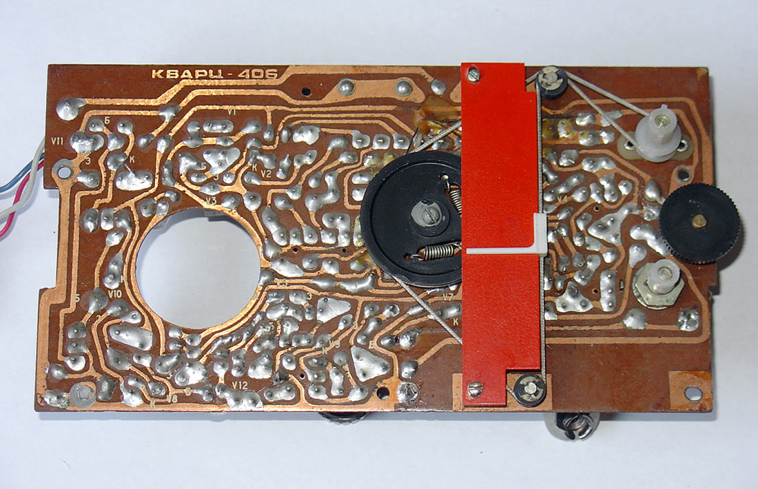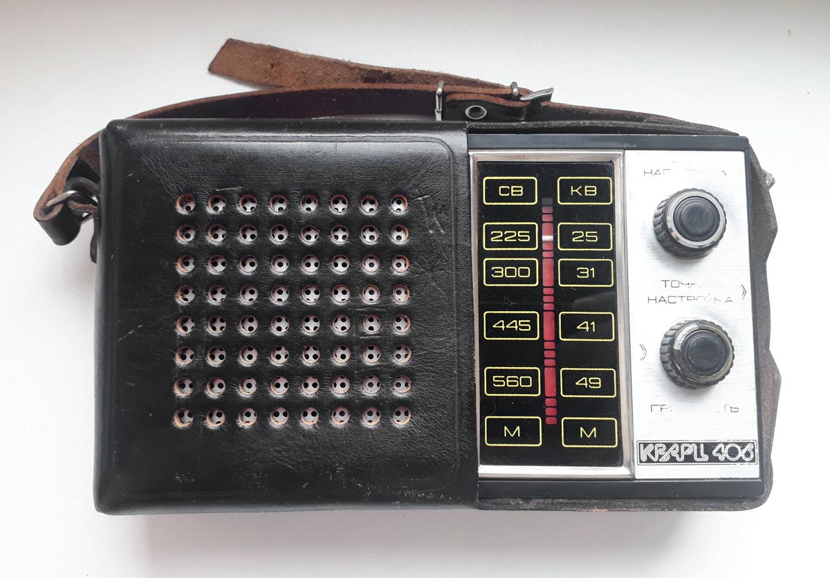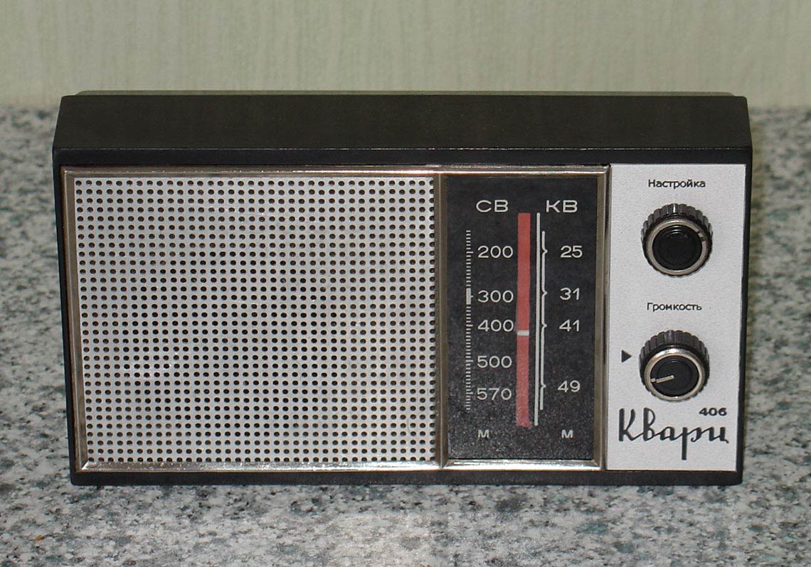 Портативный радиоприёмник *Кварц-406* с начала 1980 года выпускал Кыштымский радиозавод. Радиоприёмник **Кварц-406** или его экспортный вариант **Quartz-406** создан на основе радиоприёмника **Кварц-404** и кроме диапазона КВ, вместо ДВ по построению своей электрической схемы и оформлению схож с ним. Радиоприёмник *Кварц-406* рассчитан на приём радиовещательных станций работающих в 2-х диапазонах СВ - 525...1605 кГц и КВ - 5,75...12,2 МГц. Приём в обоих диапазонах производится на магнитную антенну. Чувствительность в диапазонах СВ - 1,0 мВ/м, КВ - 0,05 мВ/м. Селективность по соседнему каналу 20 дБ. Диапазон воспроизводимых звуковых частот 450...3150 Гц. Номинальная выходная мощность 100 мВт. Питание осуществляется от батареи **Крона** или от аккумулятора **7Д-0,1**. Габариты модели 170 х 100 х 40 мм. Масса 480 грамм без батареи.