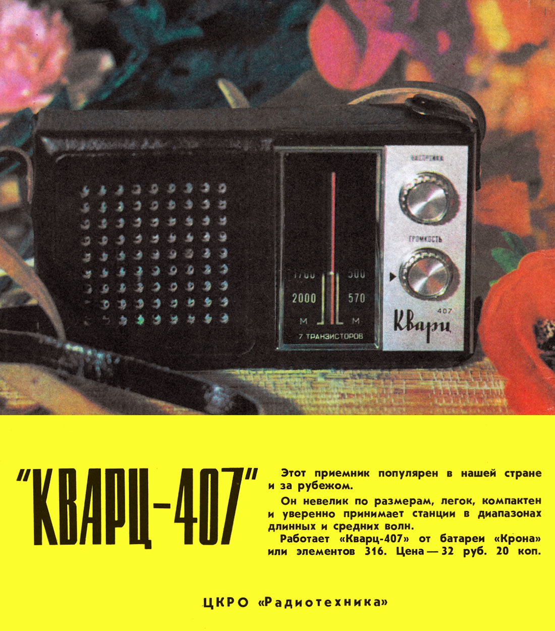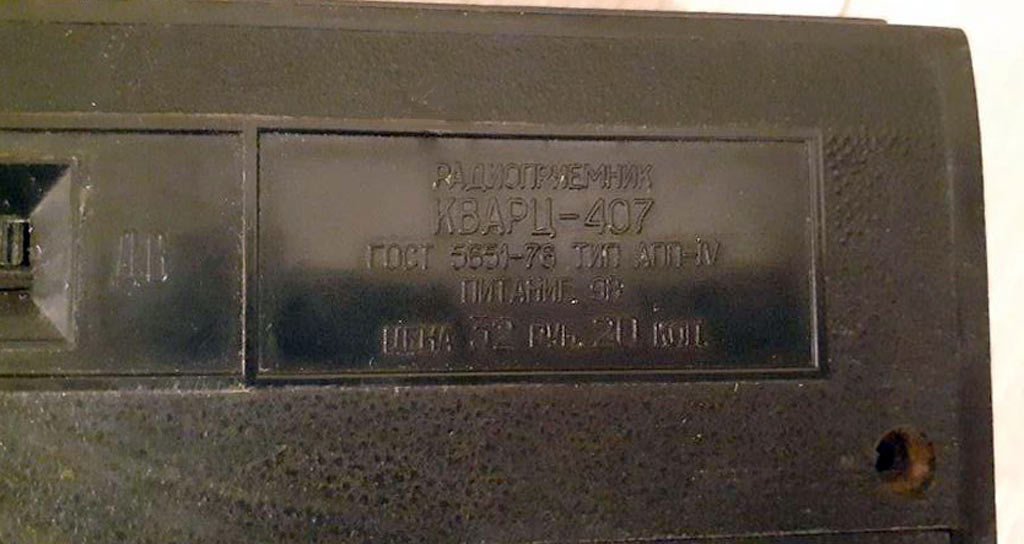 Портативный радиоприёмник *Кварц-407* с 1977 года выпускал Кыштымский радиозавод. Приёмник создан на базе модели **Кварц-404** и сходен с ним. Он рассчитан на приём в диапазонах ДВ и СВ. Приём производится на магнитную или внешнюю антенну. Чувствительность на магнитную антенну 3,0 мВ/м, в диапазоне ДВ и 1,0 мВ/м в СВ. Селективность при расстройке на ±10 кГц - 20 дБ в ДВ диапазоне и 16 дБ в СВ, ослабление зеркального канала 20 дБ. АРУ обеспечивает изменение напряжения сигнала на выходе приёмника на 10 дБ при изменении напряжения входа на 26 дБ. Диапазон регулировки громкости 40 дБ. Диапазон воспроизводимых громкоговорителем частот 450...3150 Гц. Номинальная выходная мощность 100 мВт. Питание от батареи *Крона* или аккумулятора *7Д-0,1*. Работоспособность приёмника сохраняется при падении напряжения до 5 вольт. Габариты радиоприёмника - 170 х 100 х 40 мм. Масса 480 грамм без батареи. Цена модели 32 рубля 20 копеек.