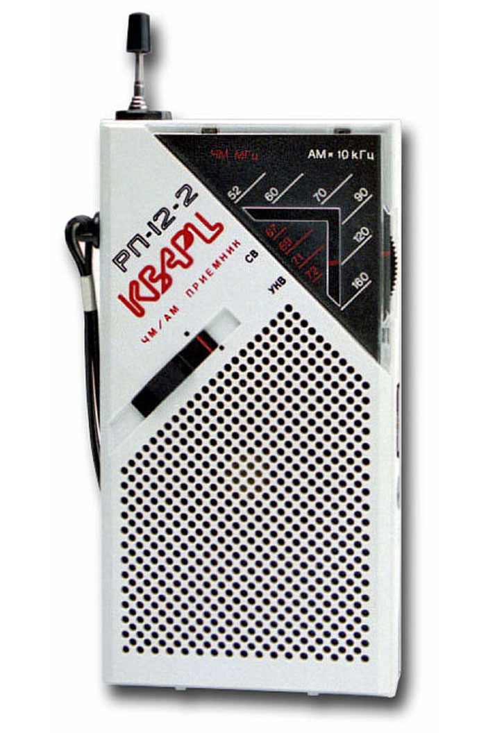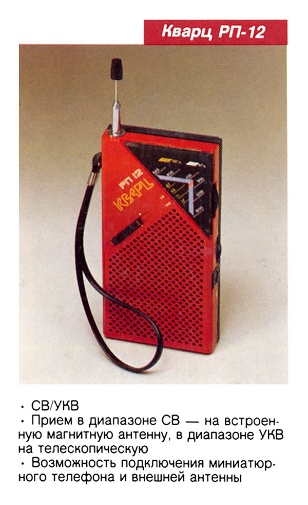 Портативный радиоприёмник *Кварц РП-12* с 1991 года выпускал Кыштымский радиозавод. Малогабаритный транзисторный радиоприёмник **Кварц РП-12** (1) и его варианты с номерами 2,3,4 предназначен для приёма в диапазонах ДВ или СВ и УКВ ЧМ или FM. Цифра обозначала сочетание диапазонов. Прослушивание программ возможно на громкоговоритель или головной телефон ТМ-4. В диапазонах ДВ, СВ приём ведется на внутреннюю магнитную антенну, а в диапазоне УКВ на штыревую телескопическую. Питание осуществляется от 3-х элементов A-316. Экспортный вариант именовался **Quartz R12** соответственно дополненный цифрой, поставлялся на экспорт и радиоприёмник с наименованием *Кварц-12*. Диапазоны: ДВ 148...285 кГц; СВ 525...1607 кГц; УКВ 65,8...74,0 МГц или 88...108 МГц. Чувствительность в диапазонах ДВ 2, СВ 1,5, УКВ 0,2 мВ/м. Диапазон воспроизводимых звуковых частот 450...3150 Гц. Максимальная выходная мощность 150 мВт. Габариты приёмника 152х79х28 мм. Масса 290 гр. Для России и стран бывшего СССР в основном выпускался радиоприёмник *Кварц РП-12-2*.