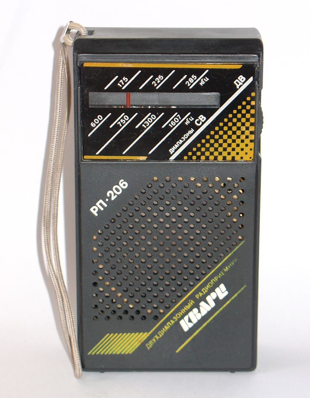 Портативный радиоприёмник *Кварц РП-206* с 1992 года выпускал Кыштымский радиозавод. Радиоприёмник **Кварц РП-206** - малогабаритный СВ и ДВ супергетеродин, собранный на одной многофункциональной микросхеме К-174ХА10 и содержит небольшое количество деталей. Диапазоны частот: ДВ 148...285 кГц, СВ 525...1607 кГц. Чувствительность в диапазонах ДВ 2,5 мВ/м, СВ 1,3 мВ/м. Избирательность 30 дБ. Диапазон воспроизводимых частот 450...4000 Гц. Максимальная выходная мощность 150 мВт. Габариты приёмника 74х158х37 мм, вес с батареями 340 гр.