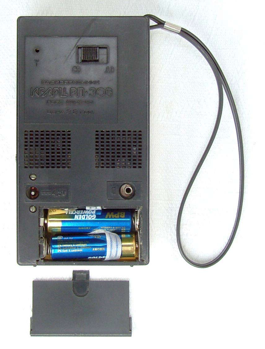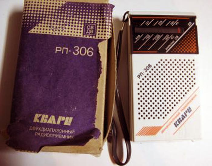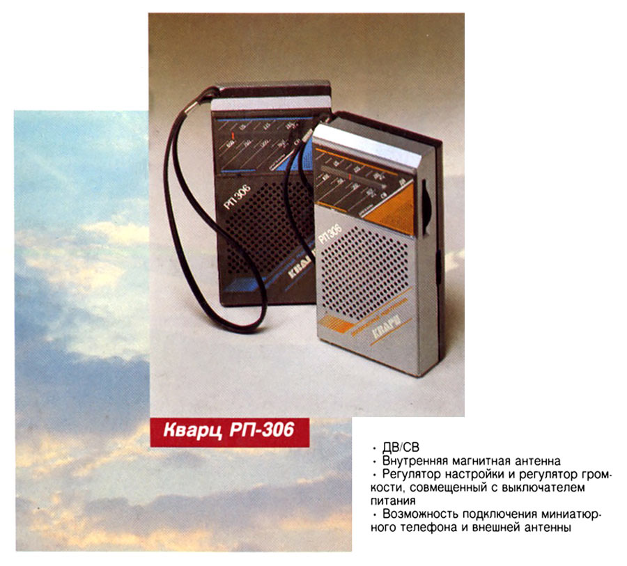 Портативный радиоприёмник *Кварц РП-306* с 1987 года выпускал Кыштымский радиозавод. Приёмник представляет собой СВ, ДВ супергетеродин, собранный на микросхеме К174ХА10, полевом транзисторе и с небольшим количеством элементов. Чувствительность в диапазоне ДВ 2,5, СВ 1,3 мВ/м. Селективность в обоих диапазонах 30 дБ. Диапазон воспроизводимых звуковых частот - 450...4000 Гц. Максимальная выходная мощность 150 мВт. Габарит радиоприёмника 74х158х37 мм. Масса с батареями 340 гр. С 1992 года по новому ГОСТу Кыштымский радиозавод выпускал радиоприёмник **Кварц РП-206** не отличающийся от описанного.