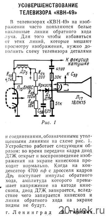 Телевизионный приёмник чёрно-белого изображения *КВН-49* выпускался с начала 1949 года. Известные заводы изготовители: Александровский радиозавод. Бакинский радиозавод. Воронежский завод *Электросигнал*. Киевский завод *Маяк*. Ленинградский завод *Россия*. Ленинградский НИИ телевидения. Московский радиозавод. Новгородский завод *Квант*. Одним из первых массовых серийных телевизоров был **КВН-49** разработанный в Ленинградском НИИ телевидения в 1947 году и выпущенный на его опытном заводе в 1948 году в количестве 20 штук. Сочетание **КВН** произошло от первых букв фамилий разработчиков: В.К.Кенигсона, Н.М.Варшавского и И.А.Николаевского, а цифровое дополнение **49** год начала производства. Очень трудно разобраться в буквах и цифрах после *49*, так как первые телевизоры именовались как *КВН-49* (Т-1) и *КВН-49* и *КВН-49-1*, были и модернизации *КВН-49-А* и *КВН-49-Б*. Первым будем считать всё же телевизор **КВН-49-1**, который представляет собой 16-ламповый приёмник прямого усиления. Применение такой схемы для канала изображения позволило достигнуть чёткости и устойчивости картинки, а также использование разноса между несущими частотами изображения и звука в качестве ПЧ звука уменьшило число радиоламп в приёмнике и снизило его стоимость. Телевизор **КВН-49-1** рассчитан на приём в любом из 3 каналов. Изображение размером 105х140 мм воспроизводится на экране кинескопа ЛК-715-А, который вскоре был заменён на 18ЛК1Б. Звук воспроизводится громкоговорителем 1ГД-1. Питание телевизора осуществляется от сети переменного тока: 110, 127 или 220 В. Потребляемая мощность 220 Вт. Телевизор выполнен в настольном оформлении с размерами 380х400х490 мм и весом 29 кг. В телевизоре 11 ручек управления, из них четыре основных выведены на переднюю стенку, это слева контрастность и громкость (нижняя), справа выключатель сети, объединённый с яркостью и фокусировкой (внизу), остальные 7 ручек расположены справа, на боковой стенке. На задней стенке расположены: клеммы антенны, переключатель программ, колодка переключения сети и предохранитель. Чувствительность телевизора по каналам изображения и звукового сопровождения 800...1000 мкВ. Разрешающая способность изображения 350...400 линий. При окончании передач телевизор автоматически отключался от сети. Небольшая серия телевизоров до 1951 года имела возможность приёма программ в 2-х стандартах 441 и 625 строк. Статья Радио №5/1964, ст.53 Радио №12/1964, ст.28