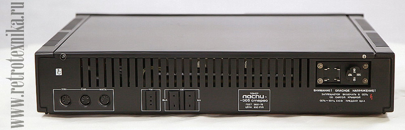 Тюнер и полный усилитель *Ласпи-005-стерео* с 1981 года малосерийно выпускал Севастопольский радиозавод имени Калмыкова. Тюнер работает в диапазонах ДВ, СВ-1 571-300 м, СВ-2 300...186 м, четырёх КВ 49, 41, 31, 25 м и УКВ. Тюнер имеет фиксированную настройку на семь радиостанций, цифровую индикацию частоты приёма, световую индикацию наличия стереопередачи, индикаторы многолучевого приёма, точной настройки и напряженности поля. Усилитель ЗЧ предназначен для высококачественного усиления сигналов с тюнера, электропроигрывателя, магнитофона и других источников звуковых сигналов. Аппарат имеет регулятор ширины стереобазы, индикатор перегрузки, пятиполосный регулятор тембра. К усилителю можно подключить два магнитофона, две пары стереофонических телефонов или четыре АС. Чувствительность при приёме на штыревую антенну в диапазонах АМ - 50 мкВ, ЧМ - 2 мкВ. Селективность по зеркальному каналу в диапазоне: ДВ, СВ, KB 60 дБ. УКВ - 80 дБ. Диапазон частот тракта: AM - 40...7100 Гц. ЧМ - 16...16000 Гц, усилителя 20...20000 Гц. Коэффициент гармоник усилителя - 0,2 %. Коэффициент искажений 0,3 %. Переходное затухание между каналами 30 дБ. Номинальная выходная мощность (8 Ом) - 2х25 Вт. Потребляемая мощность от сети около 270 Вт. Габариты тюнера 460 х 320 х 80 мм, усилителя - 460 х 393 х 88 мм. Вес тюнера 7 кг, усилителя 12 кг. Одновременно завод выпускал тюнеры *Ласпи-006-стерео* и *Ласпи-008-стерео*. Первый отличался от базового электронными индикаторами, вместо стрелочных, а второй аналогичен модели *Ласпи-006-стерео* но со светлой передней панелью из алюминия, вместо литой панели чёрного цвета.
