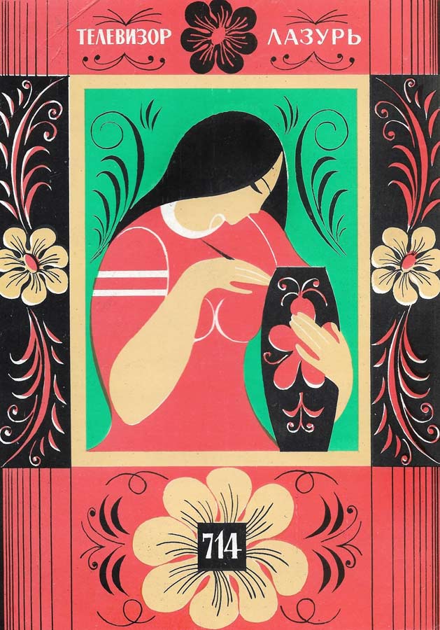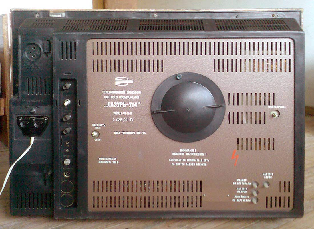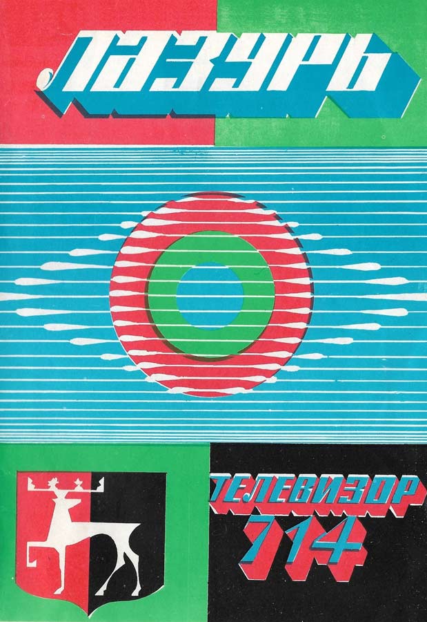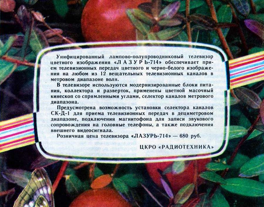 Телевизионный приёмник цветного изображения *Лазурь-714* с 1976 года выпускал Сормовский телевизионный завод *Лазурь*. **Лазурь-714** (УЛПЦТ-61-II-11) унифицированный лампово-полупроводниковый цветной телевизор 2 класса на кинескопе 61ЛК3Ц. Телевизор обеспечивает приём телевизионных передач ч/б и цветного изображения на любом из 12 каналов МВ диапазона, а при установке селектора СК-Д-1 и на любом канале ДМВ диапазона. В модели предусмотрены: включение магнитофона на запись звукового сопровождения; прослушивание звука на головные телефоны с выключением АС. Имеется система АРУ и АПЧГ. Размер изображения 362 x 482 мм. Чувствительность ТВ - 50 мкВ. Разрешающая способность 450 линий. Выходная мощность канала звука 2,3 Вт. Диапазон частот - 80...12500 Гц. Потребляемая мощность 250 Вт. Габариты телевизора 550 x 773 x 540 мм. Вес 60 кг. С 1977 года Горьковский телевизионный завод имени Ленина начал выпуск телевизора *Чайка-714*, аналогичному по оформлению, схеме и конструкции описанному.
